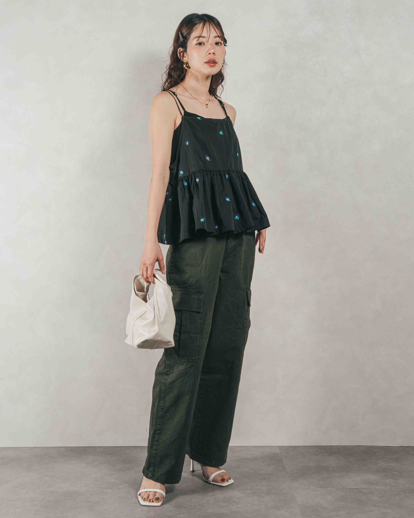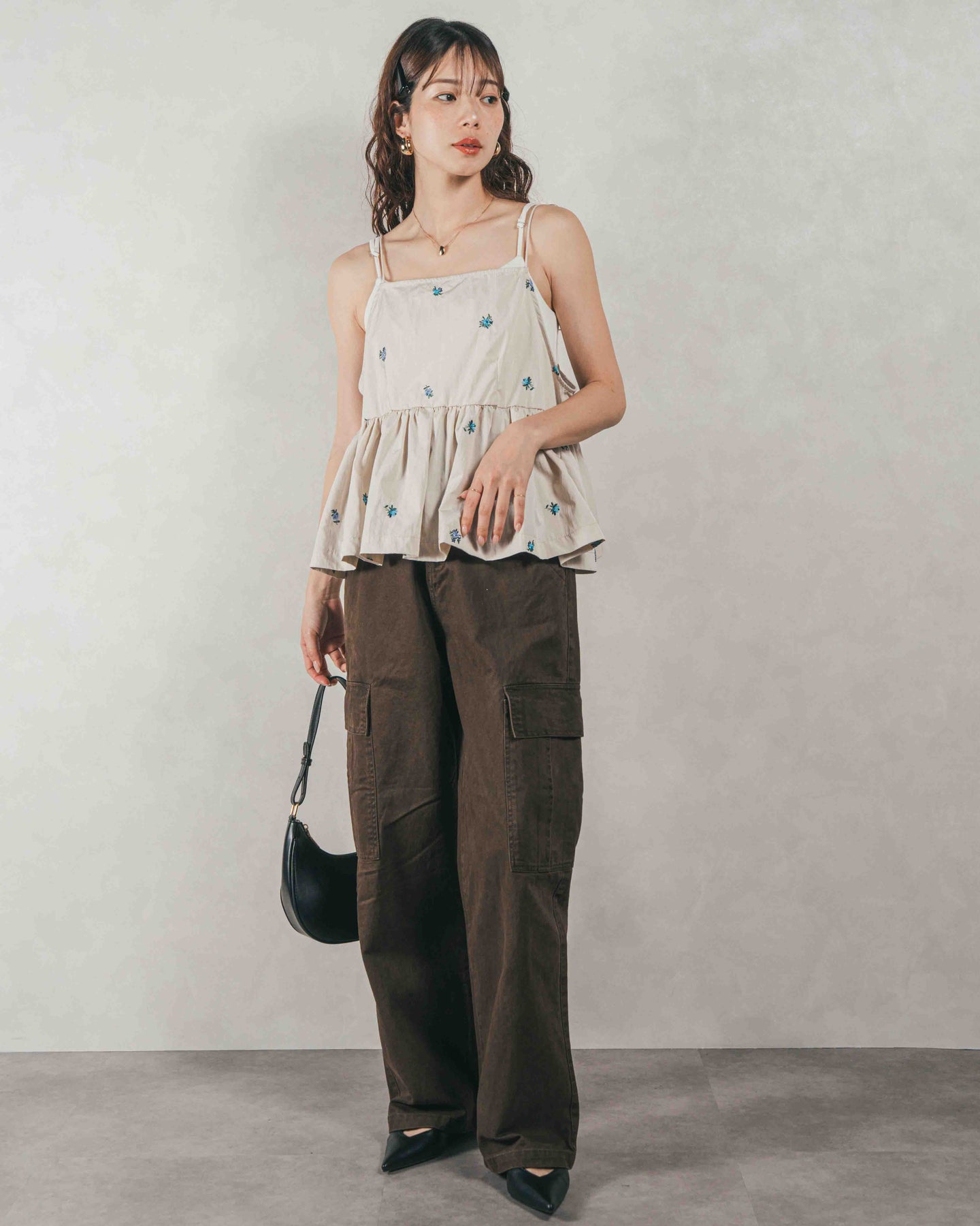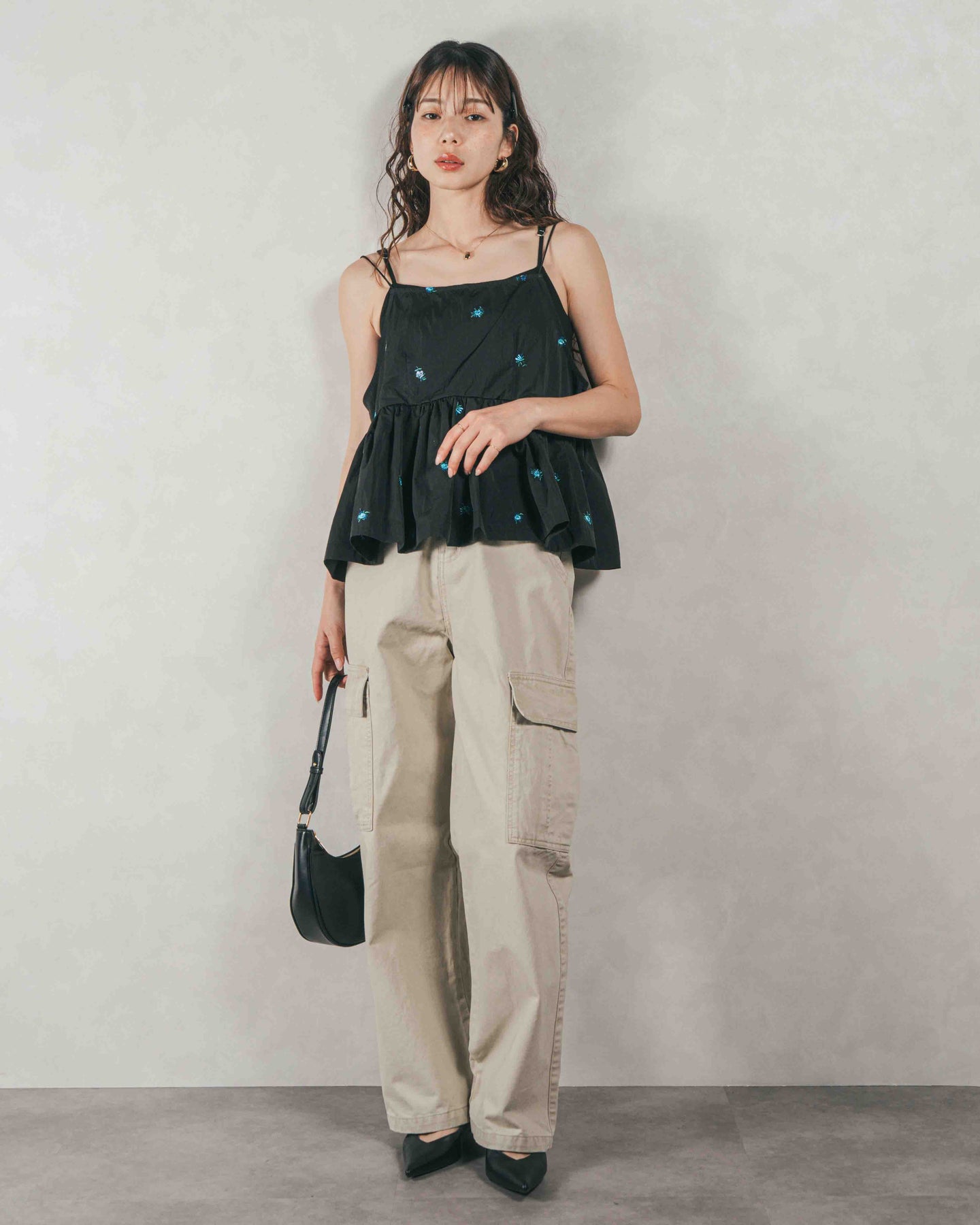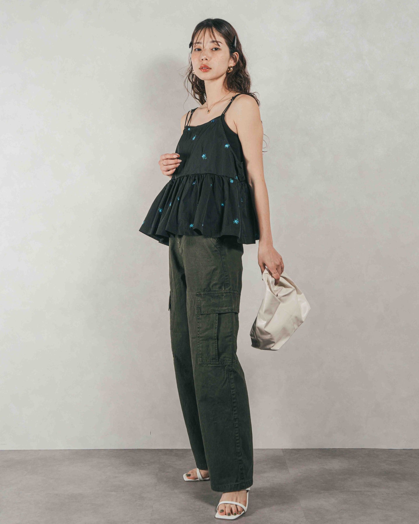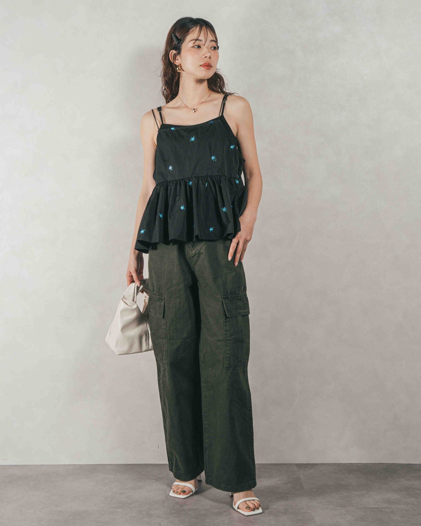 [SET]Flower刺繍 ボリュームキャミ + ピグメントツイルカーゴパンツ(2SET)