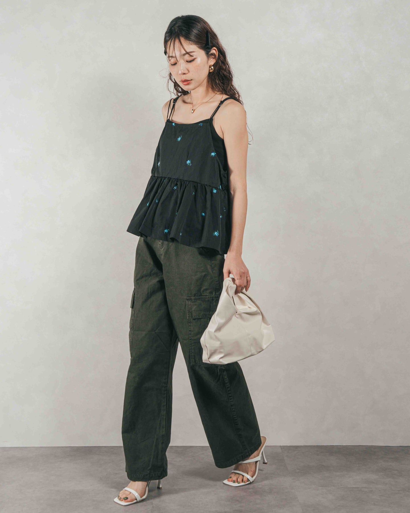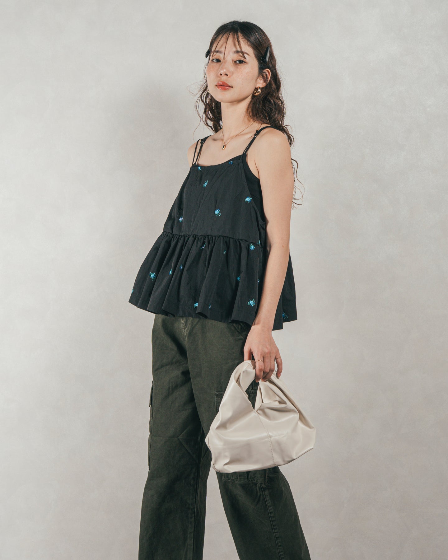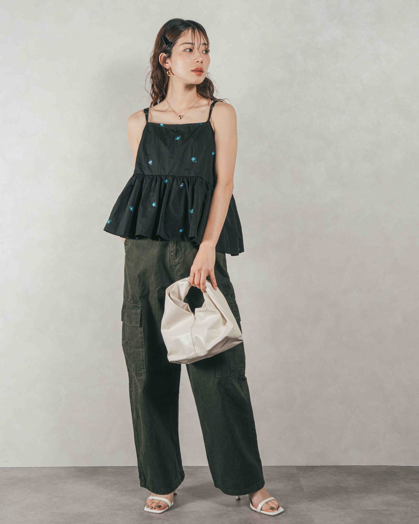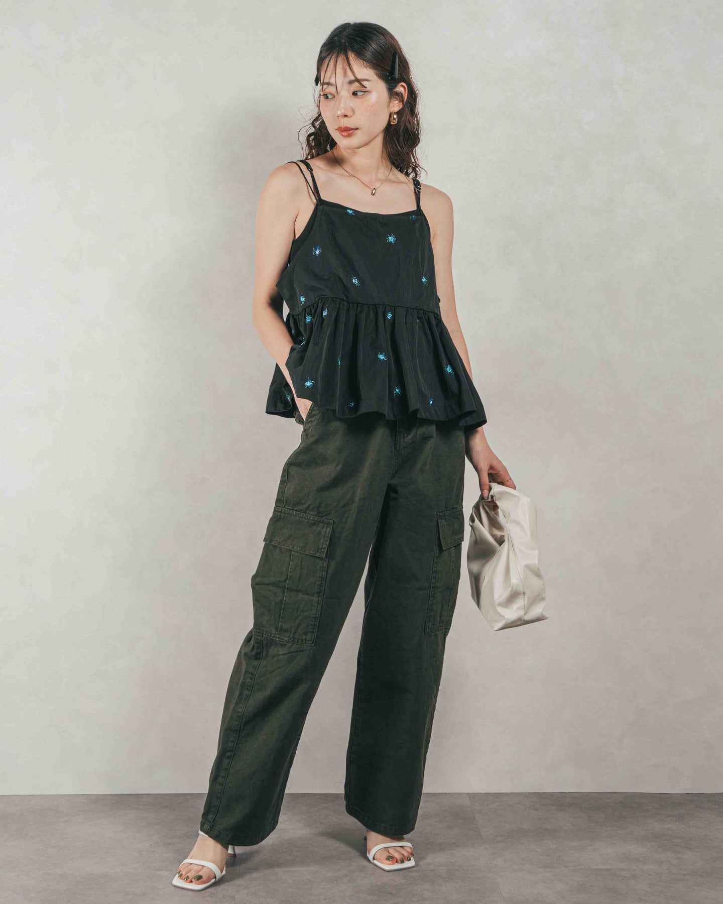[SET]Flower刺繍 ボリュームキャミ + ピグメントツイルカーゴパンツ(2SET)