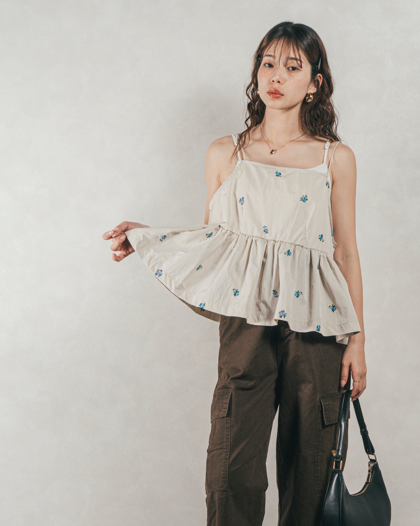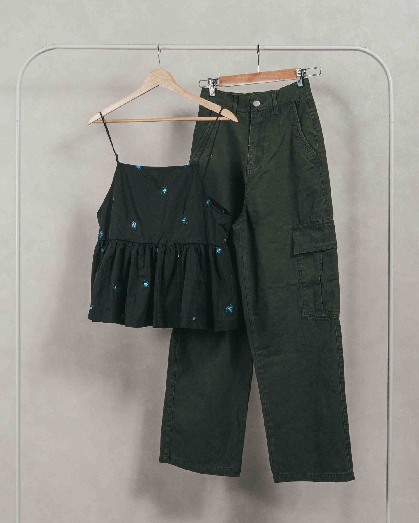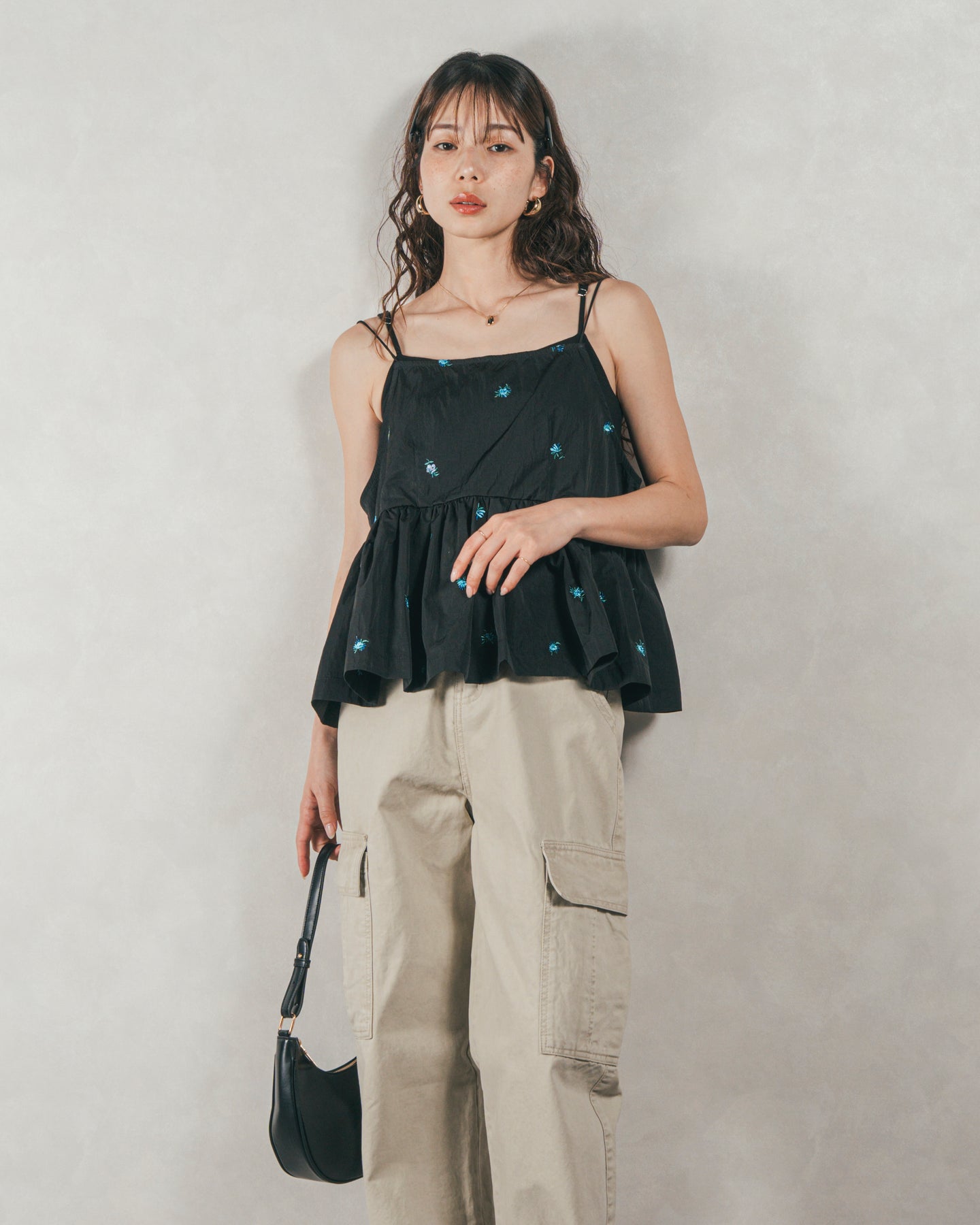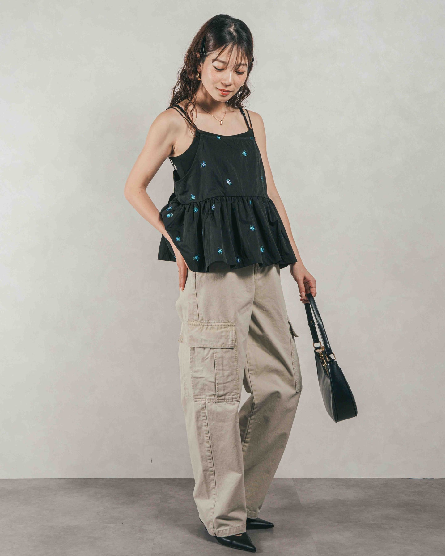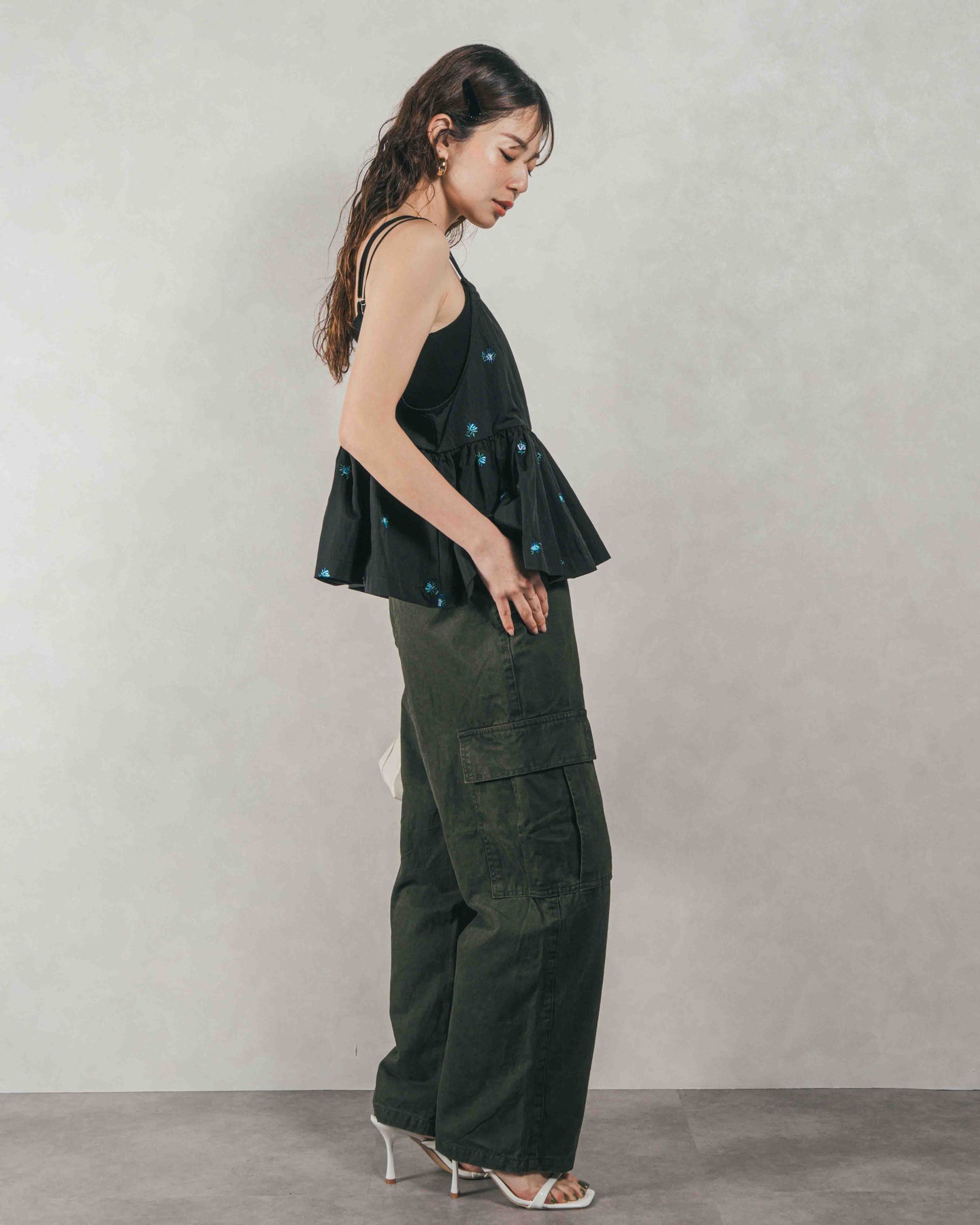 [SET]Flower刺繍 ボリュームキャミ + ピグメントツイルカーゴパンツ(2SET)