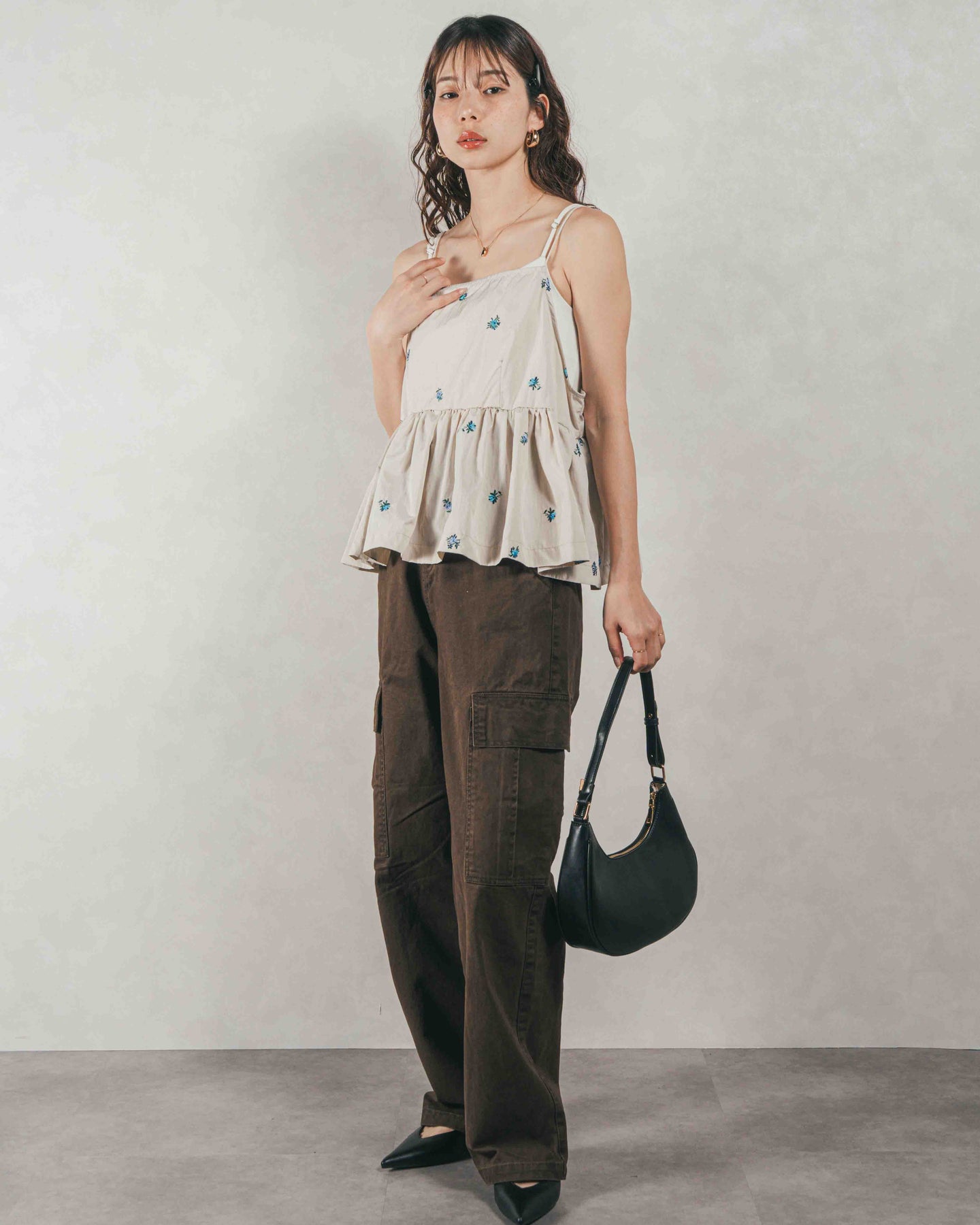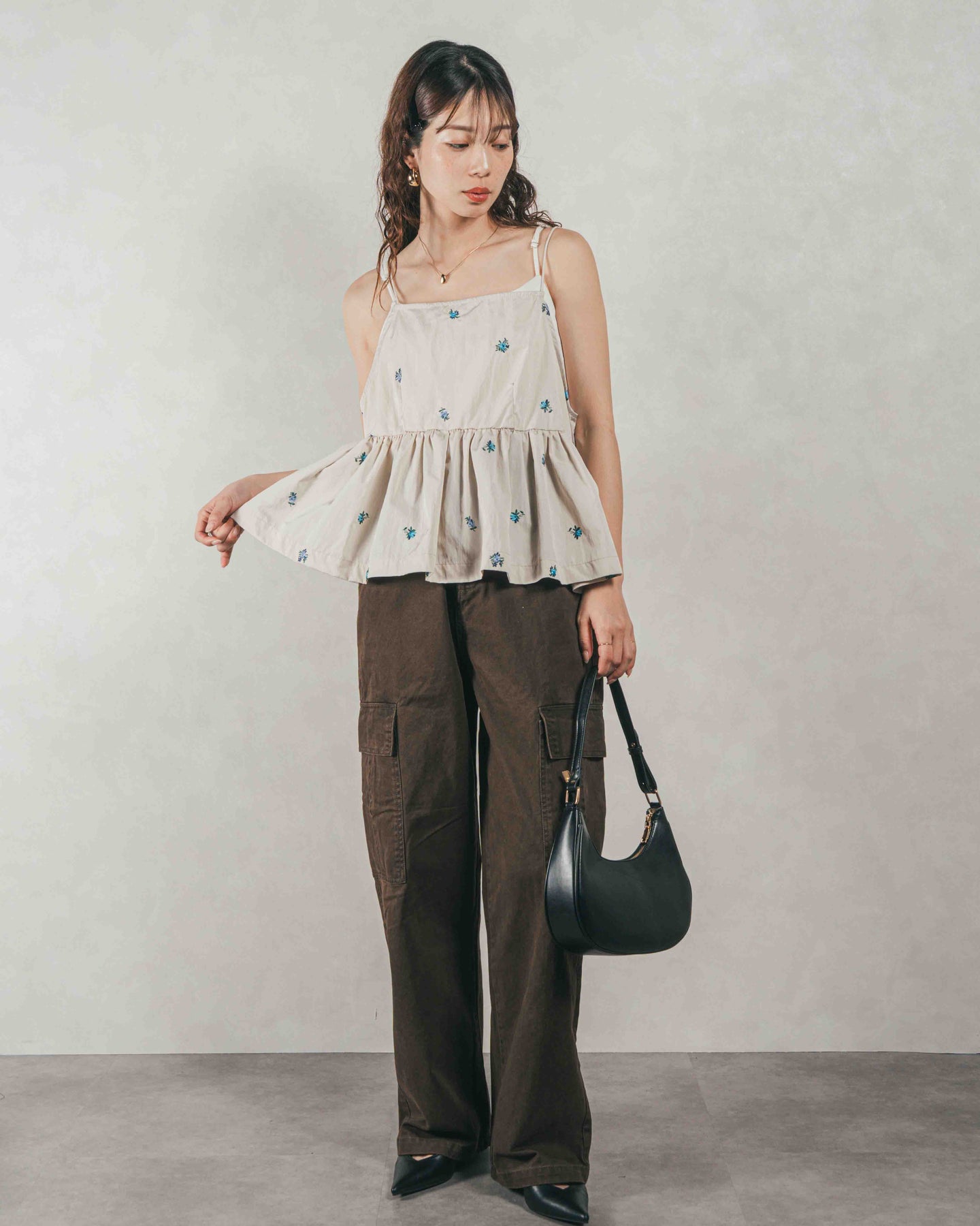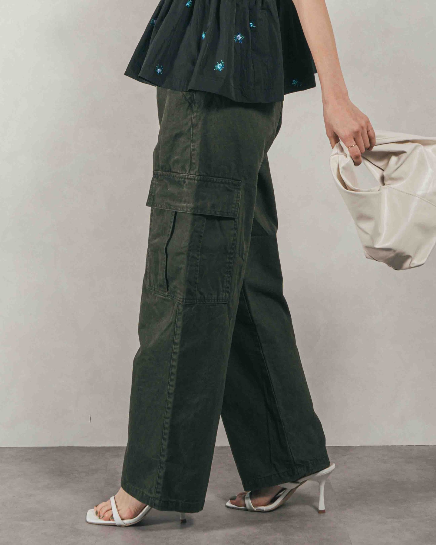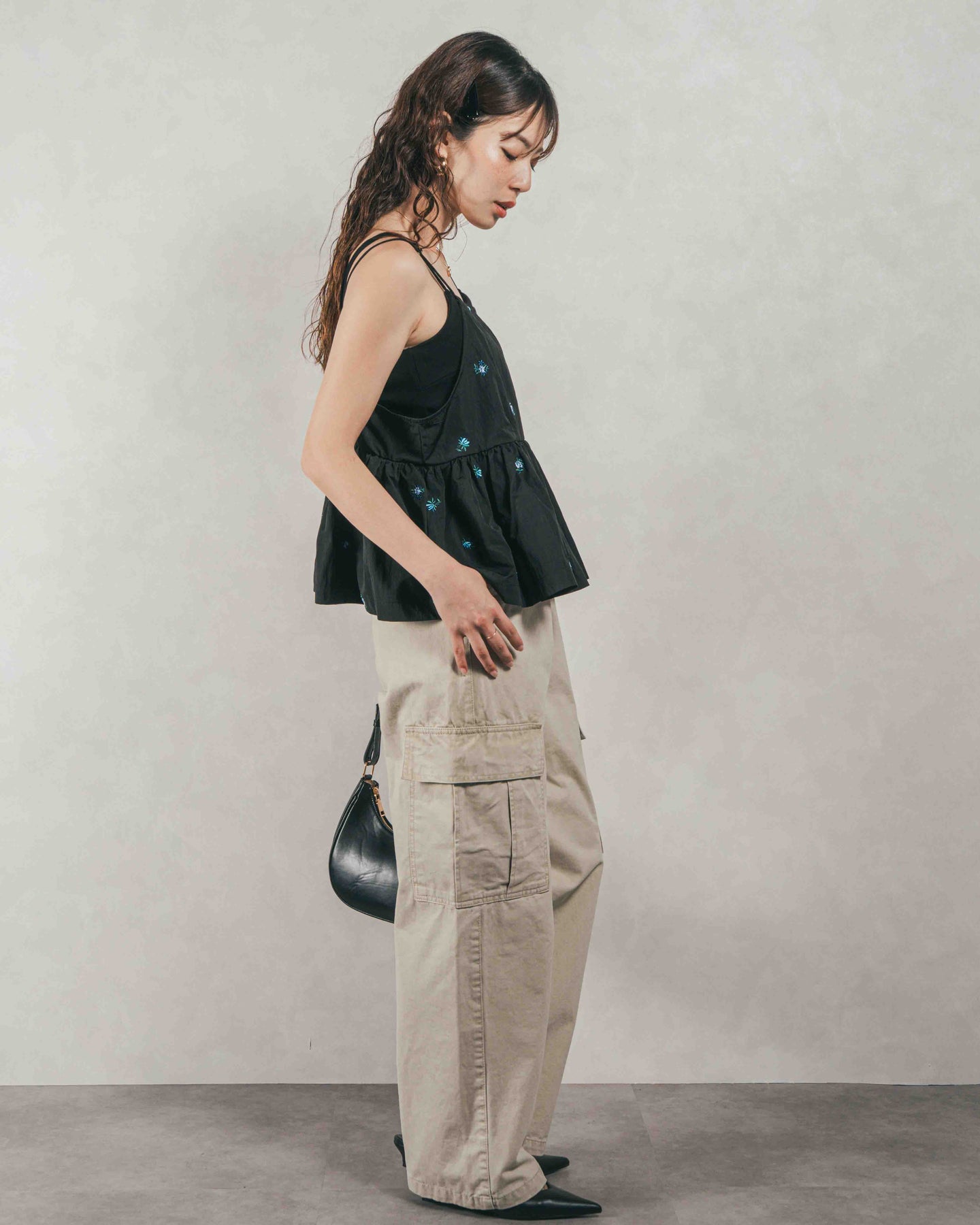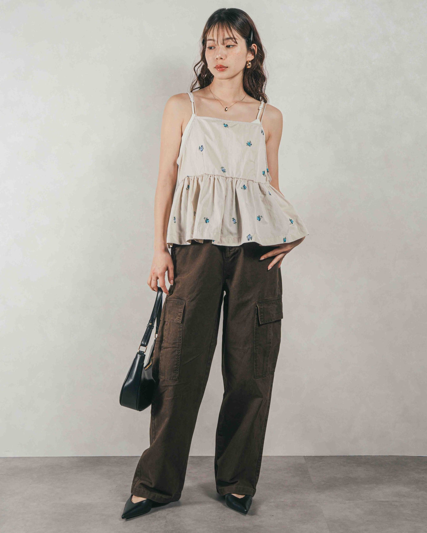 [SET]Flower刺繍 ボリュームキャミ + ピグメントツイルカーゴパンツ(2SET)