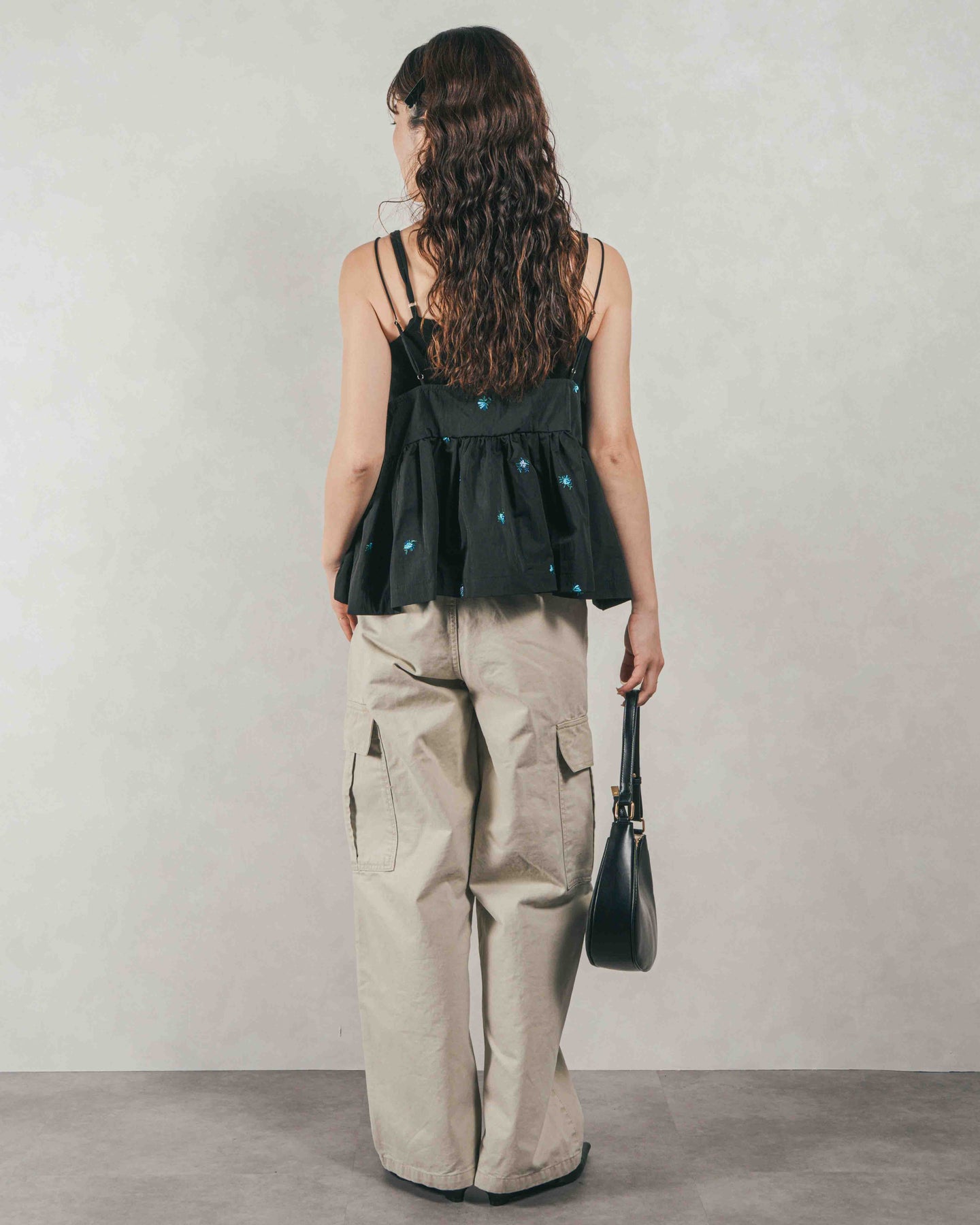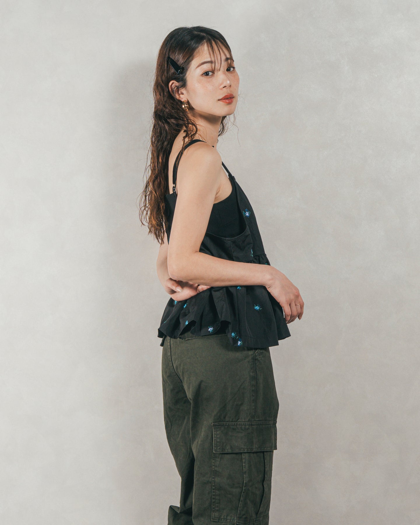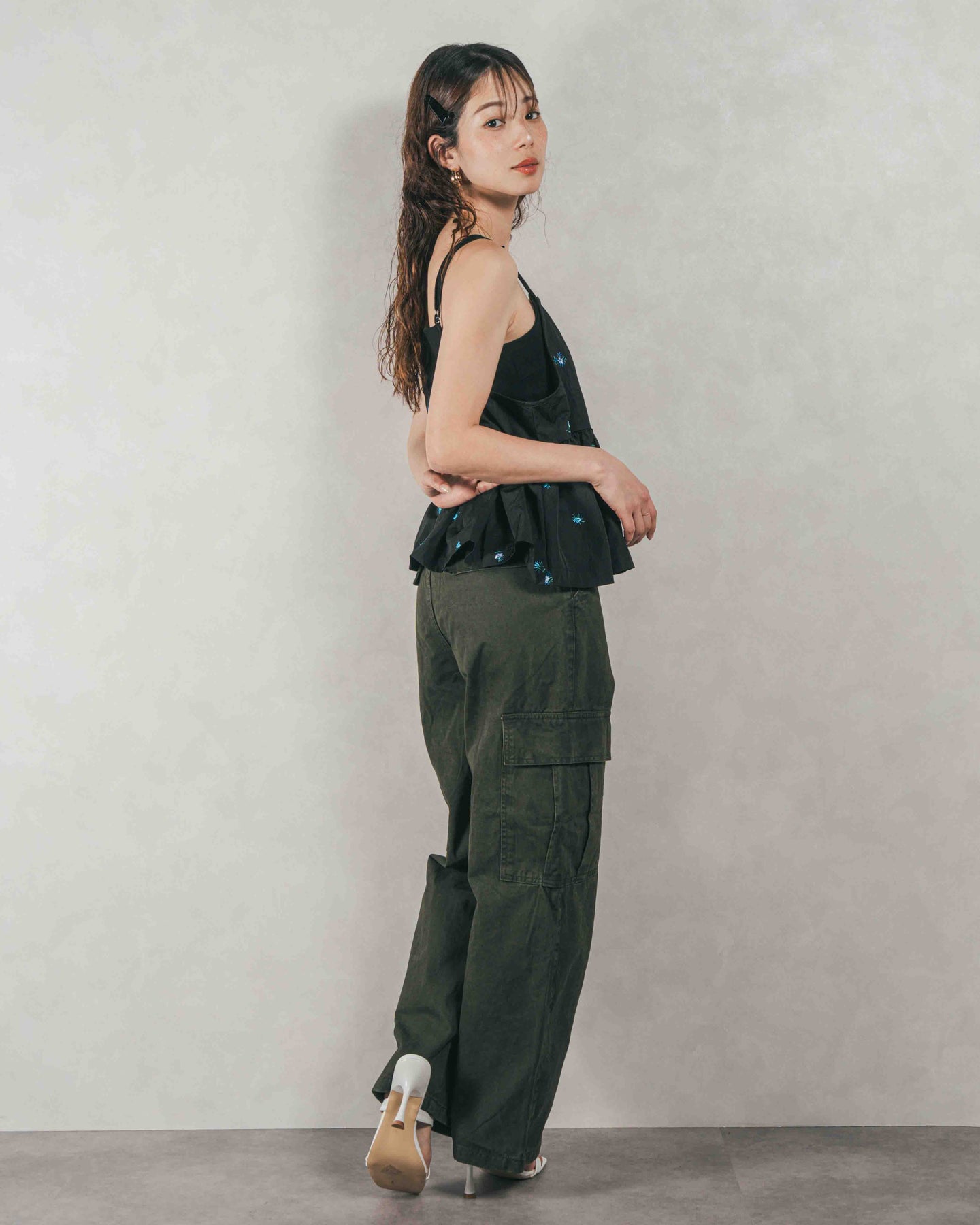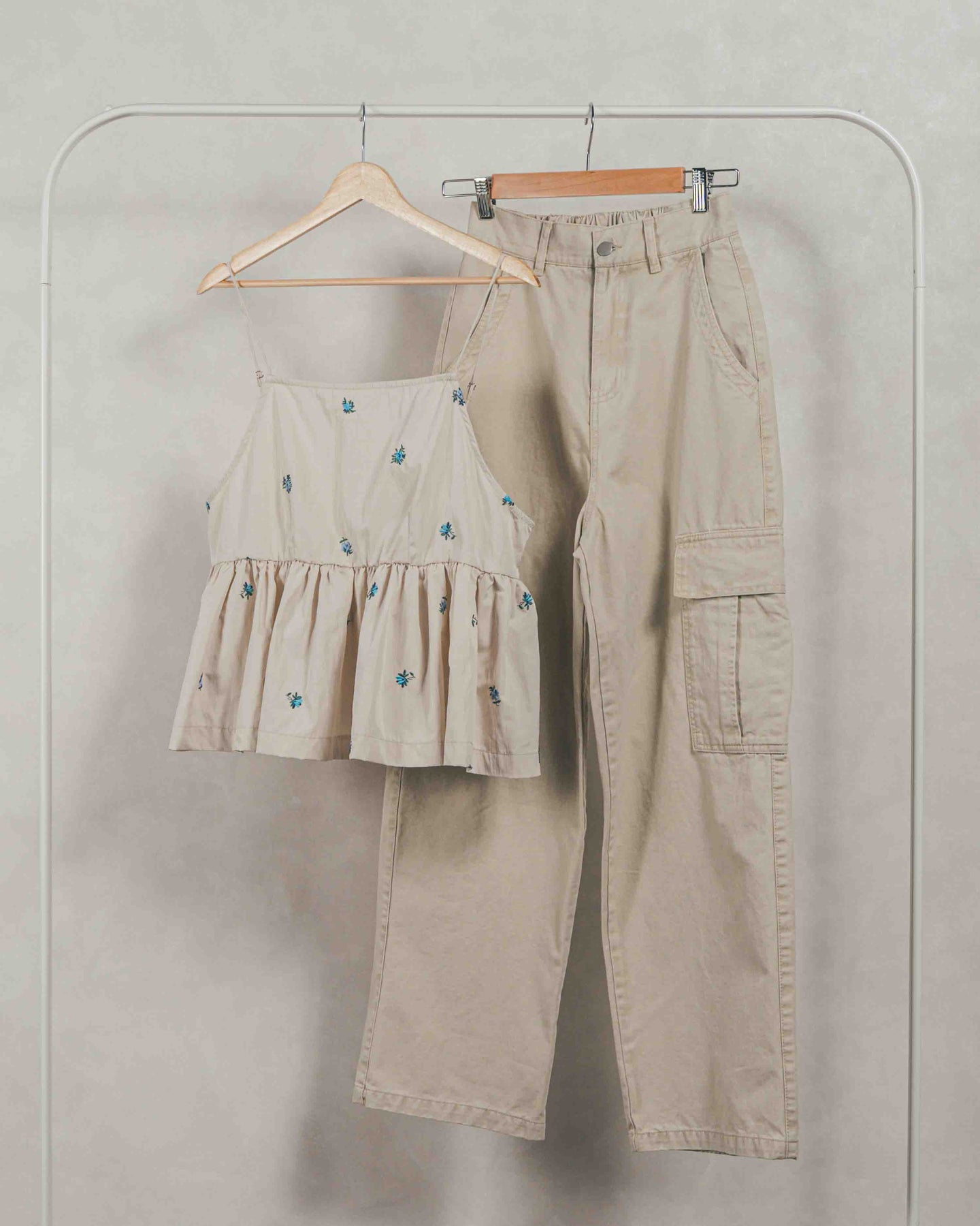 [SET]Flower刺繍 ボリュームキャミ + ピグメントツイルカーゴパンツ(2SET)