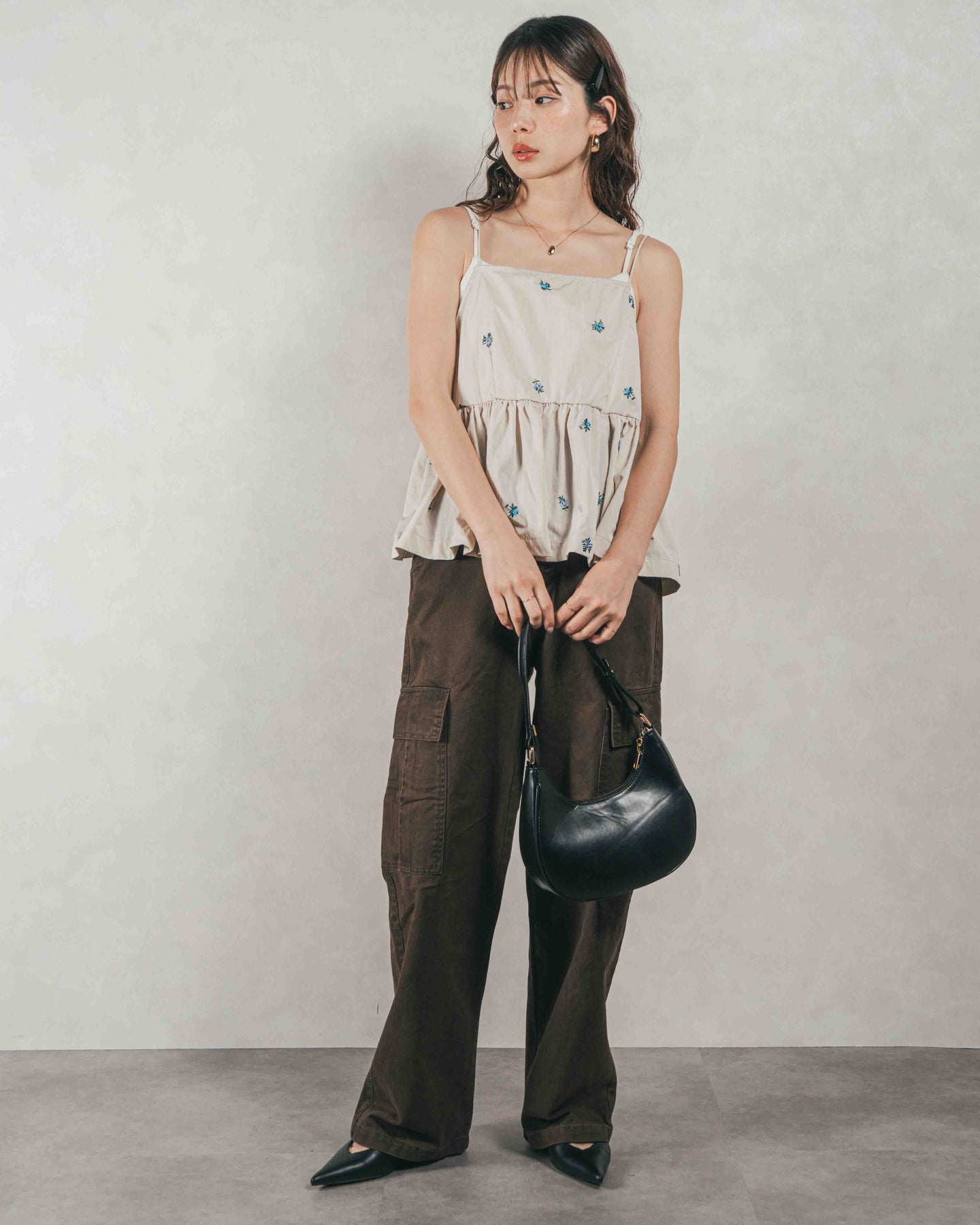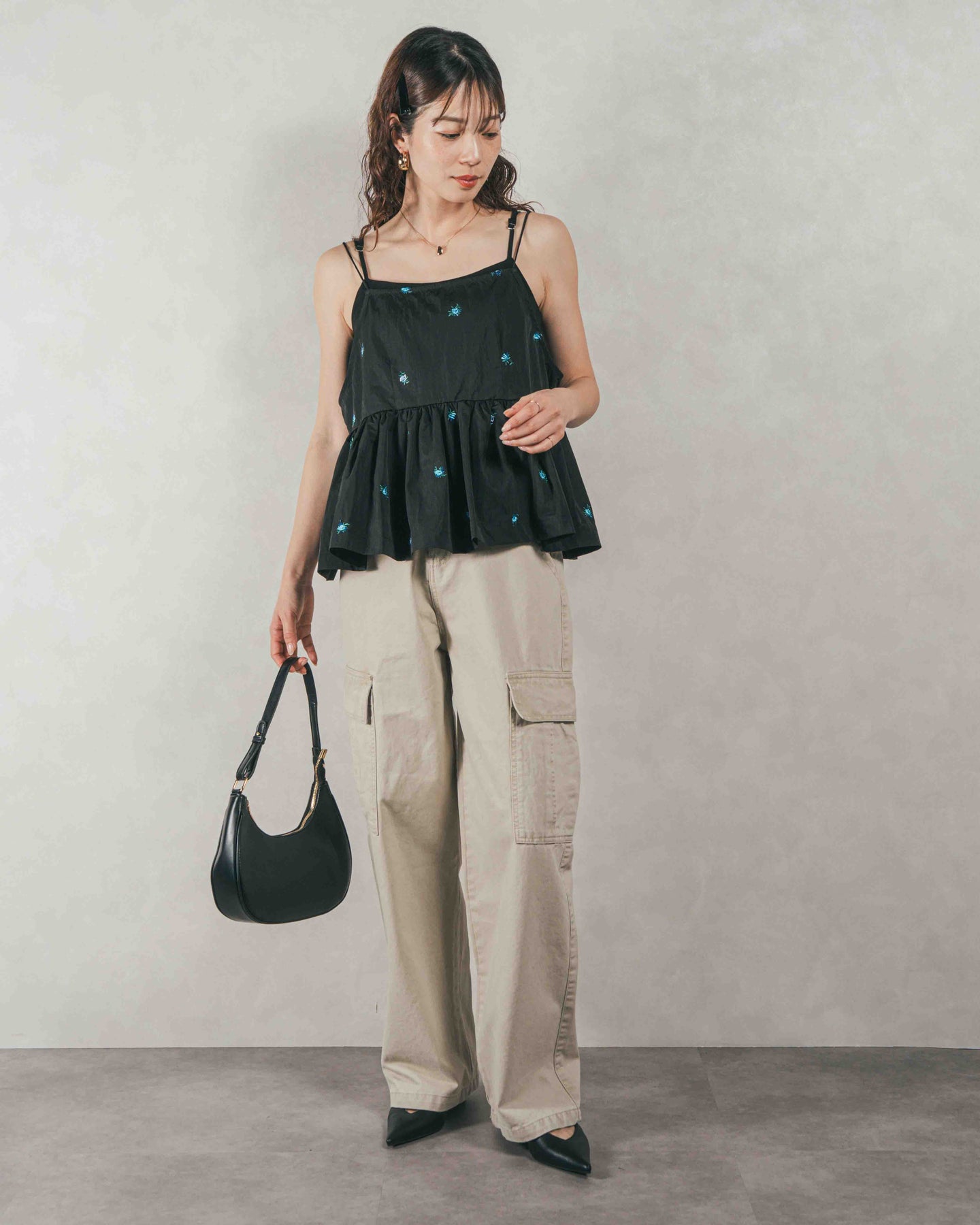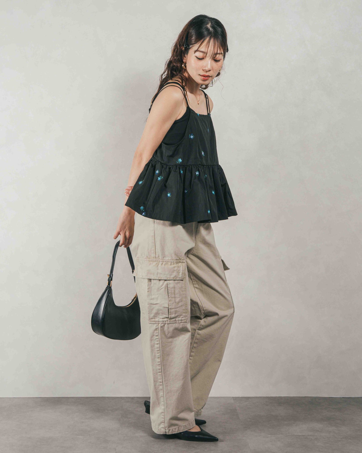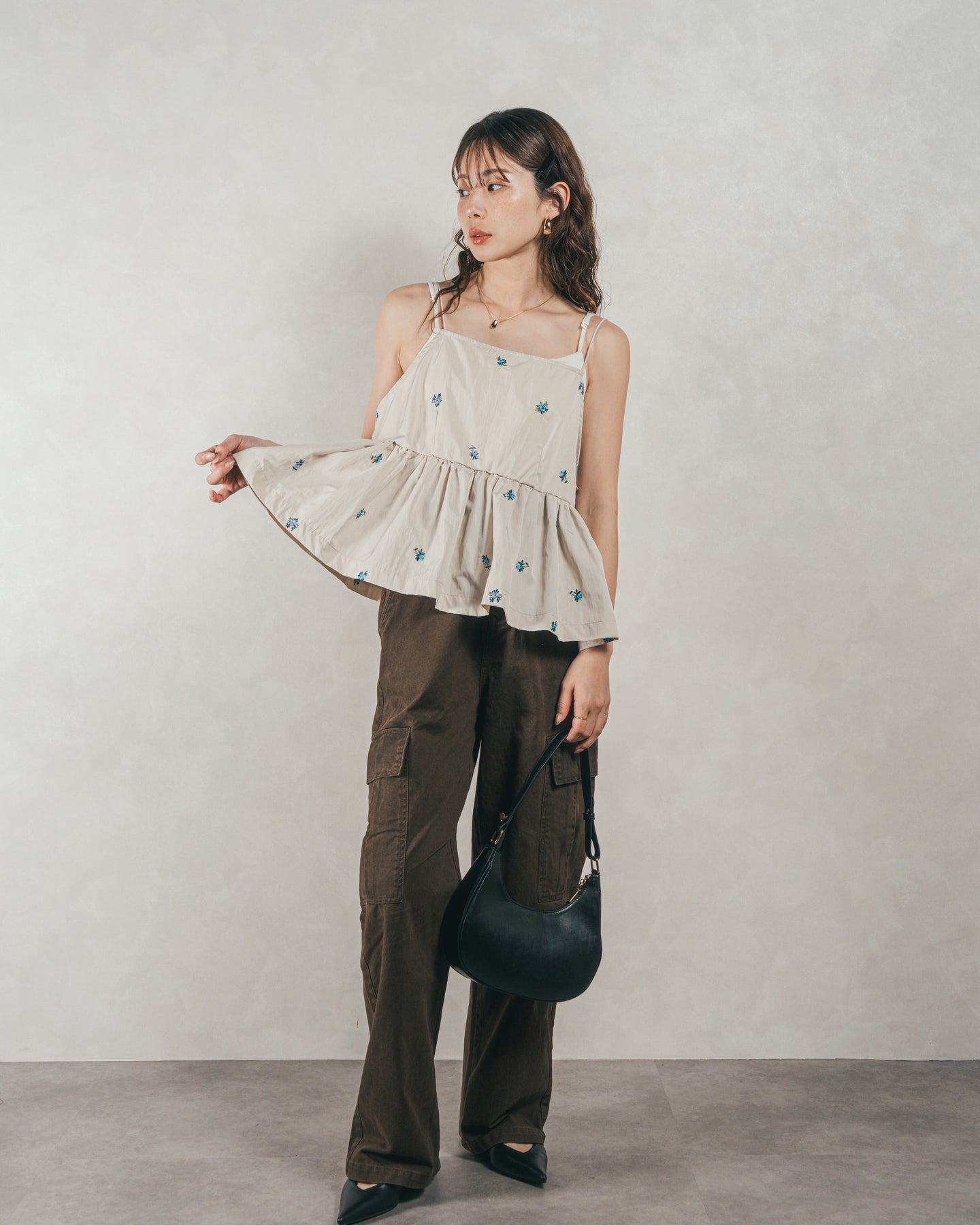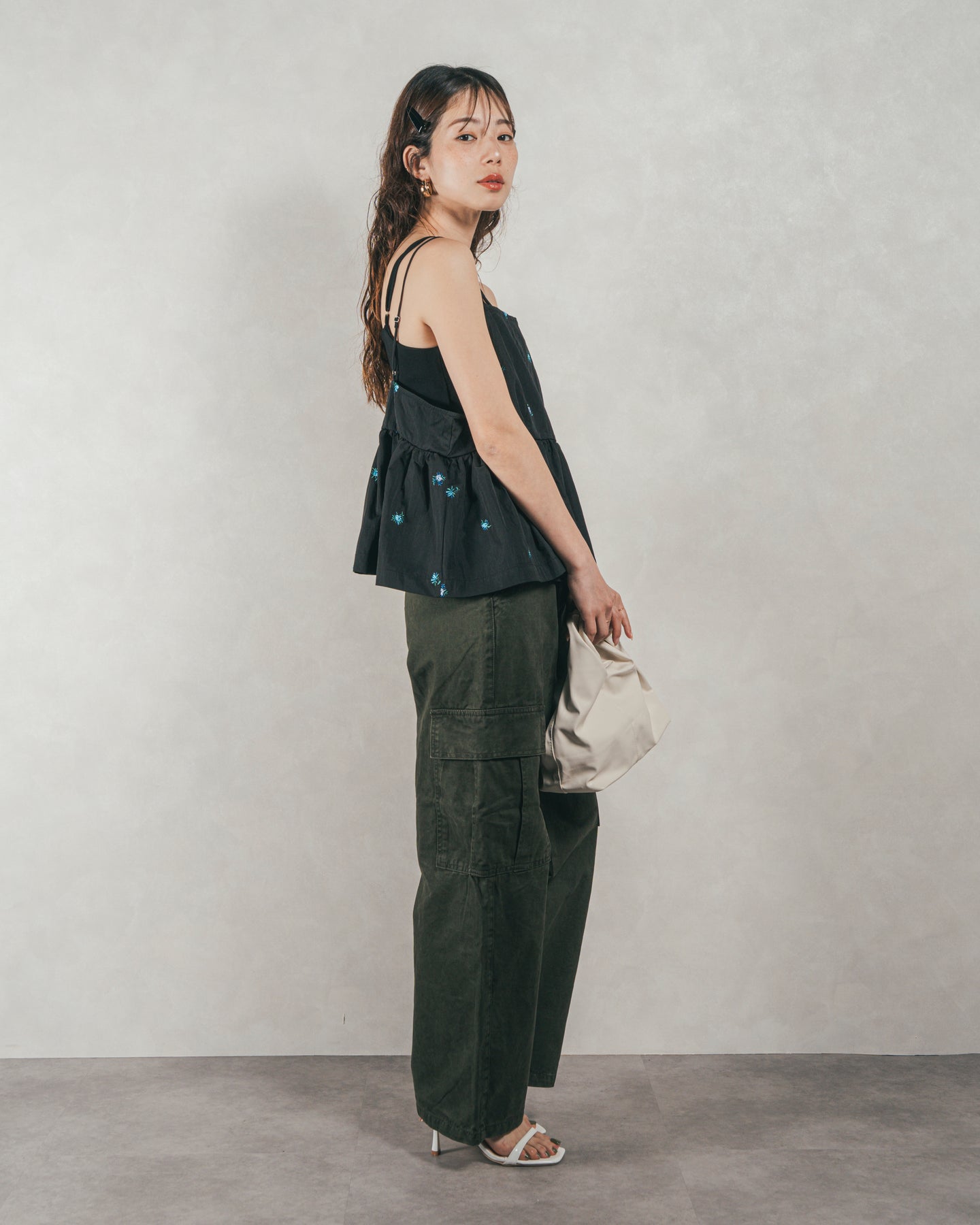 [SET]Flower刺繍 ボリュームキャミ + ピグメントツイルカーゴパンツ(2SET)