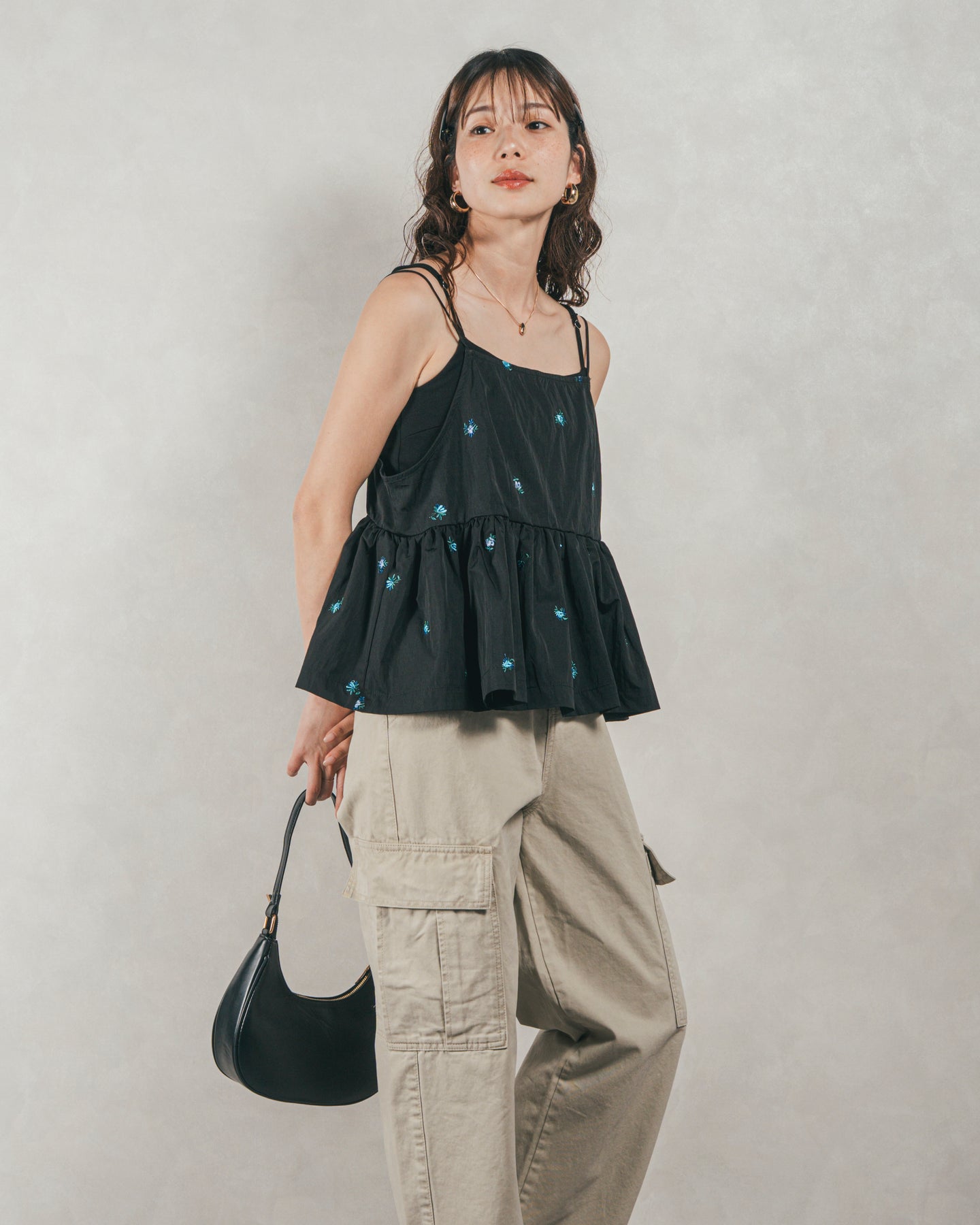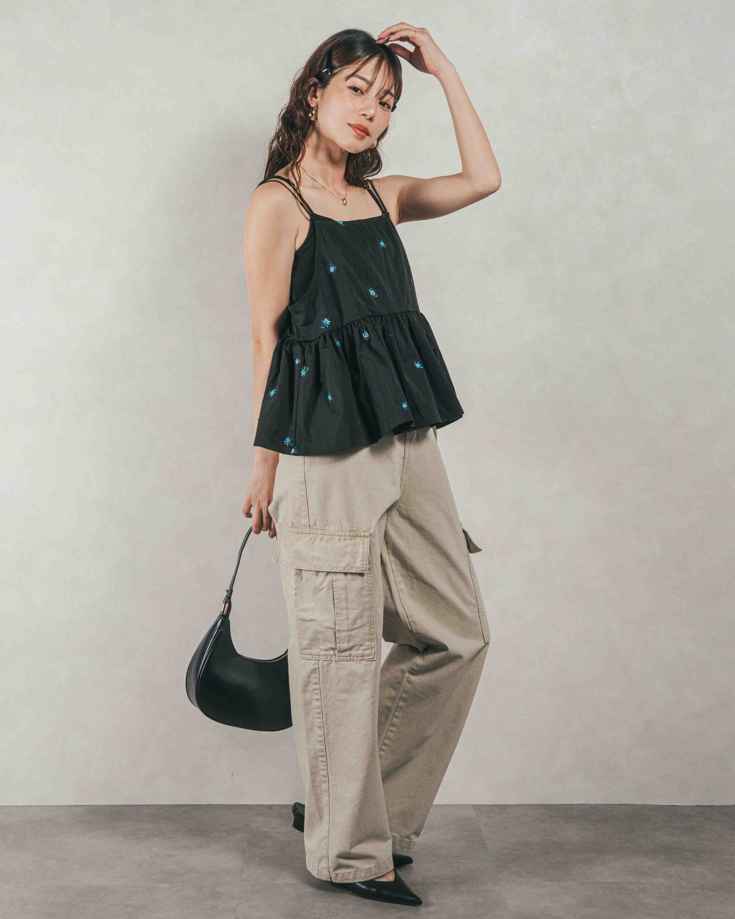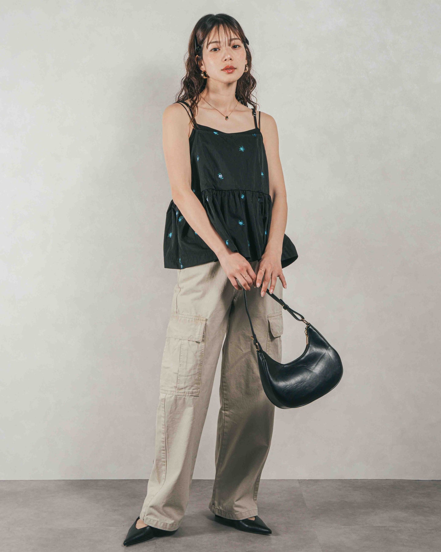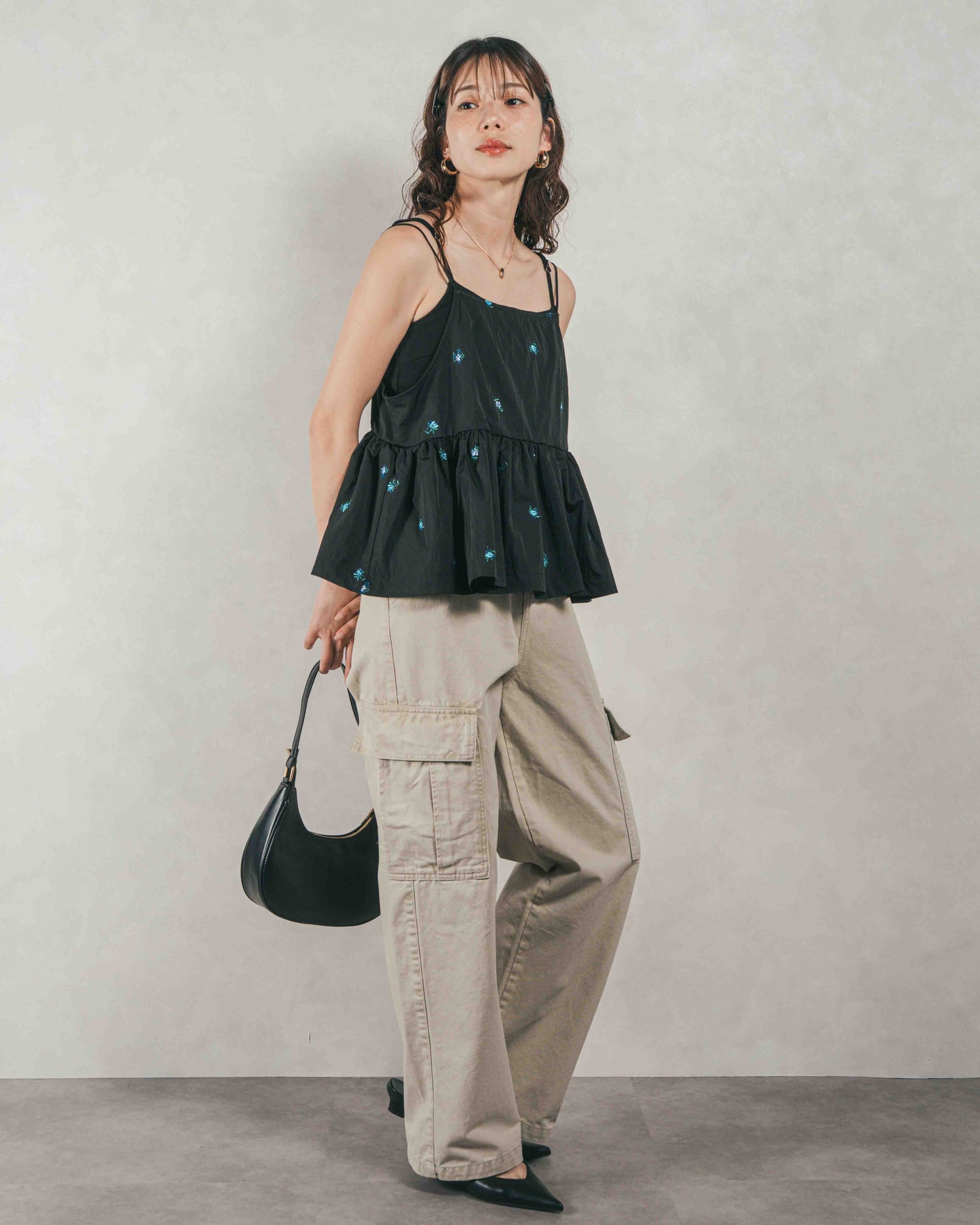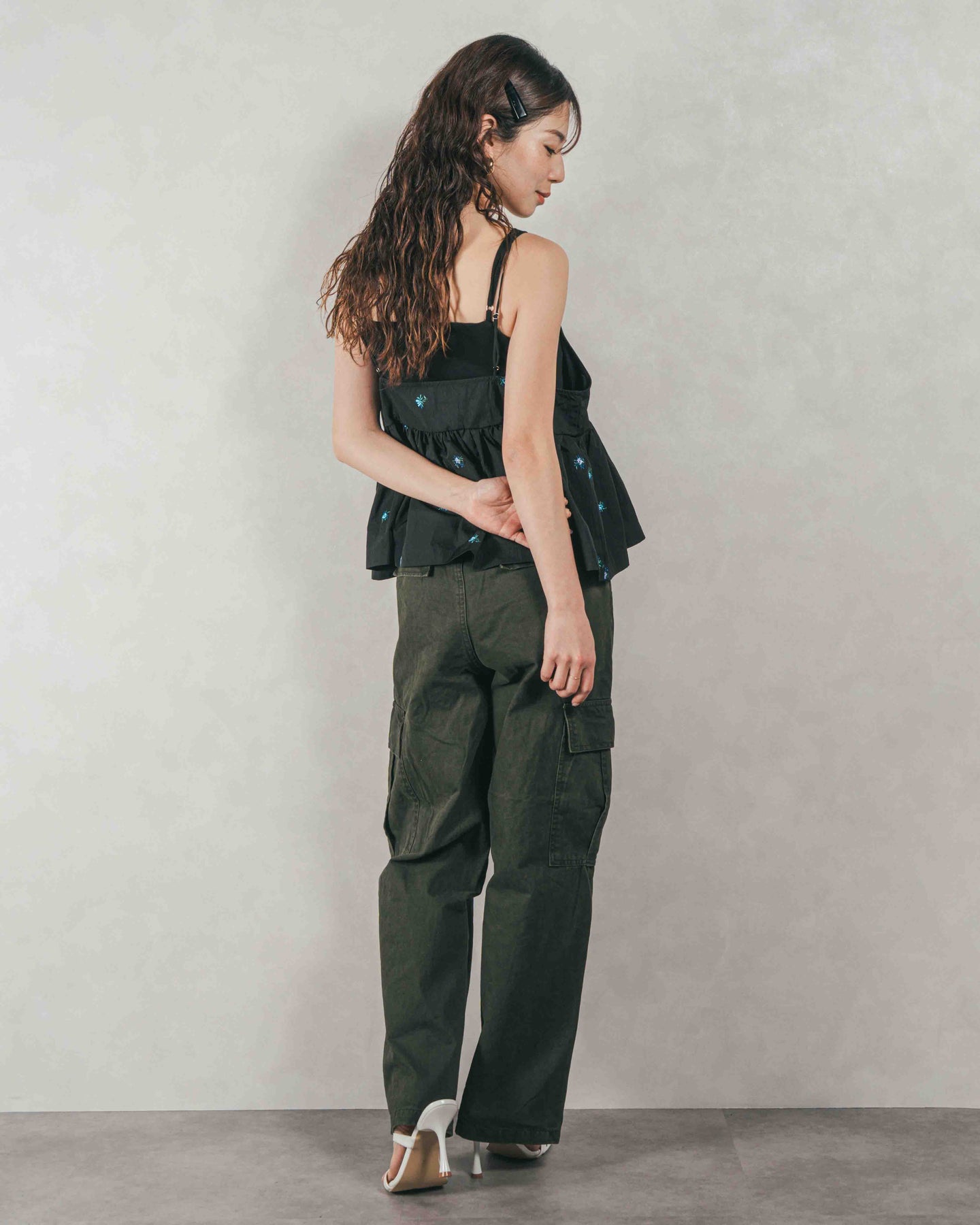 [SET]Flower刺繍 ボリュームキャミ + ピグメントツイルカーゴパンツ(2SET)