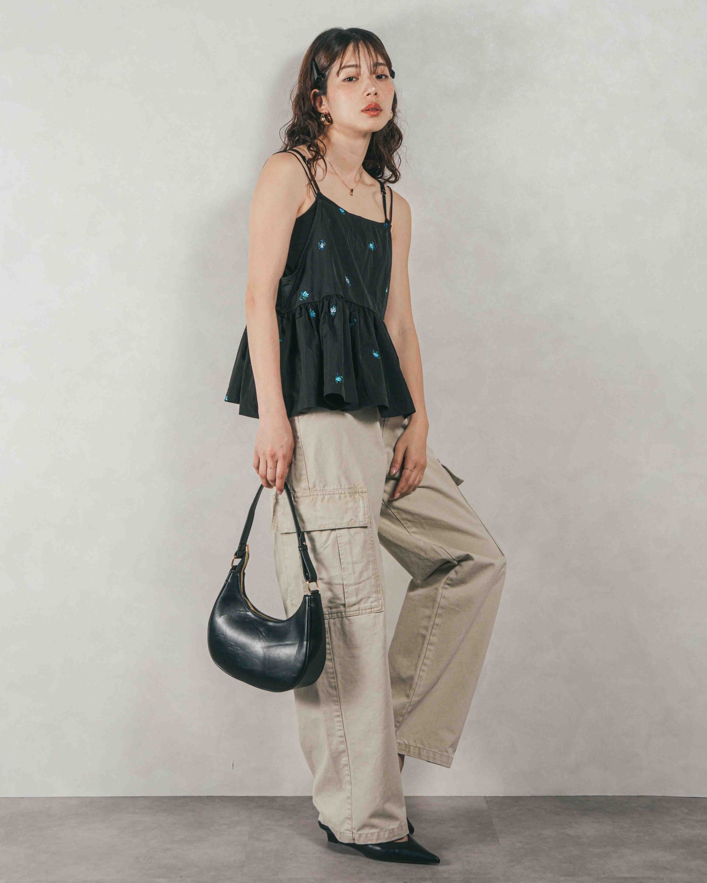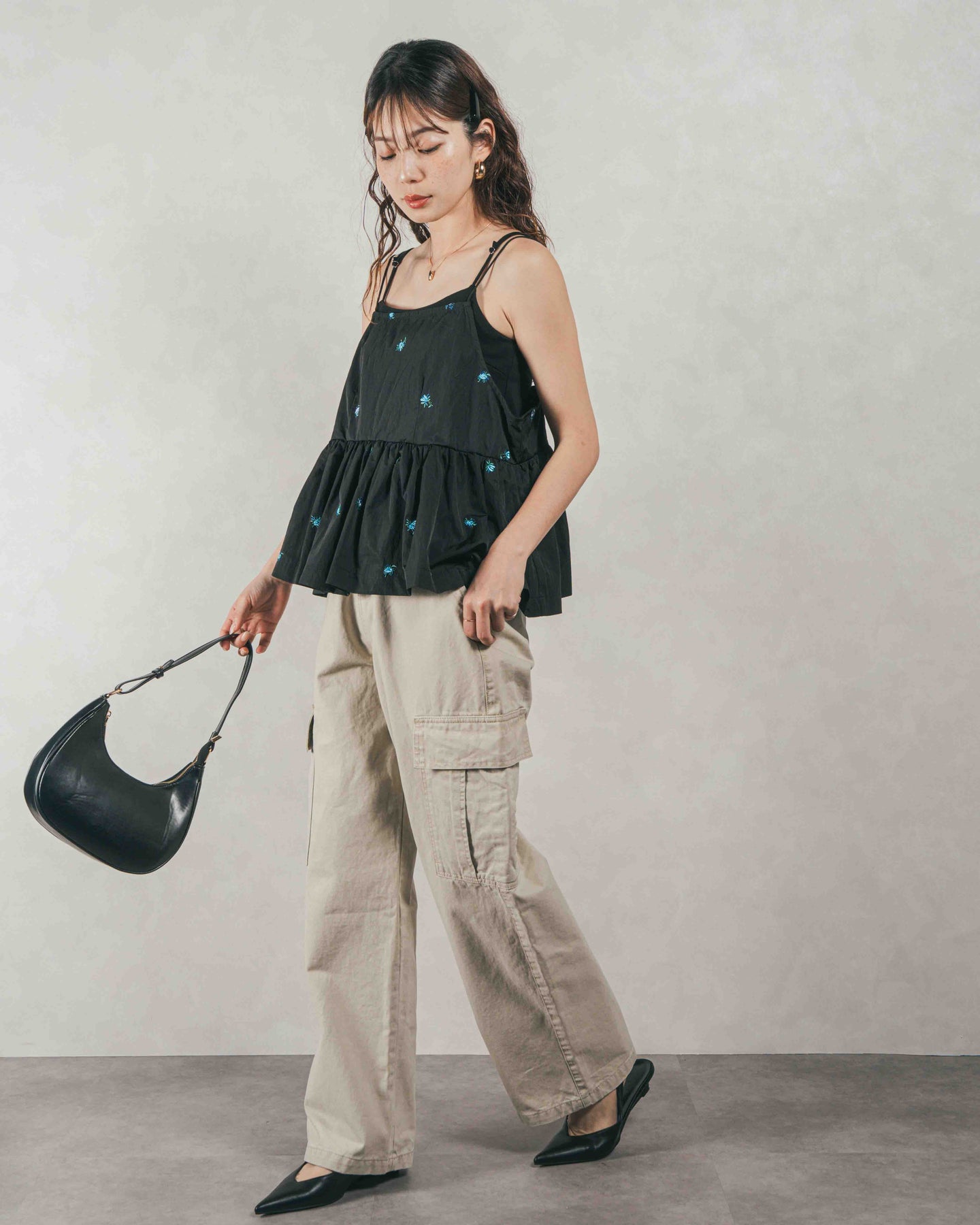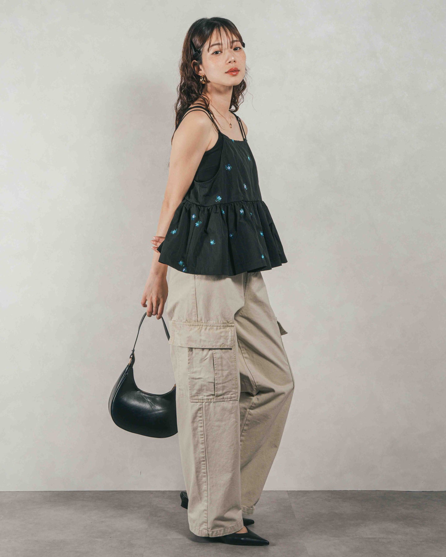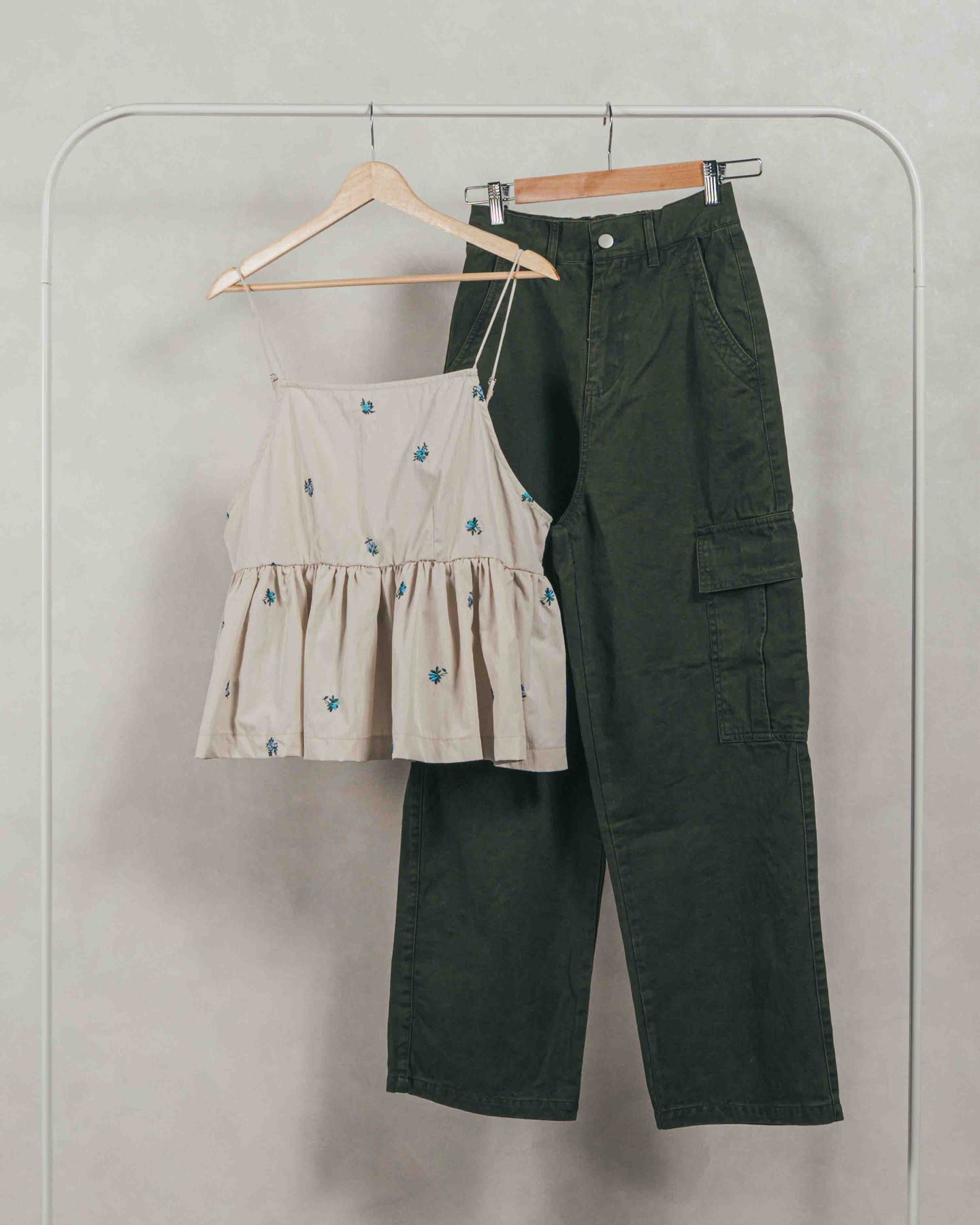 [SET]Flower刺繍 ボリュームキャミ + ピグメントツイルカーゴパンツ(2SET)