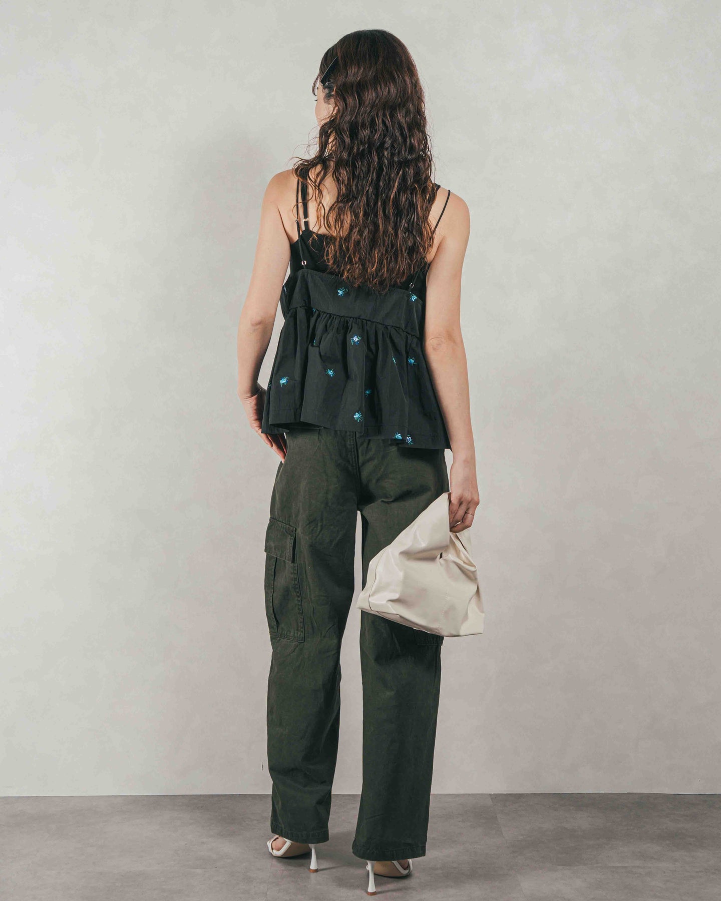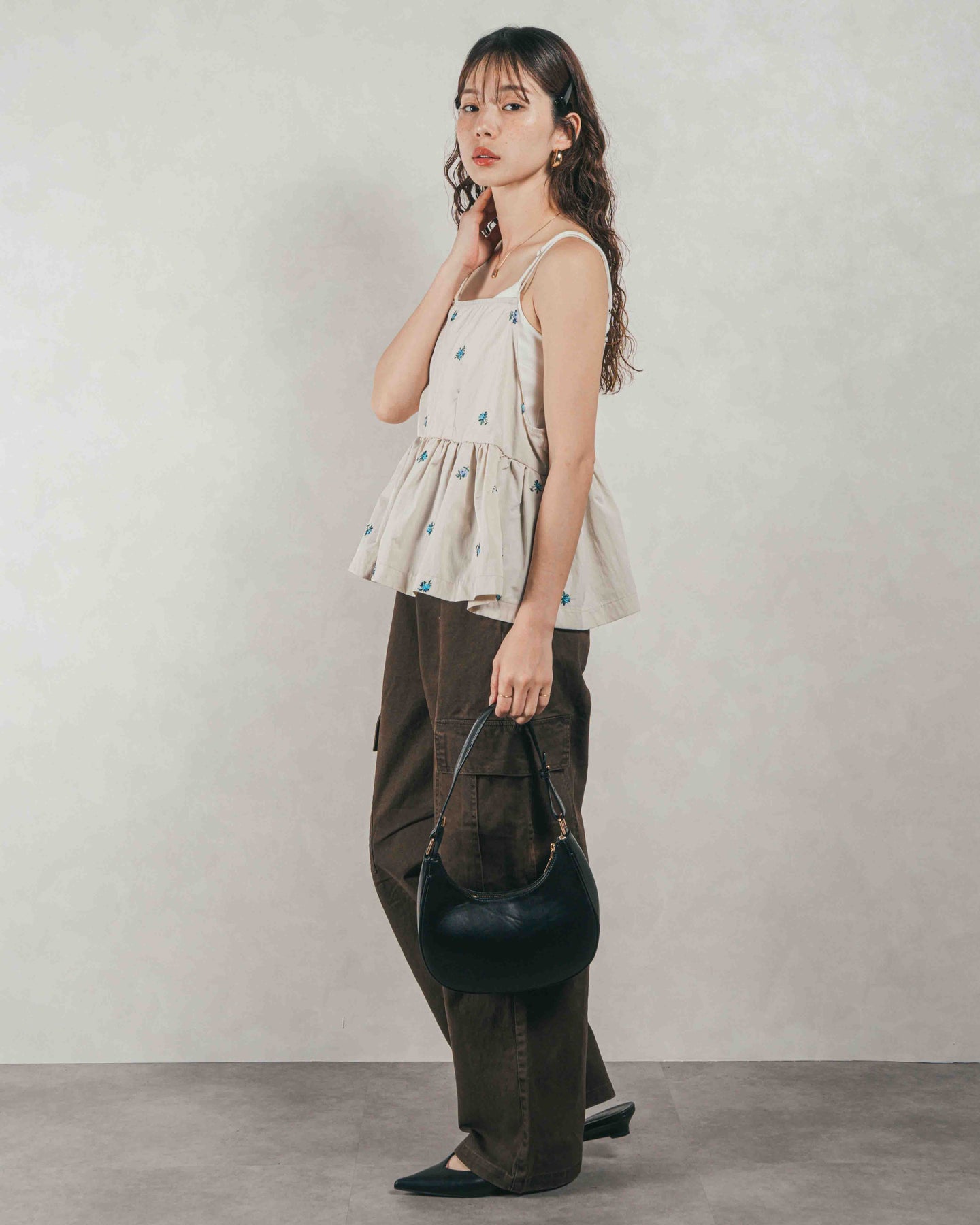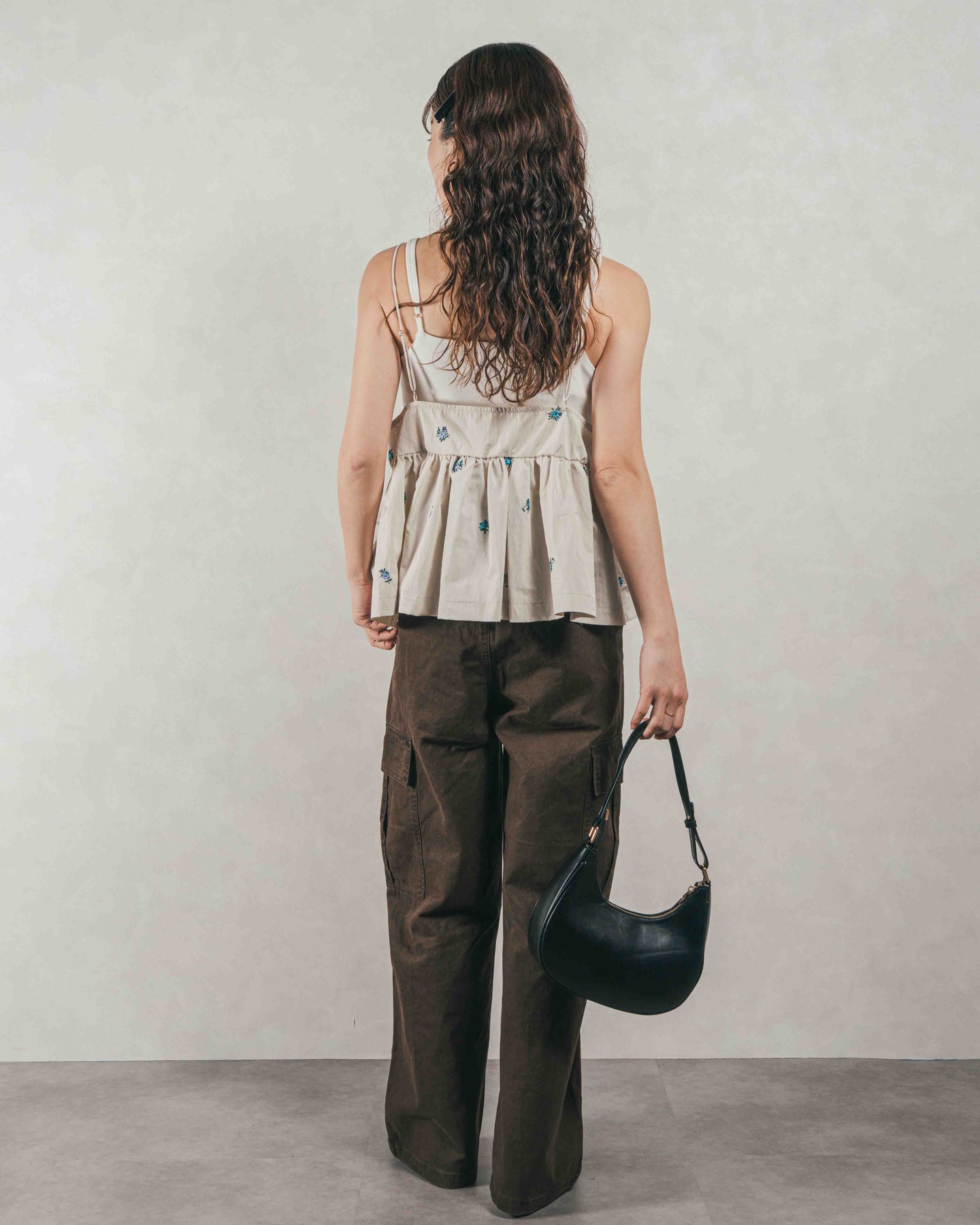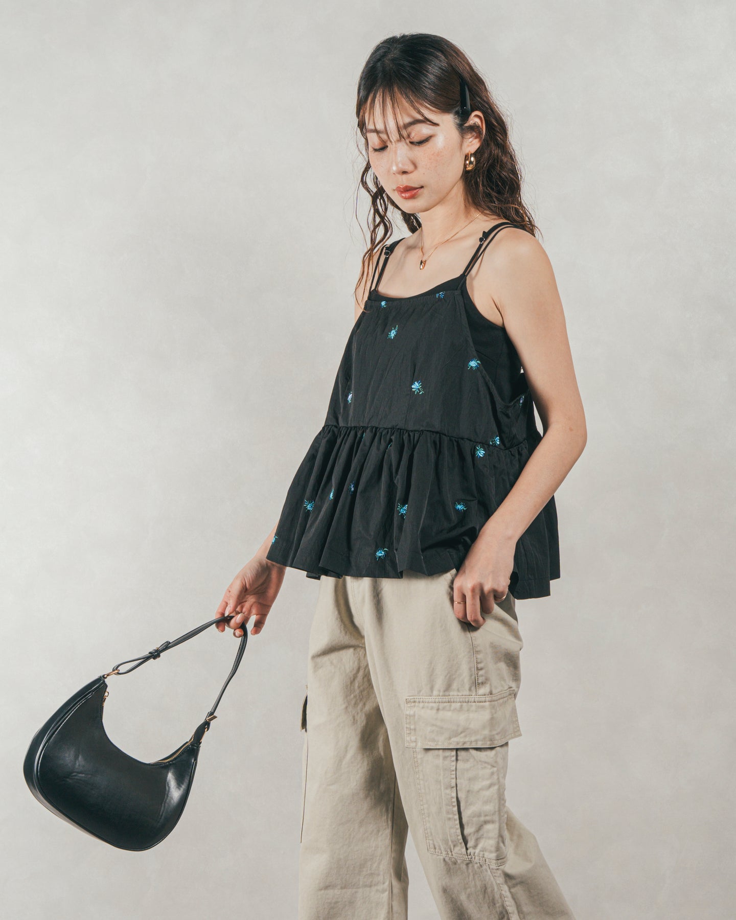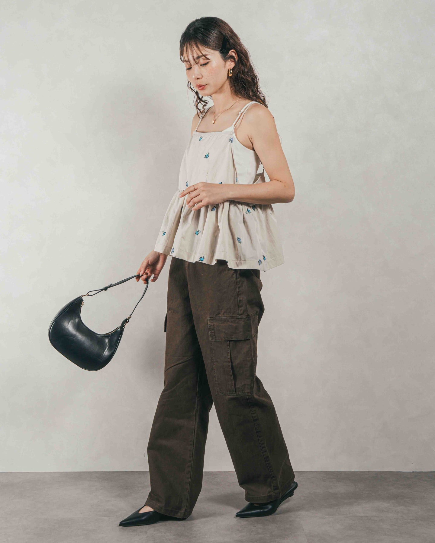 [SET]Flower刺繍 ボリュームキャミ + ピグメントツイルカーゴパンツ(2SET)
