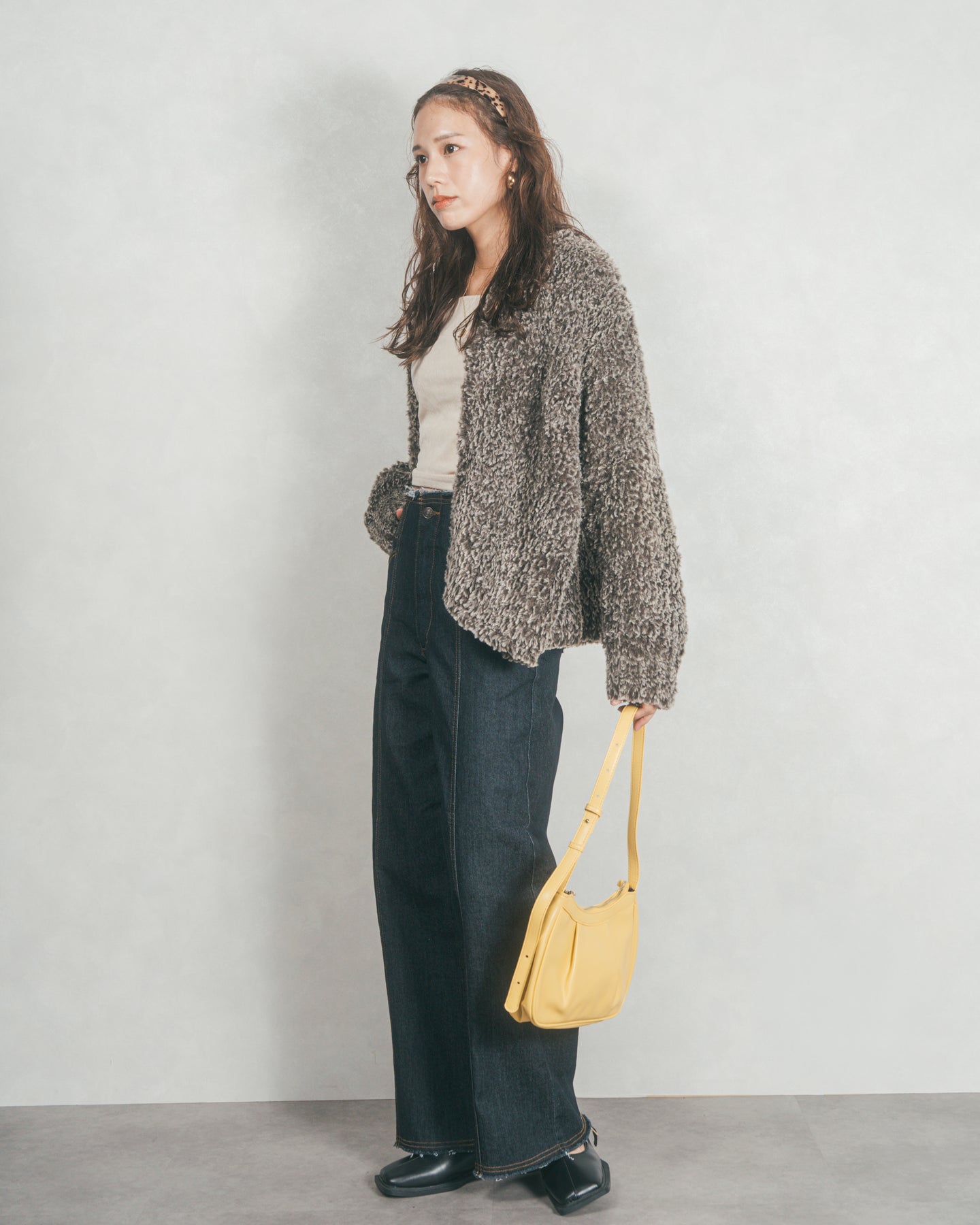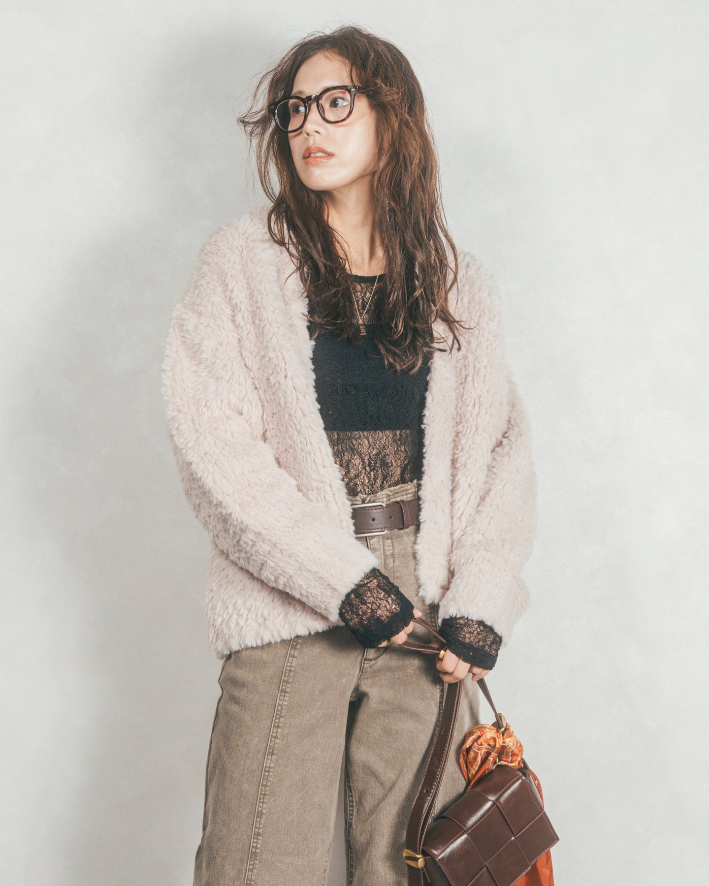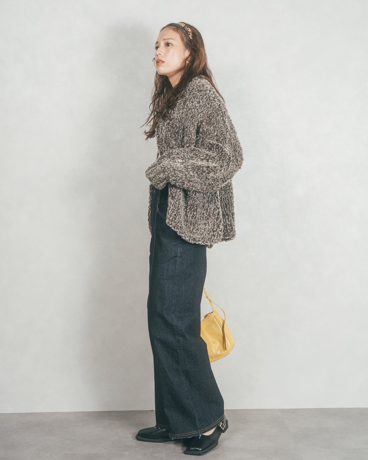 羽織るだけで、日常の装いに上品な温もりを添えるニット素材のコート。カーディガンよりしっかり感がありながら重すぎず、秋冬の軽い羽織りとして活躍します。ノーカラーですっきりとした首元で、シャツやニットとのレイヤードも自在。後ろ丈を少し長めにすることで、体型カバーも叶います。使用しているのは、繊細な毛並みが特徴のファー糸で、なめらかでふわふわとした肌触りが心地よく、編み立てることで立体感のある表情に。カジュアルにはデニムやパンツと、きれいめにはワンピースと合わせれば、日常から週末のお出かけまで幅広く対応できる頼れる一着です。