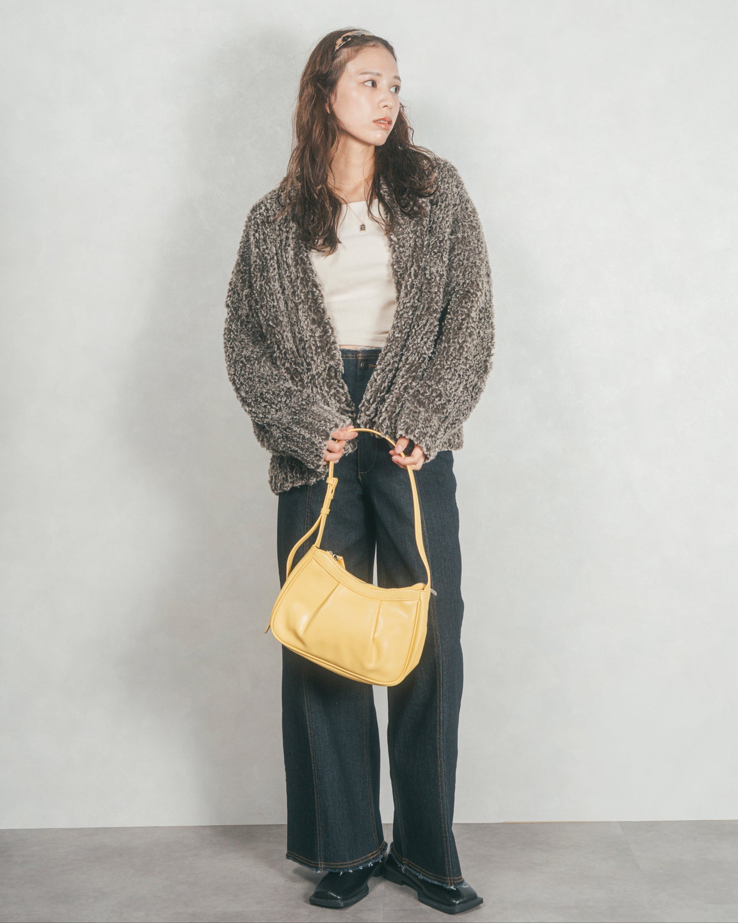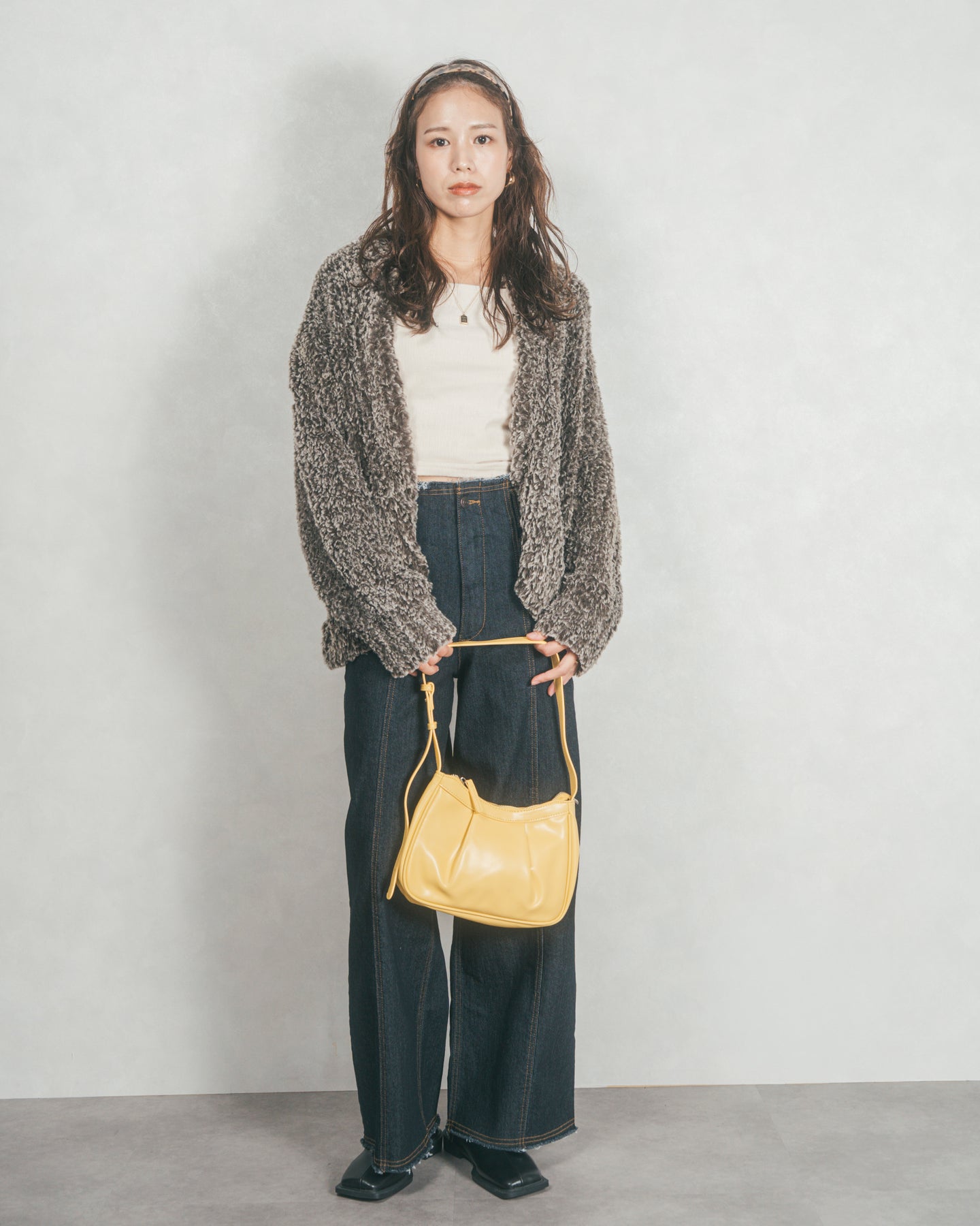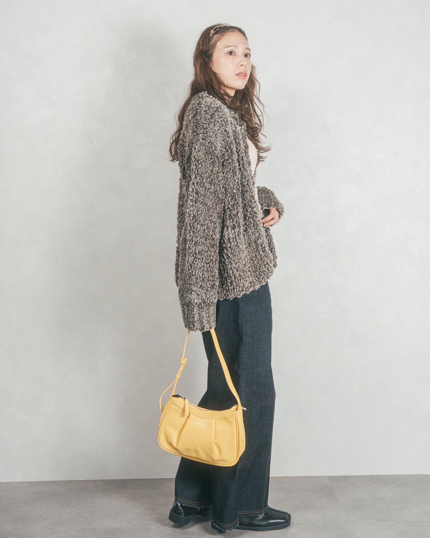羽織るだけで、日常の装いに上品な温もりを添えるニット素材のコート。カーディガンよりしっかり感がありながら重すぎず、秋冬の軽い羽織りとして活躍します。ノーカラーですっきりとした首元で、シャツやニットとのレイヤードも自在。後ろ丈を少し長めにすることで、体型カバーも叶います。使用しているのは、繊細な毛並みが特徴のファー糸で、なめらかでふわふわとした肌触りが心地よく、編み立てることで立体感のある表情に。カジュアルにはデニムやパンツと、きれいめにはワンピースと合わせれば、日常から週末のお出かけまで幅広く対応できる頼れる一着です。