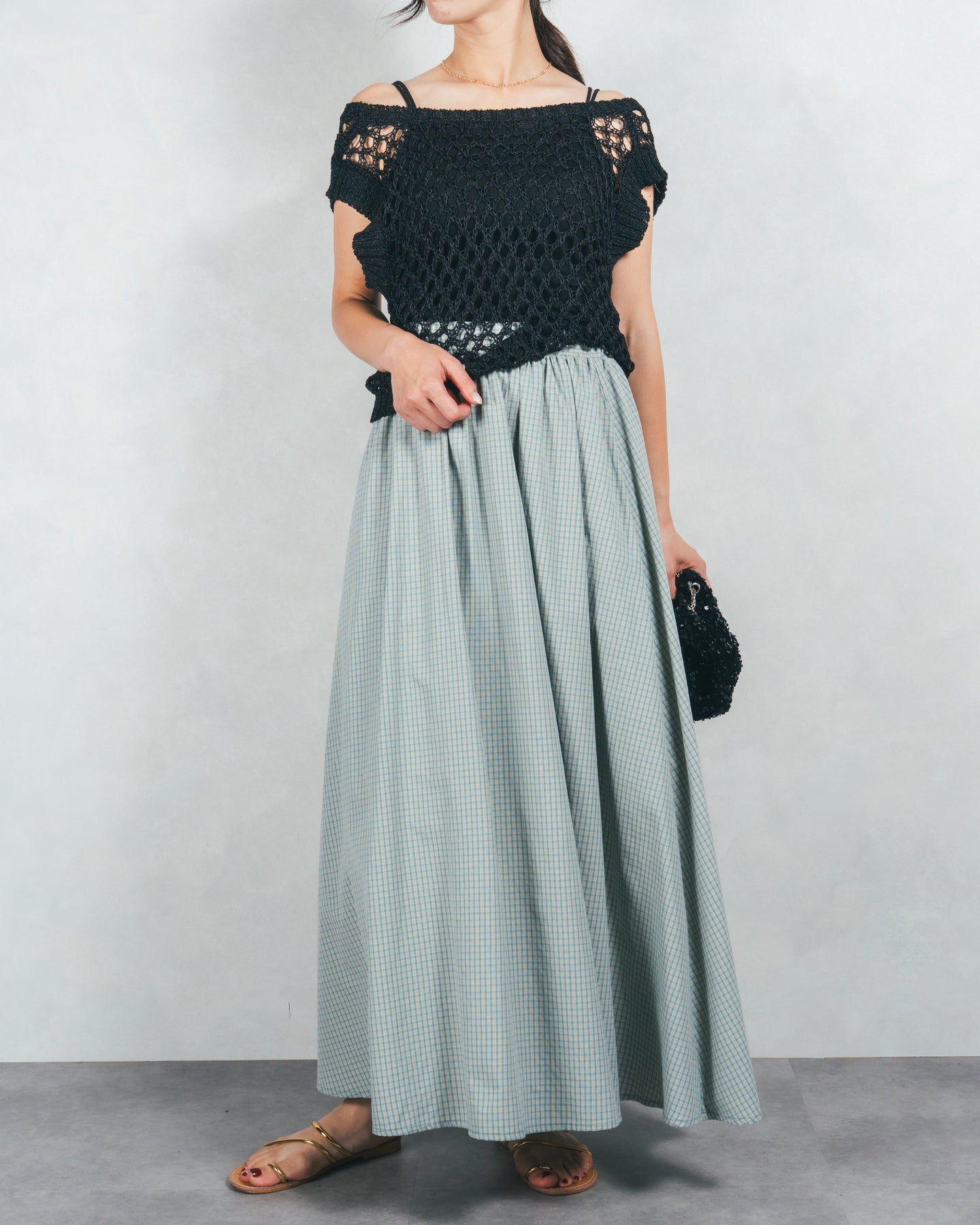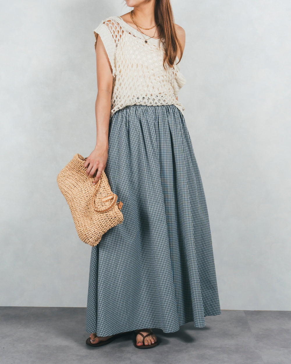 [SET]2-Way Uネックメッシュニットベスト+[カップ付き]ヘルシーフィットリブキャミ+チェックギャザーマキシスカート(3SET)