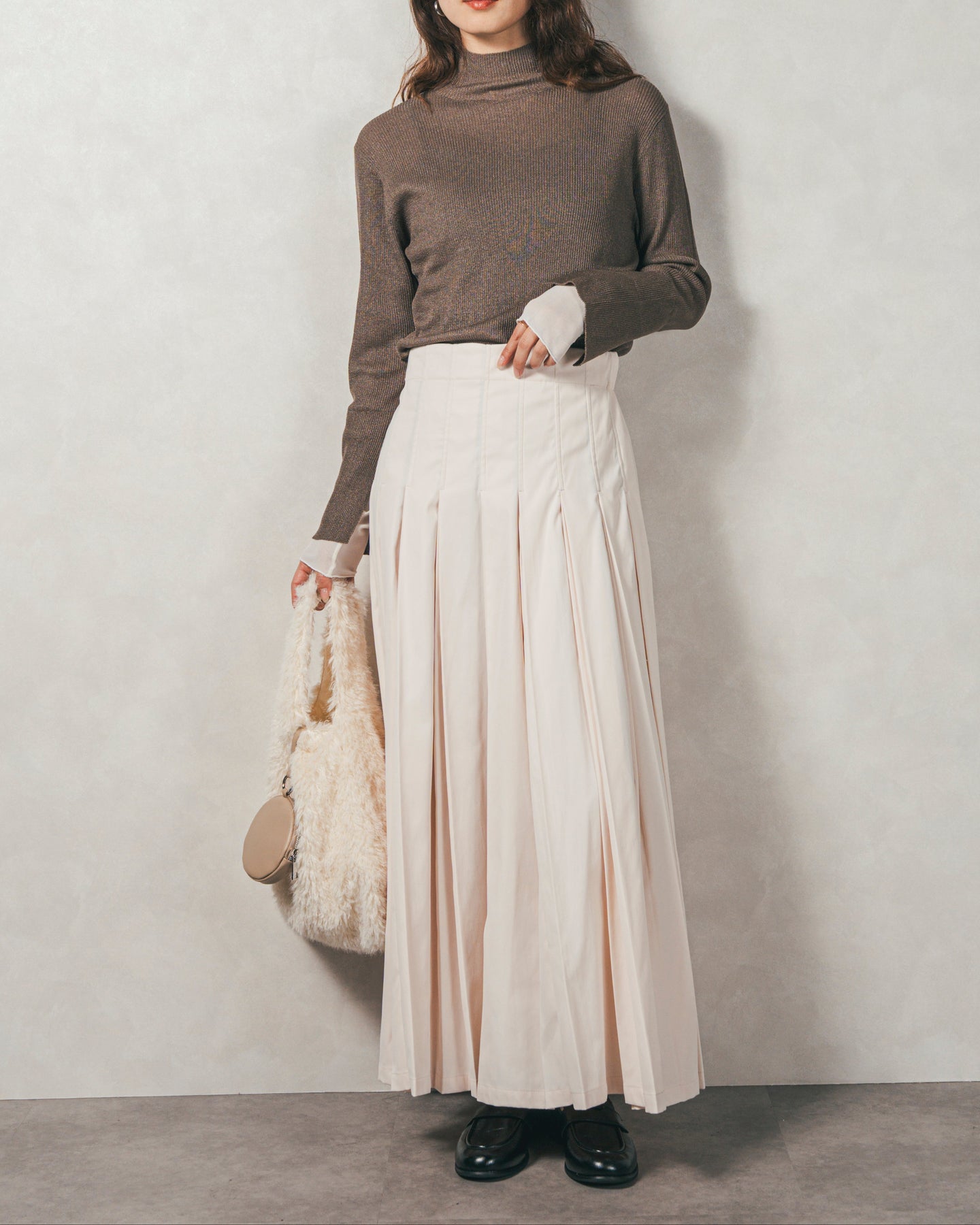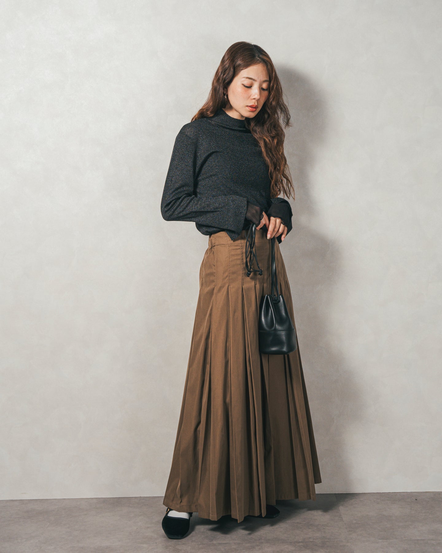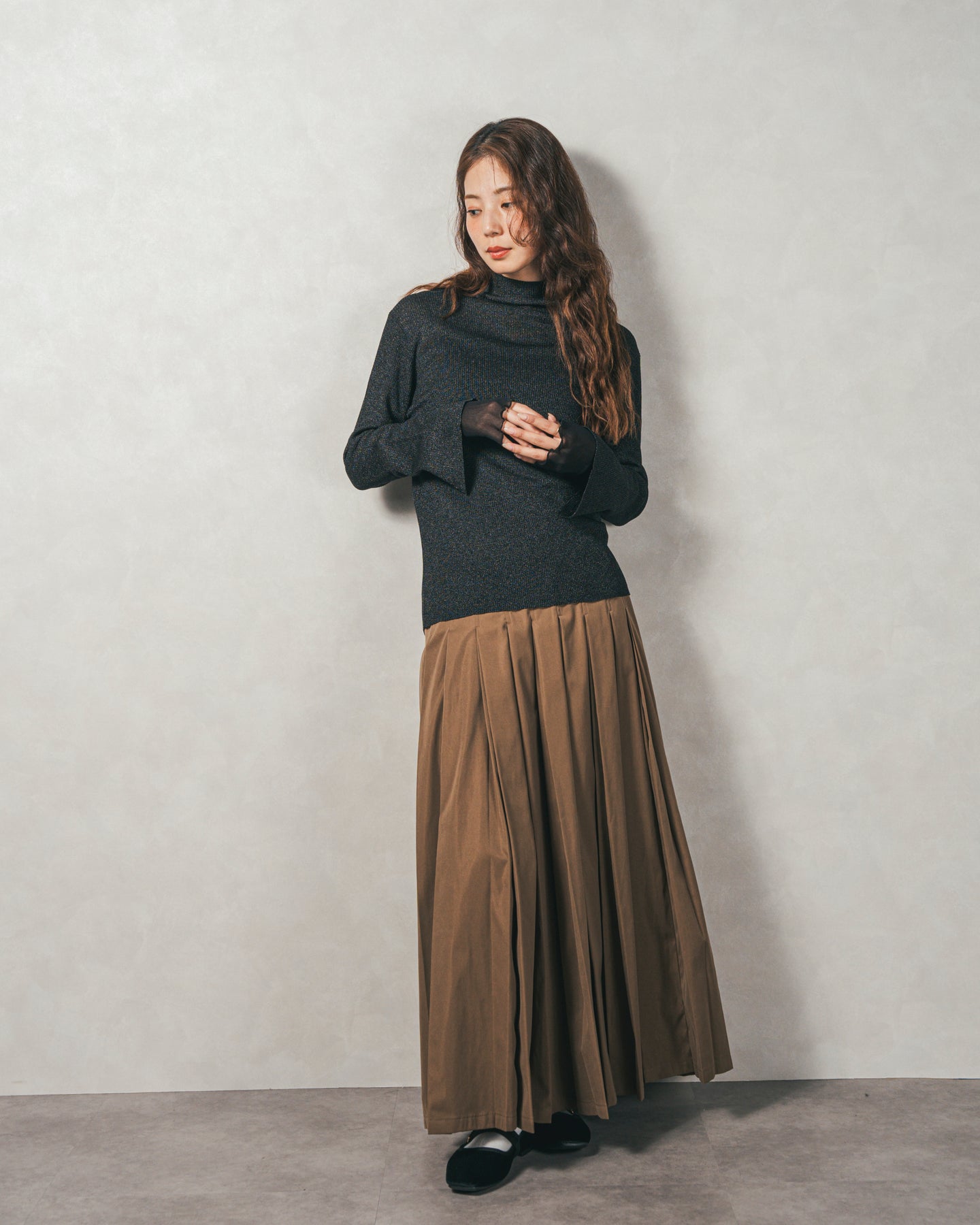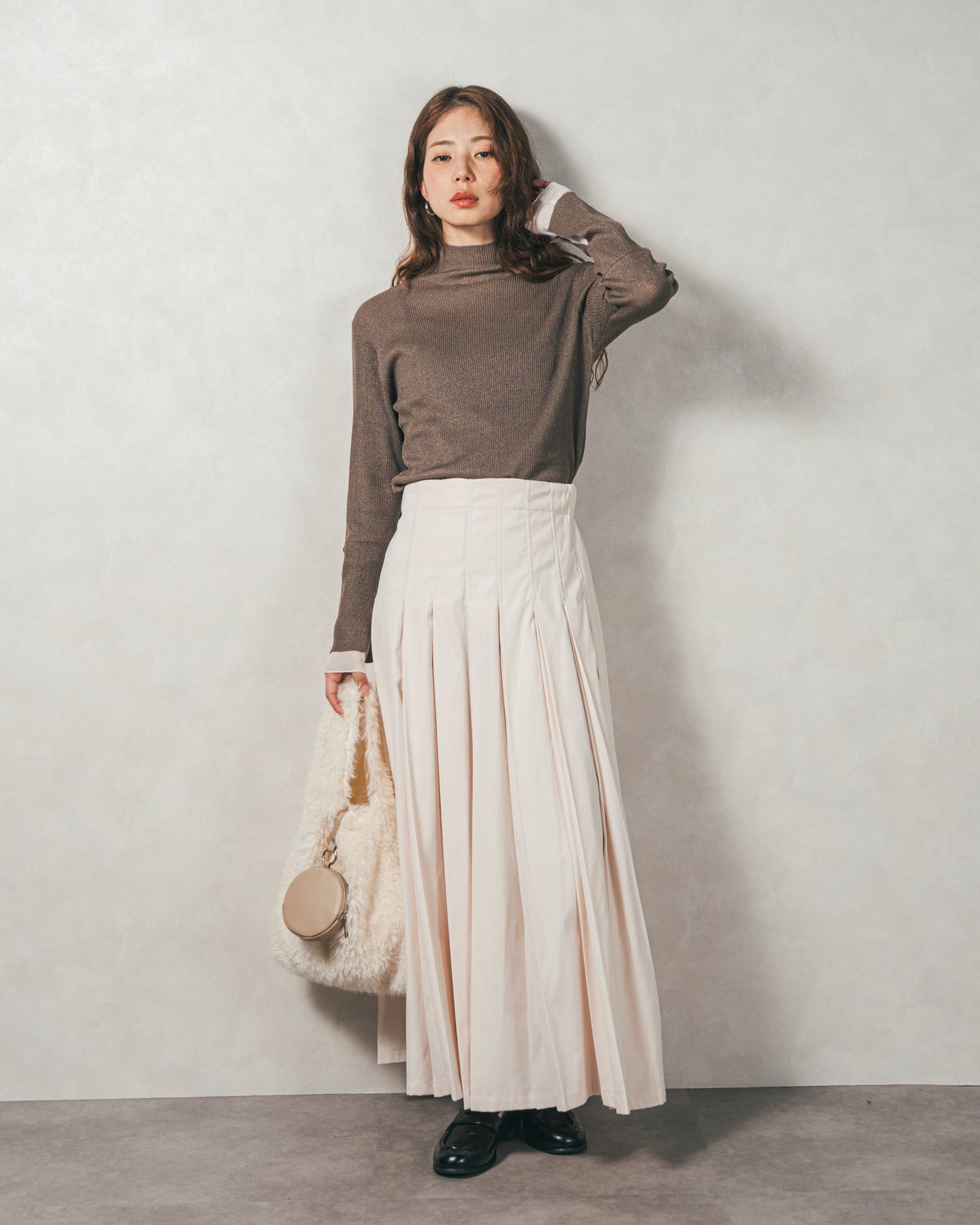 [SET]袖レイヤードラメリブタートルニット+すっきり見えカップ付きキャミ+W-Tuckプリーツロングスカート(3SET)