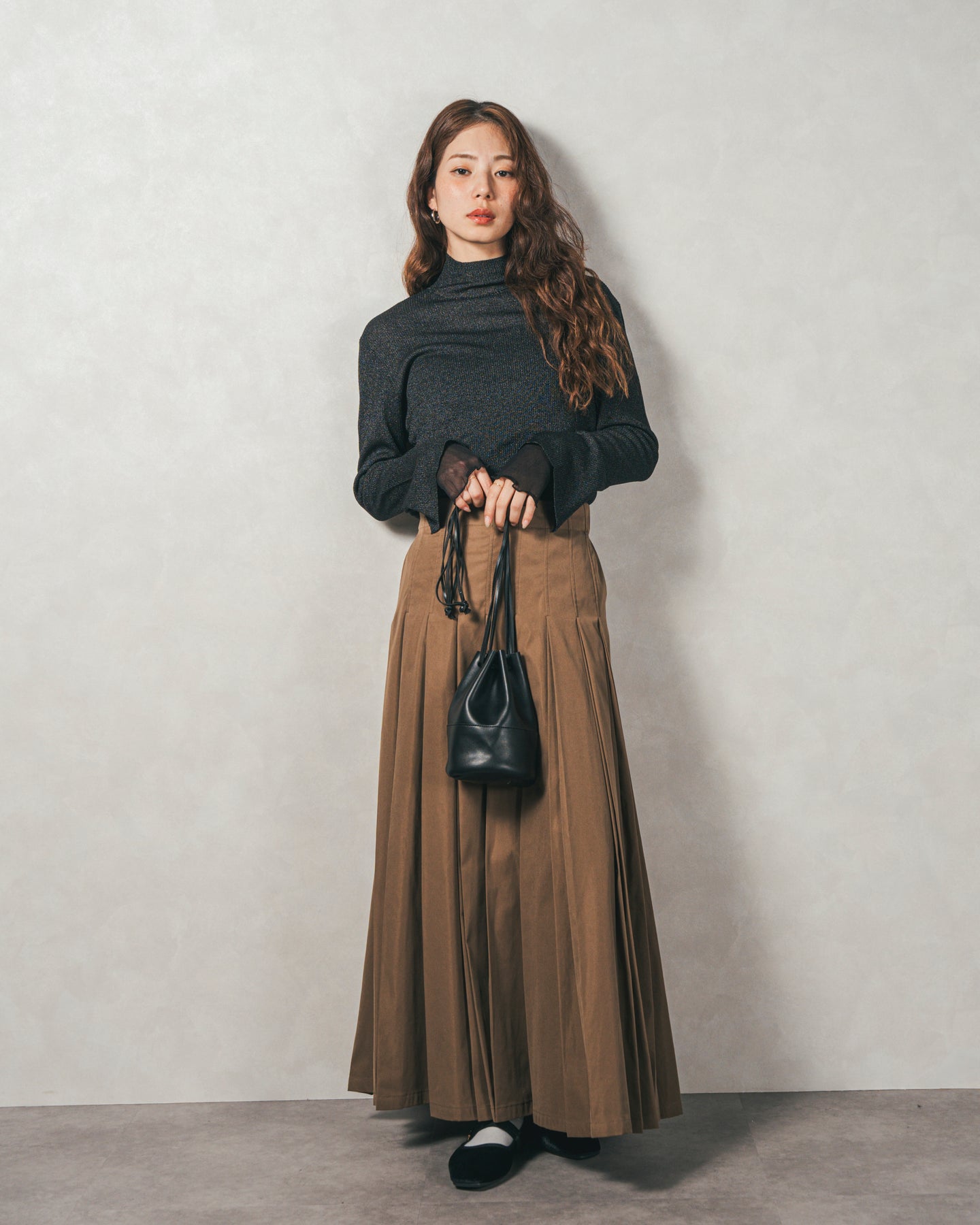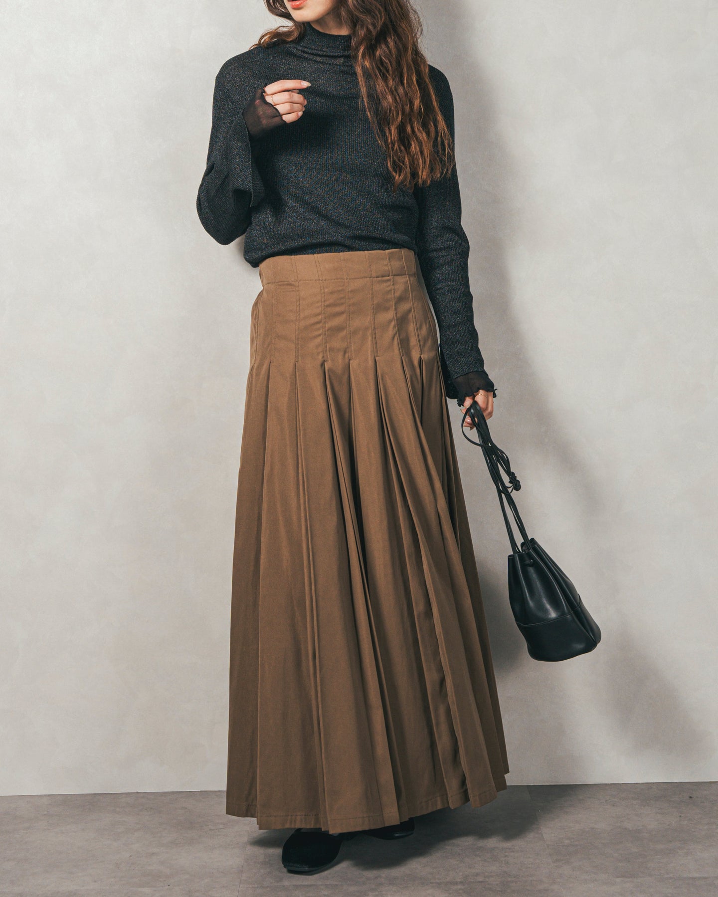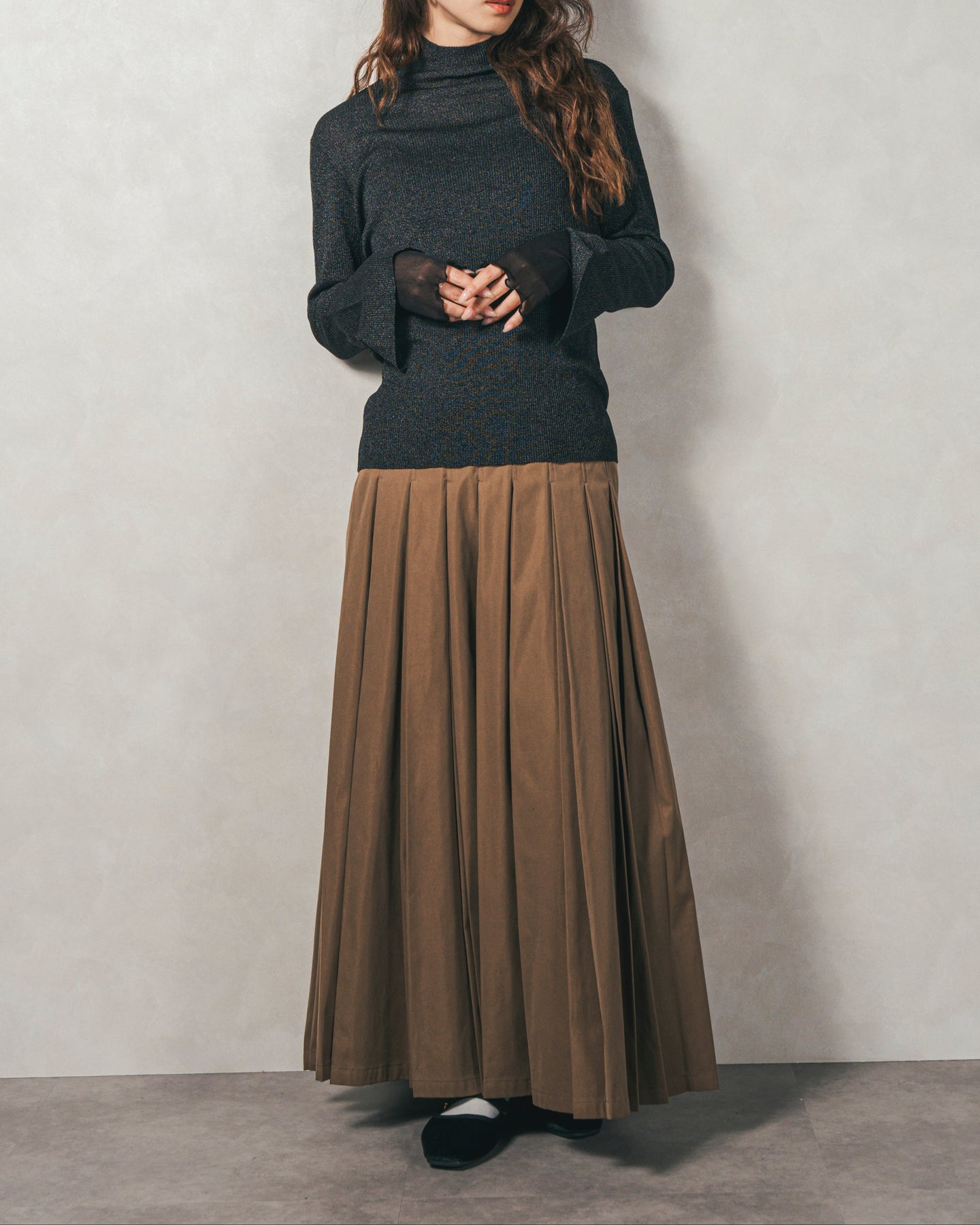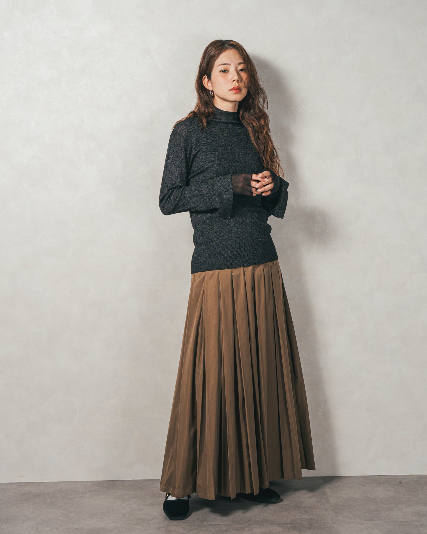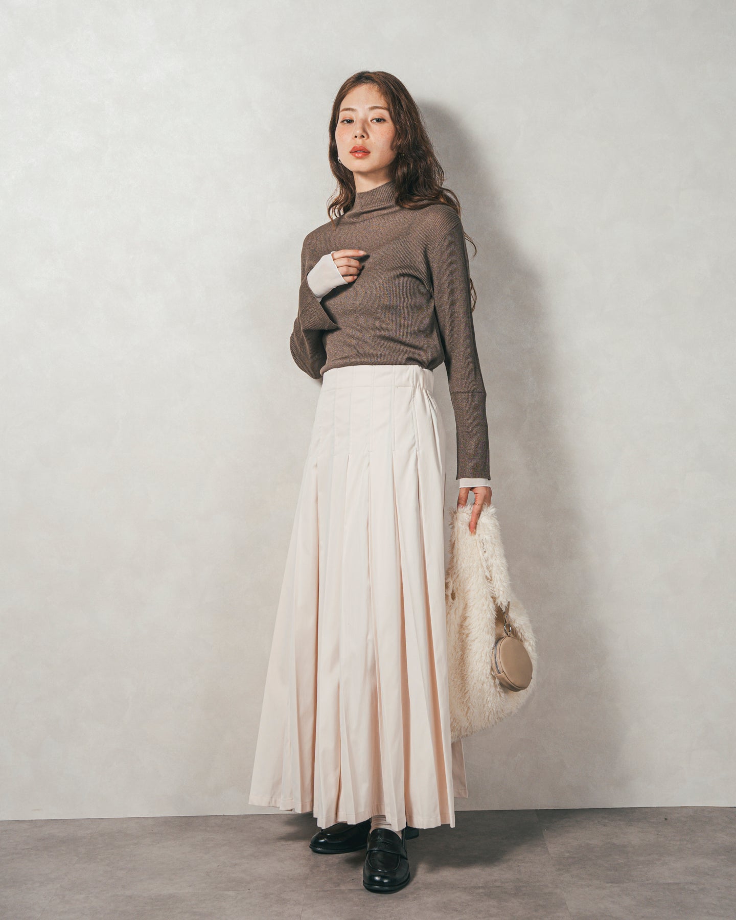 [SET]袖レイヤードラメリブタートルニット+すっきり見えカップ付きキャミ+W-Tuckプリーツロングスカート(3SET)