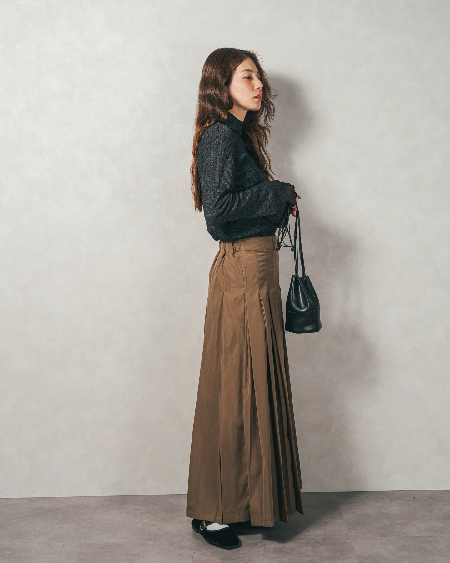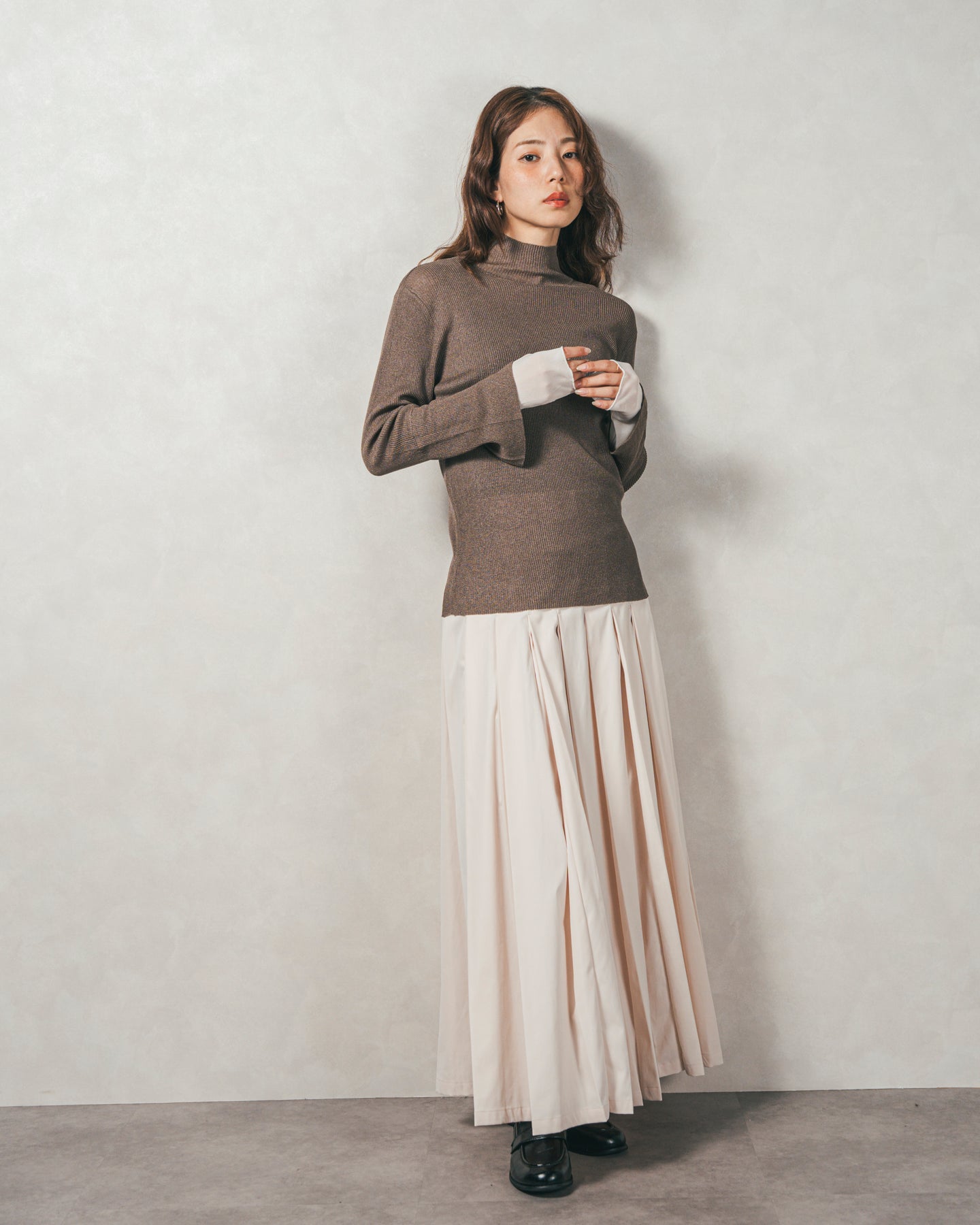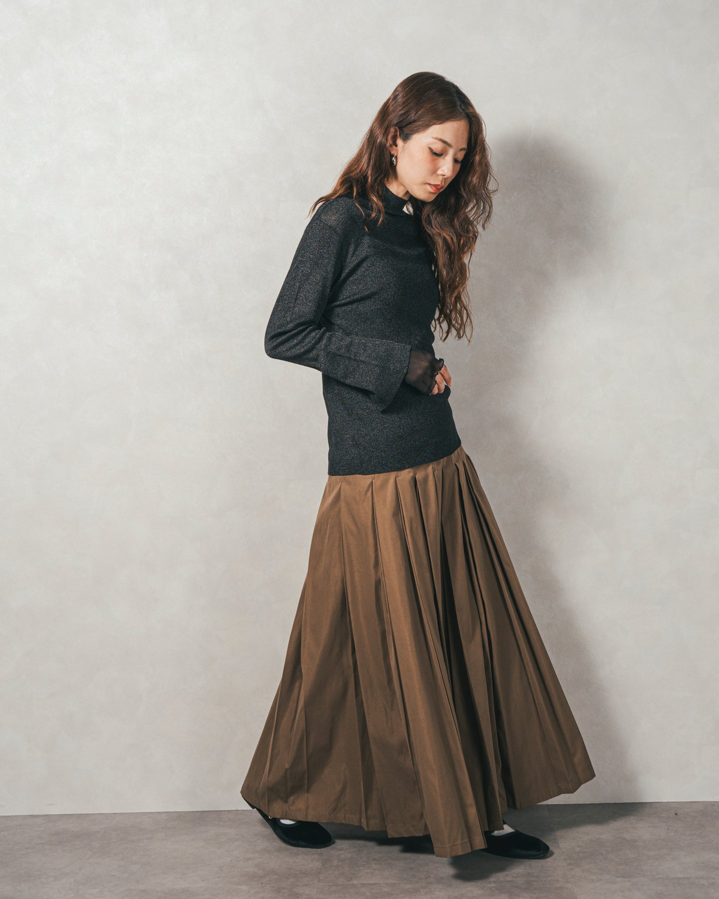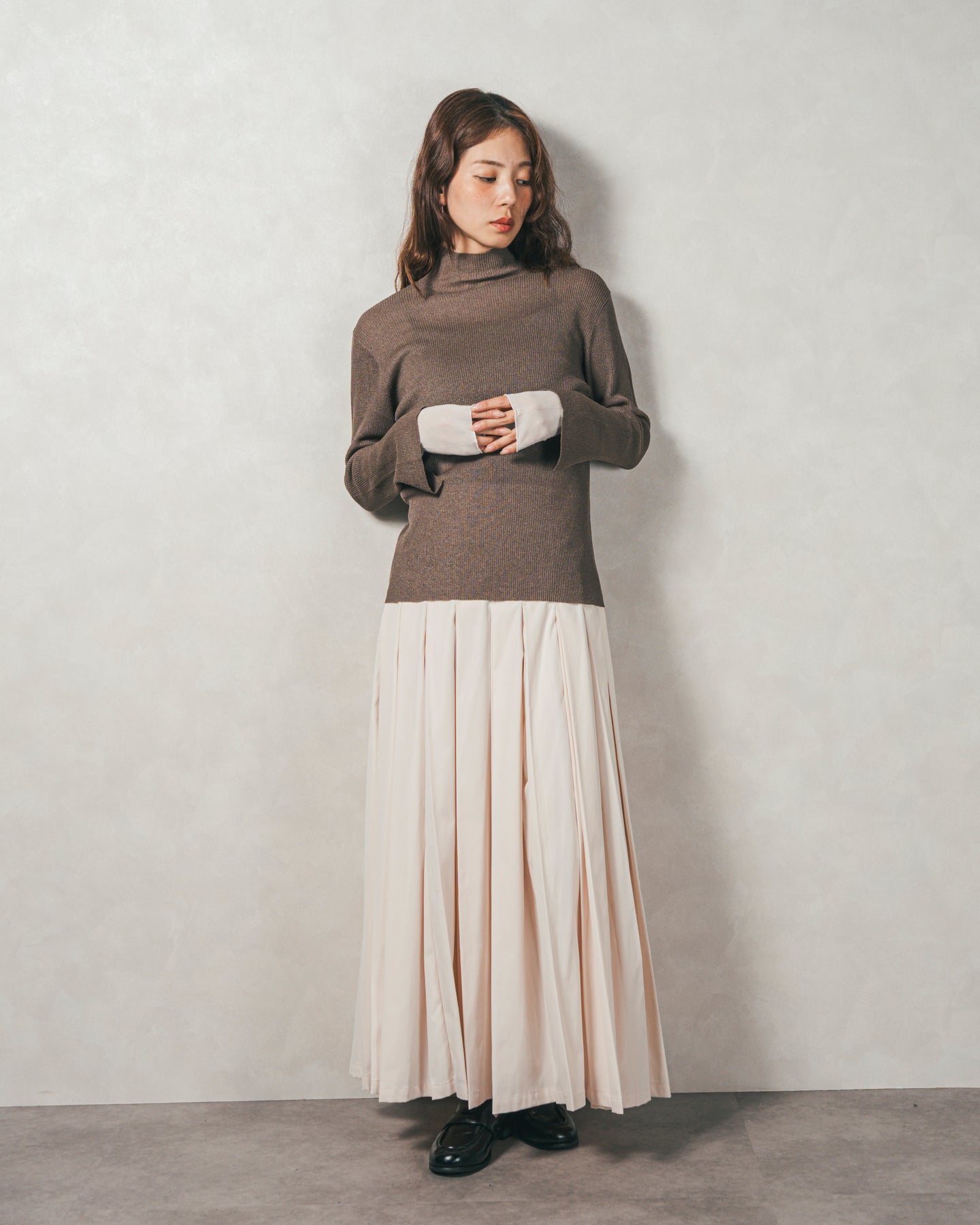 [SET]袖レイヤードラメリブタートルニット+すっきり見えカップ付きキャミ+W-Tuckプリーツロングスカート(3SET)