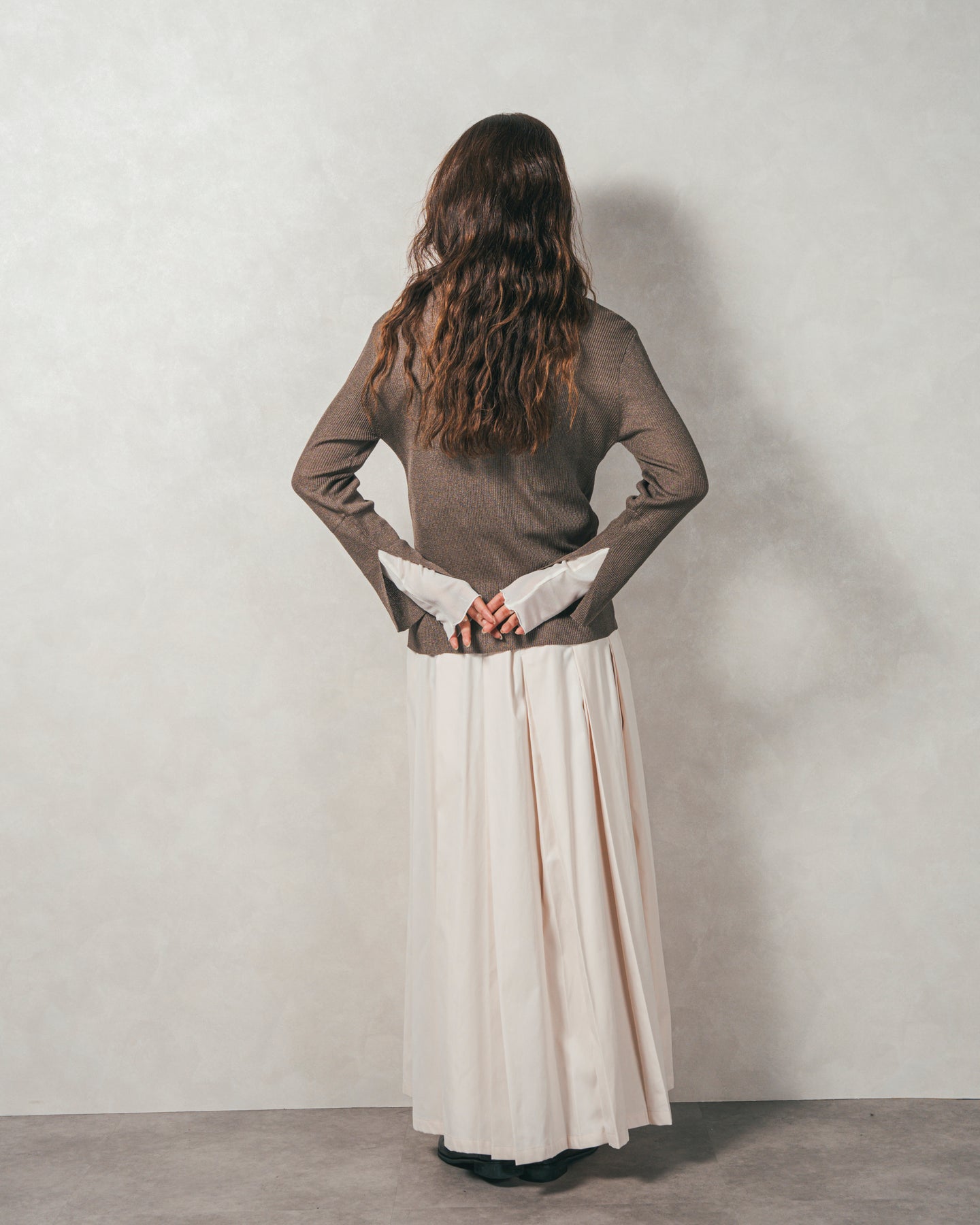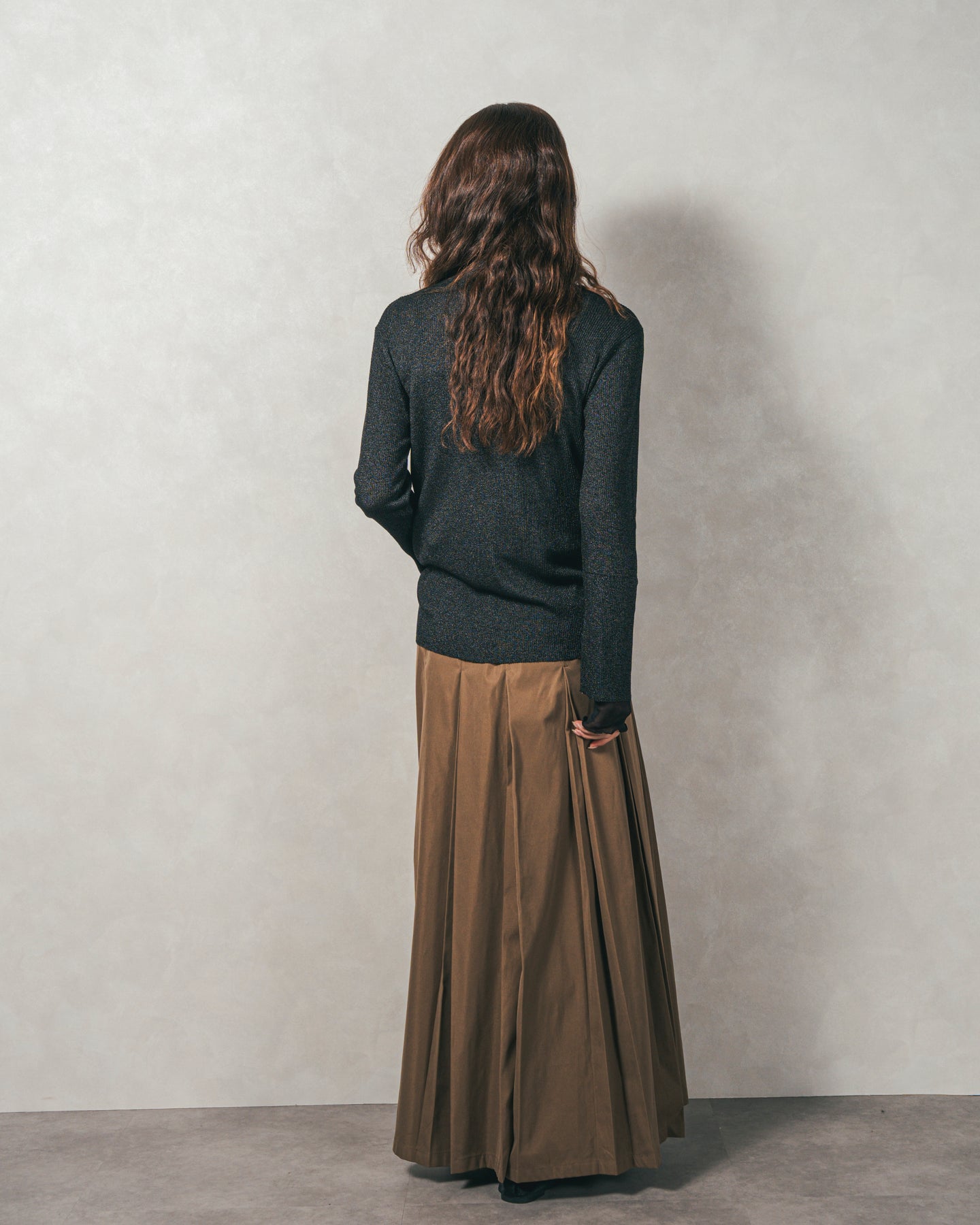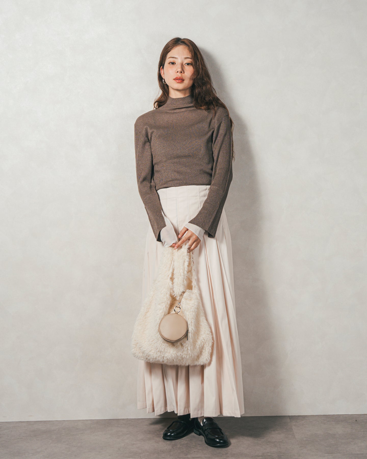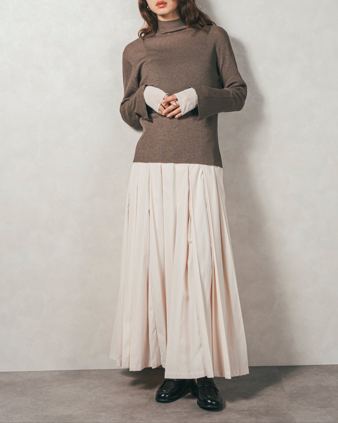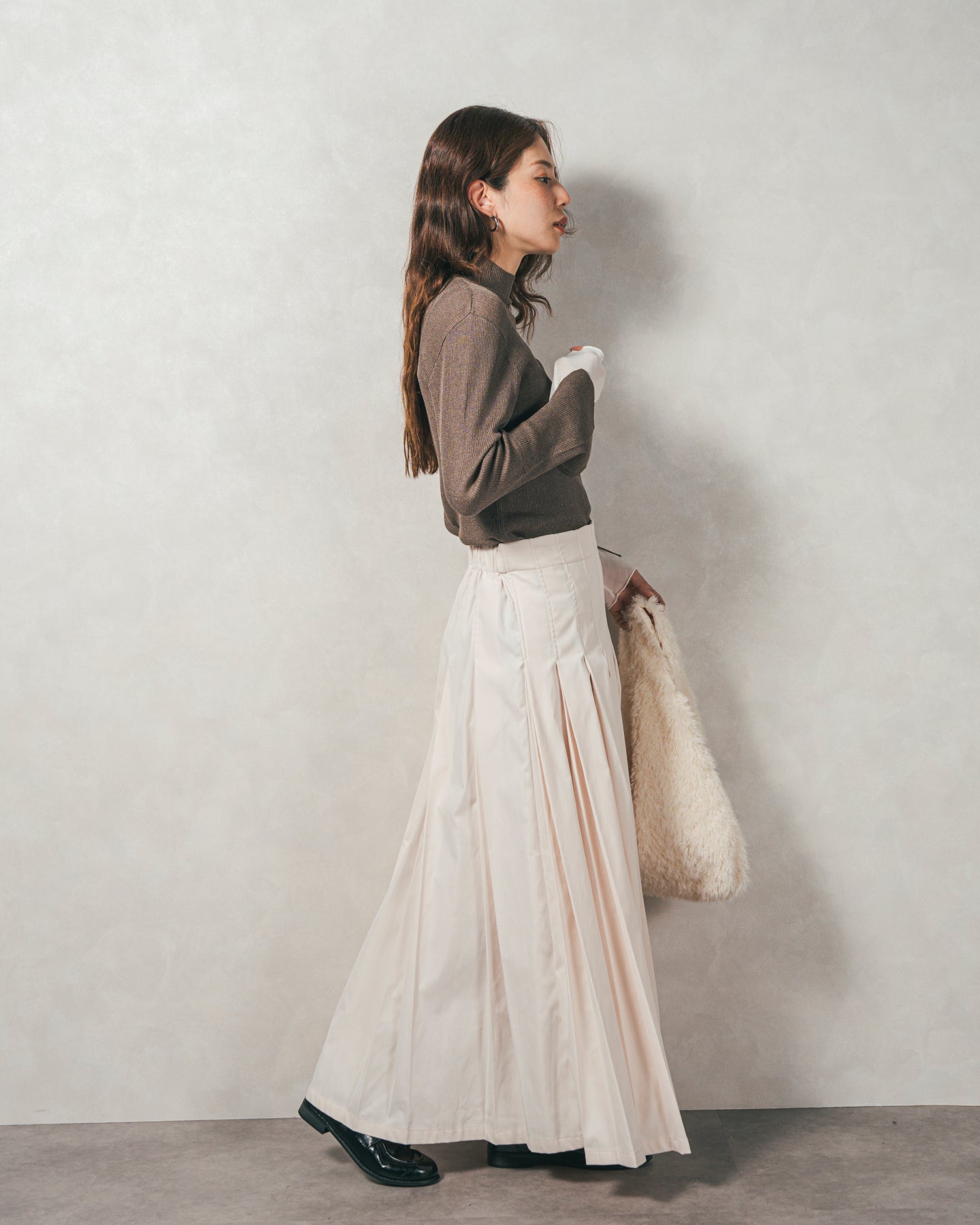 [SET]袖レイヤードラメリブタートルニット+すっきり見えカップ付きキャミ+W-Tuckプリーツロングスカート(3SET)