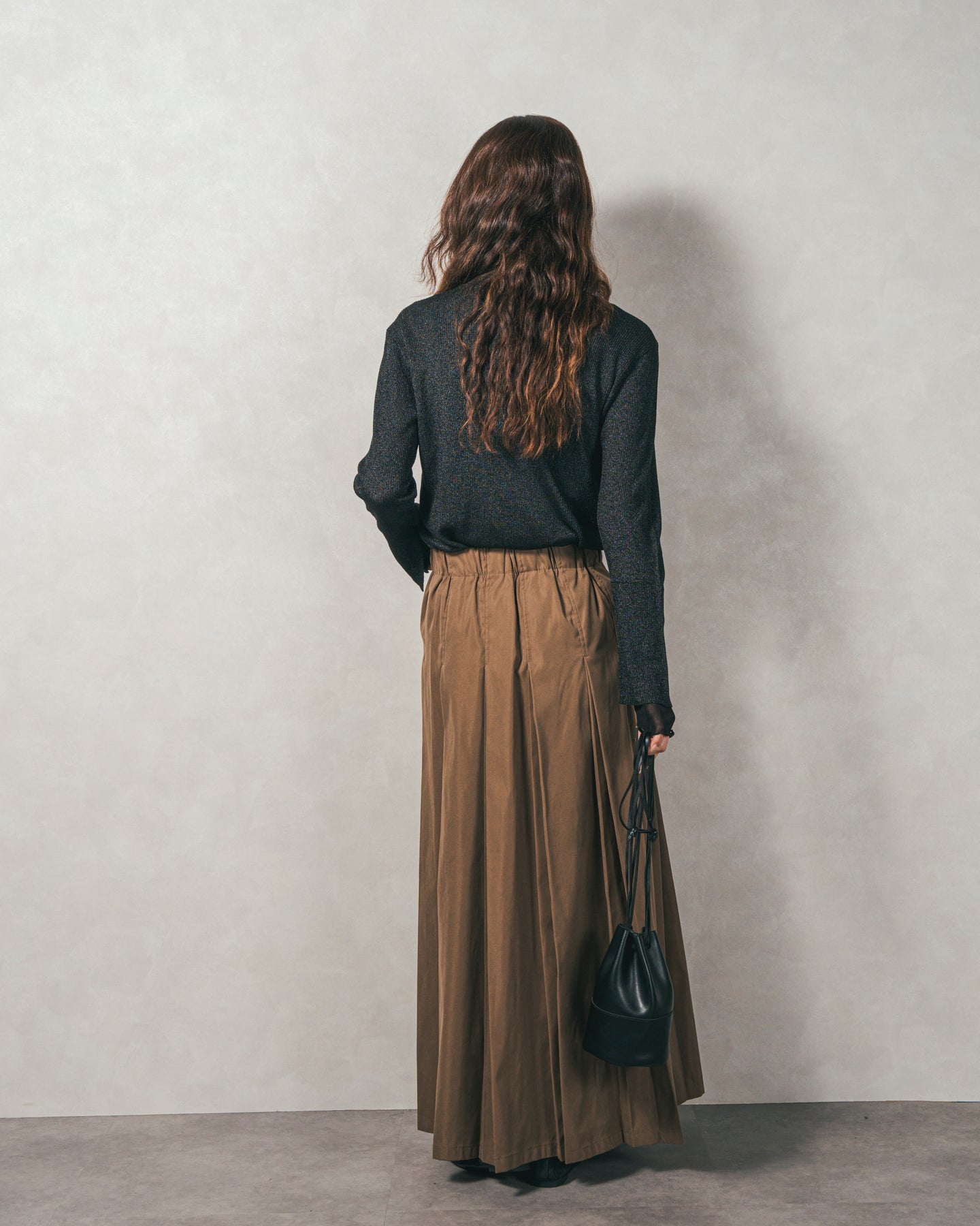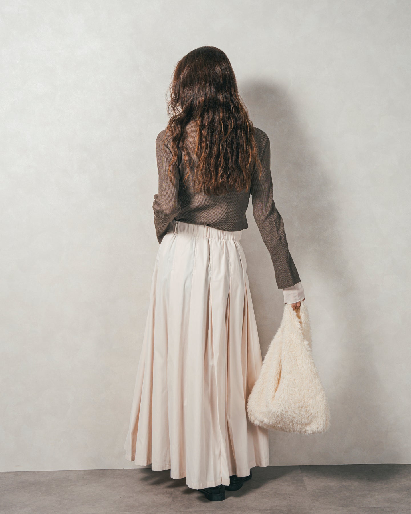 腰回りをすっきりと見せつつ、裾に向かって華やかに広がデザイン。ダブルタックにより、通常のプリーツよりも立体感と動きが生まれ、存在感のあるシルエットを作り出します。長めの丈感で大人っぽい印象に。