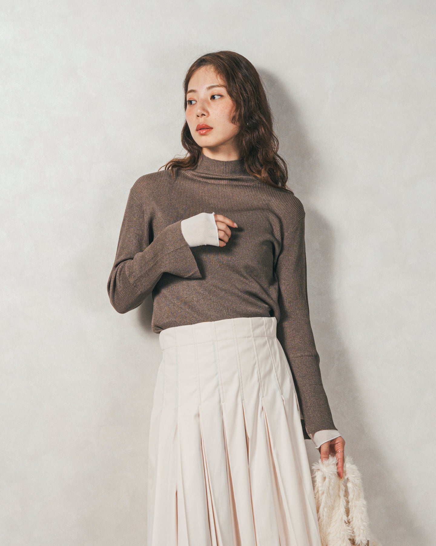繊細なラメを丁寧に編み込んだ、上品なリブ素材。 ギラギラした派手さはなく、光の加減でまたたくようなさりげない輝きが特徴。肌を美しく見せてくれる高見えアイテム。袖口のレイヤード部分は伸縮性のある素材で。肌馴染みがよくチクチクしないストレスフリーな着心地です。