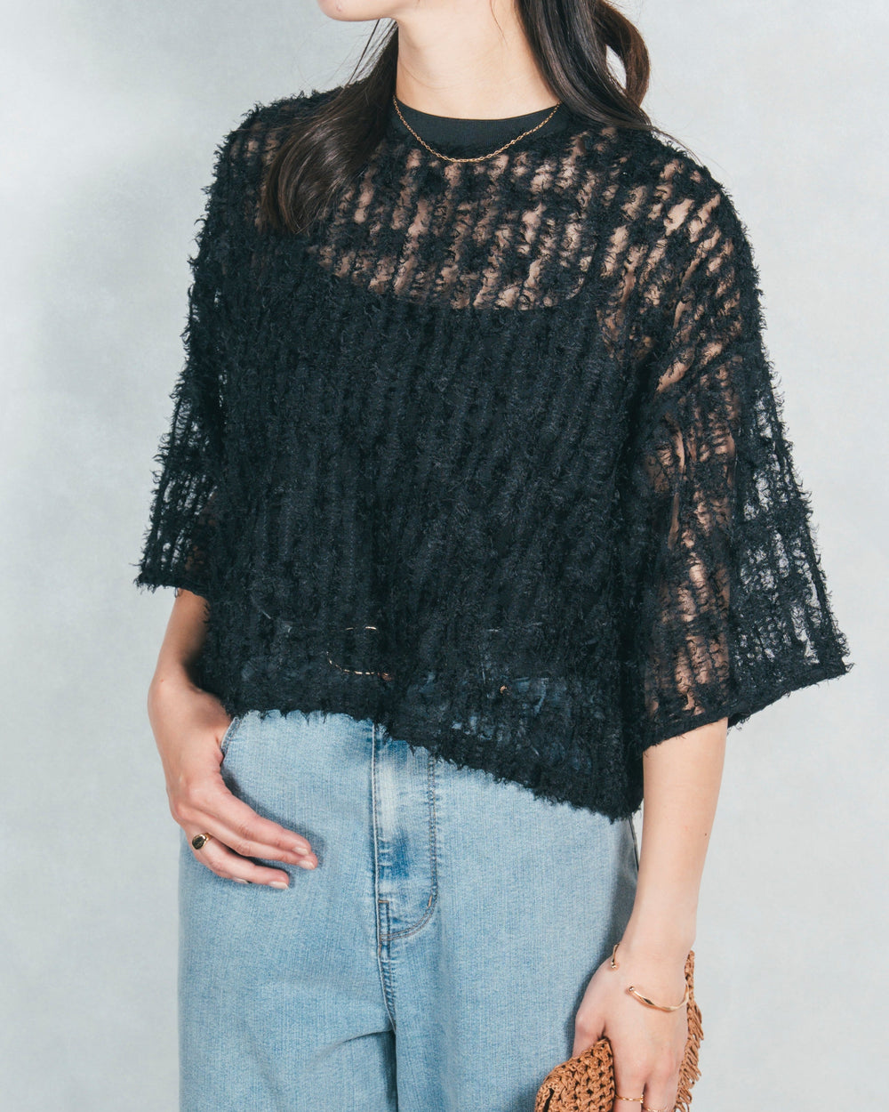 [SET]シアーフリンジトップス+アジャストロールアップストレートデニム+すっきり見えカップ付きキャミ(3SET)