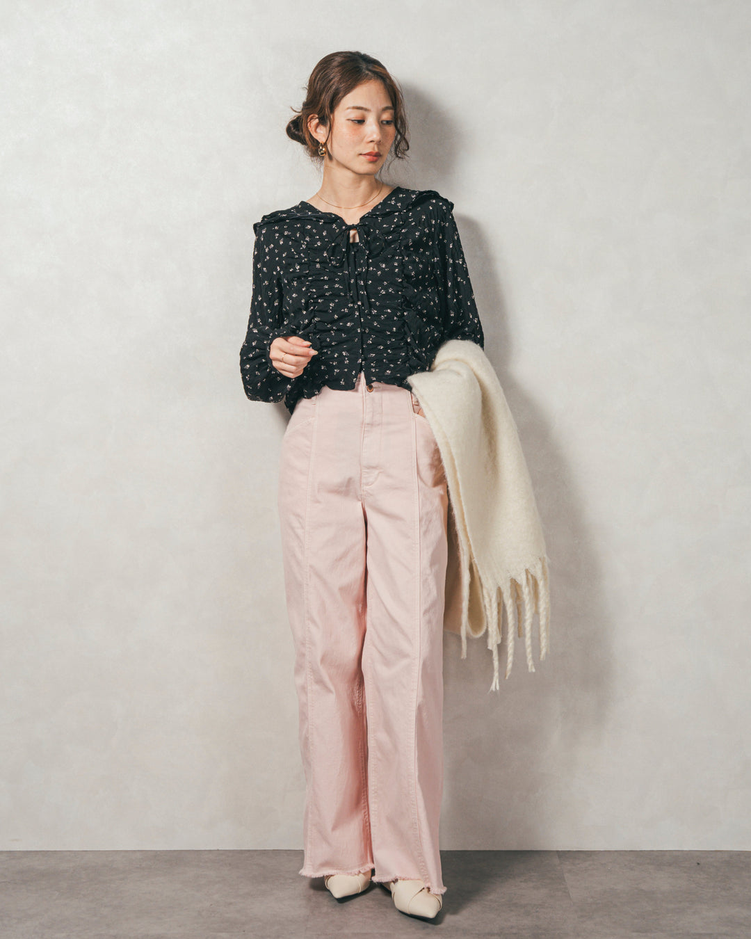 [SET]Flowerプリントフリルブラウス+センターシーム リラックスカラーデニム(2SET)
