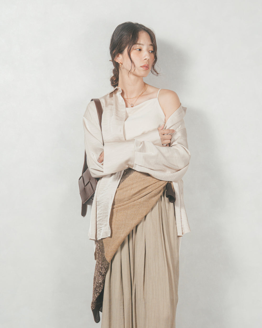 ウエストタックで自然にシルエットにメリハリが出るため、1枚で着てもサマになり、ボトムを選ばず着回しやすいのもポイント。肌寒くなってきたら、ジャケットのインナーとして袖口や裾をのぞかせるレイヤードスタイルもおすすめ。