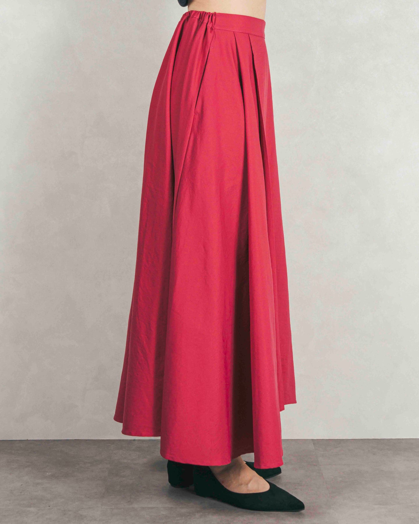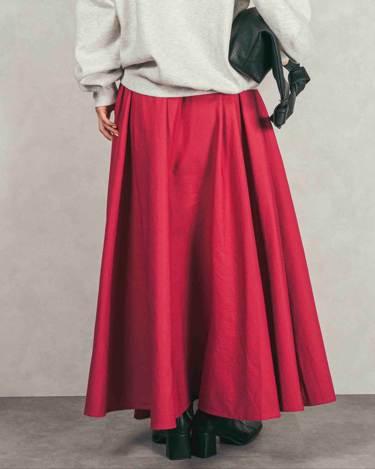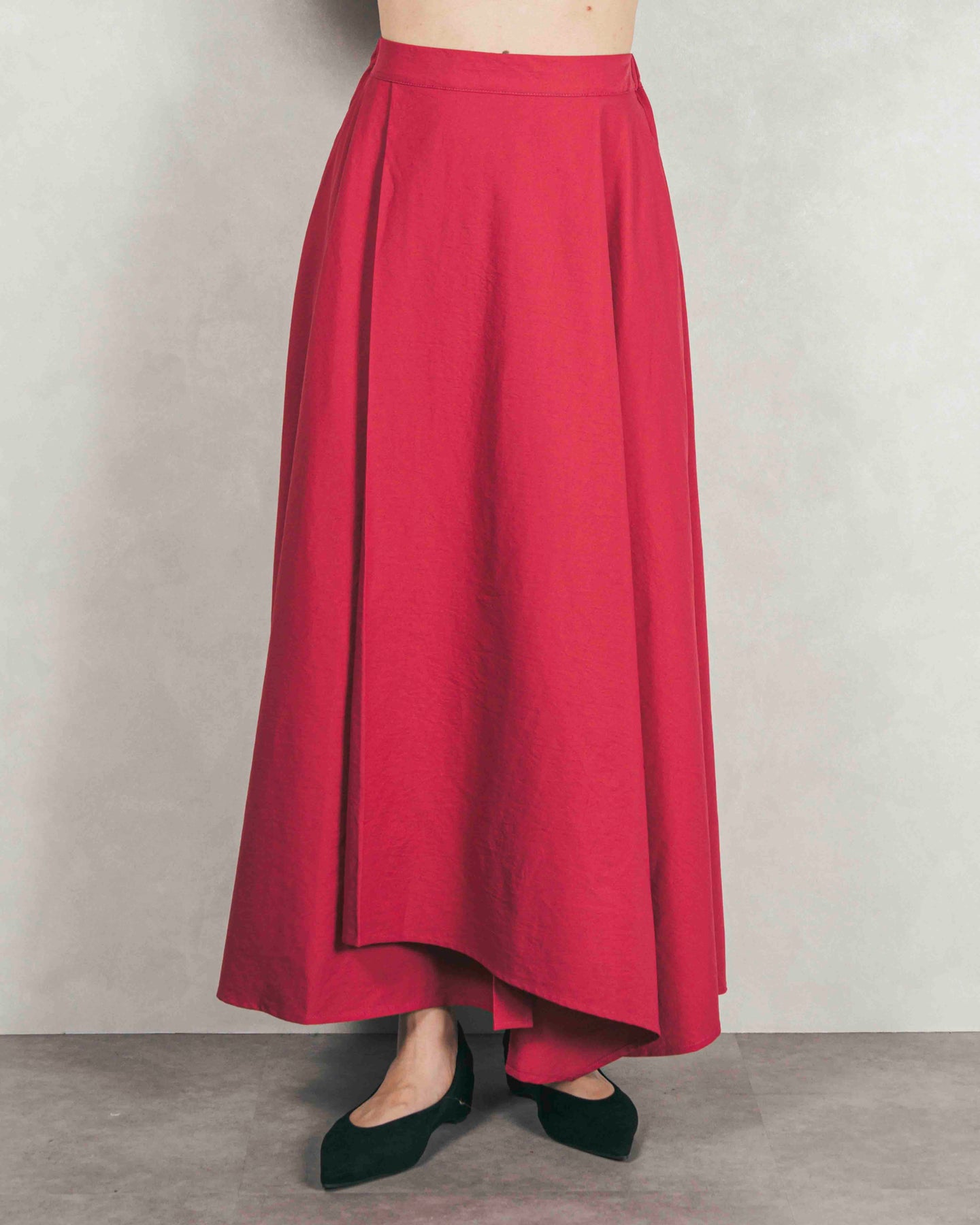 たっぷりの生地で贅沢に作られたタックスカートです。アシメントリーのヘムラインが動きを出してくれ、ゆれるシルエットが華やか。タック奥にはスリットもあるので、足さばきも◎前ウエストにはギャザーを寄せていないので、タックインしたときもすっきりし、スタイルアップ見えします。
