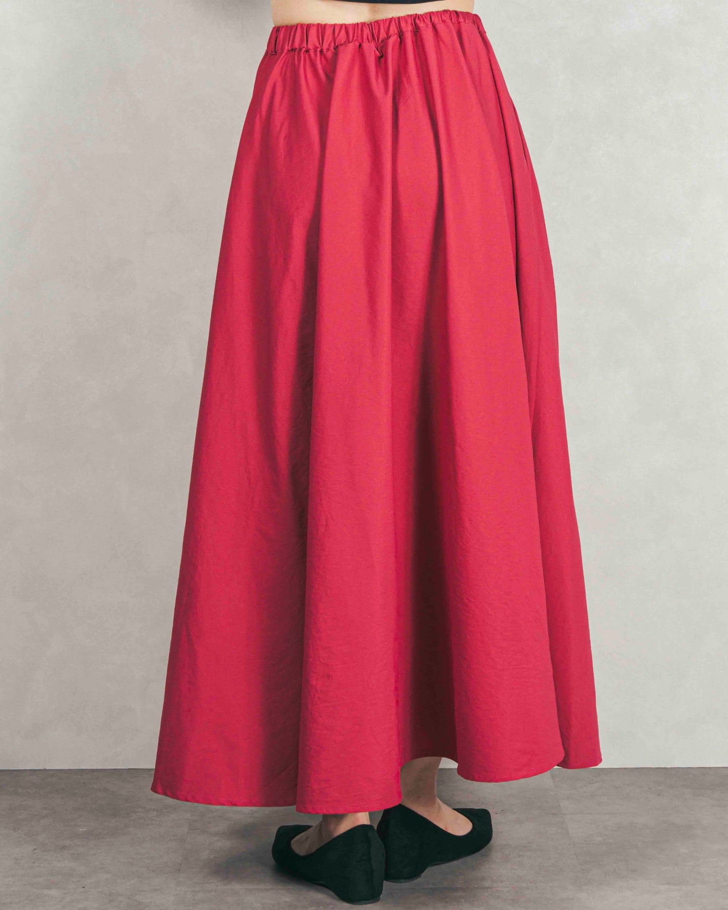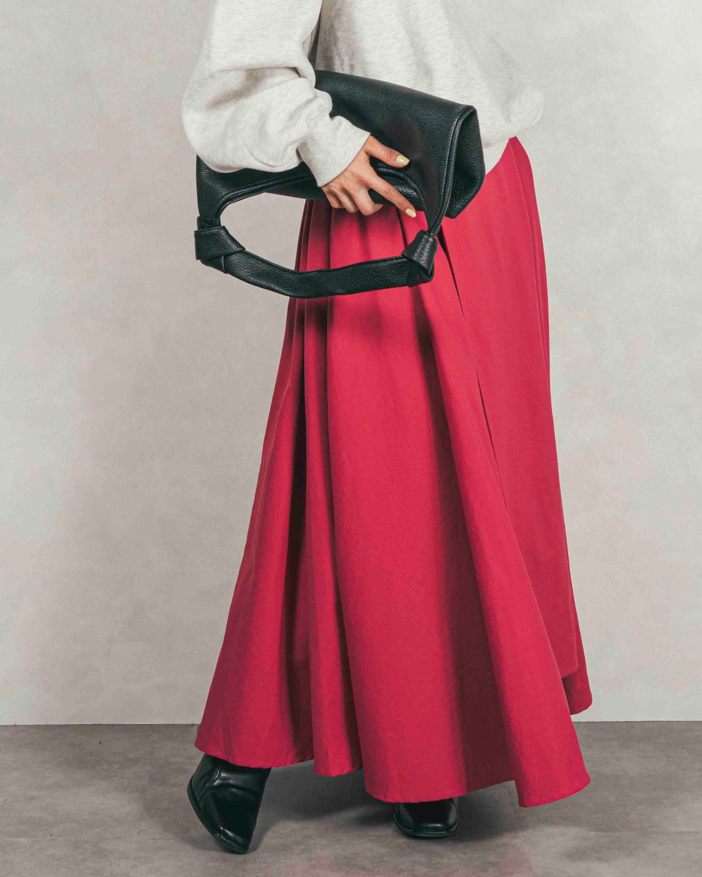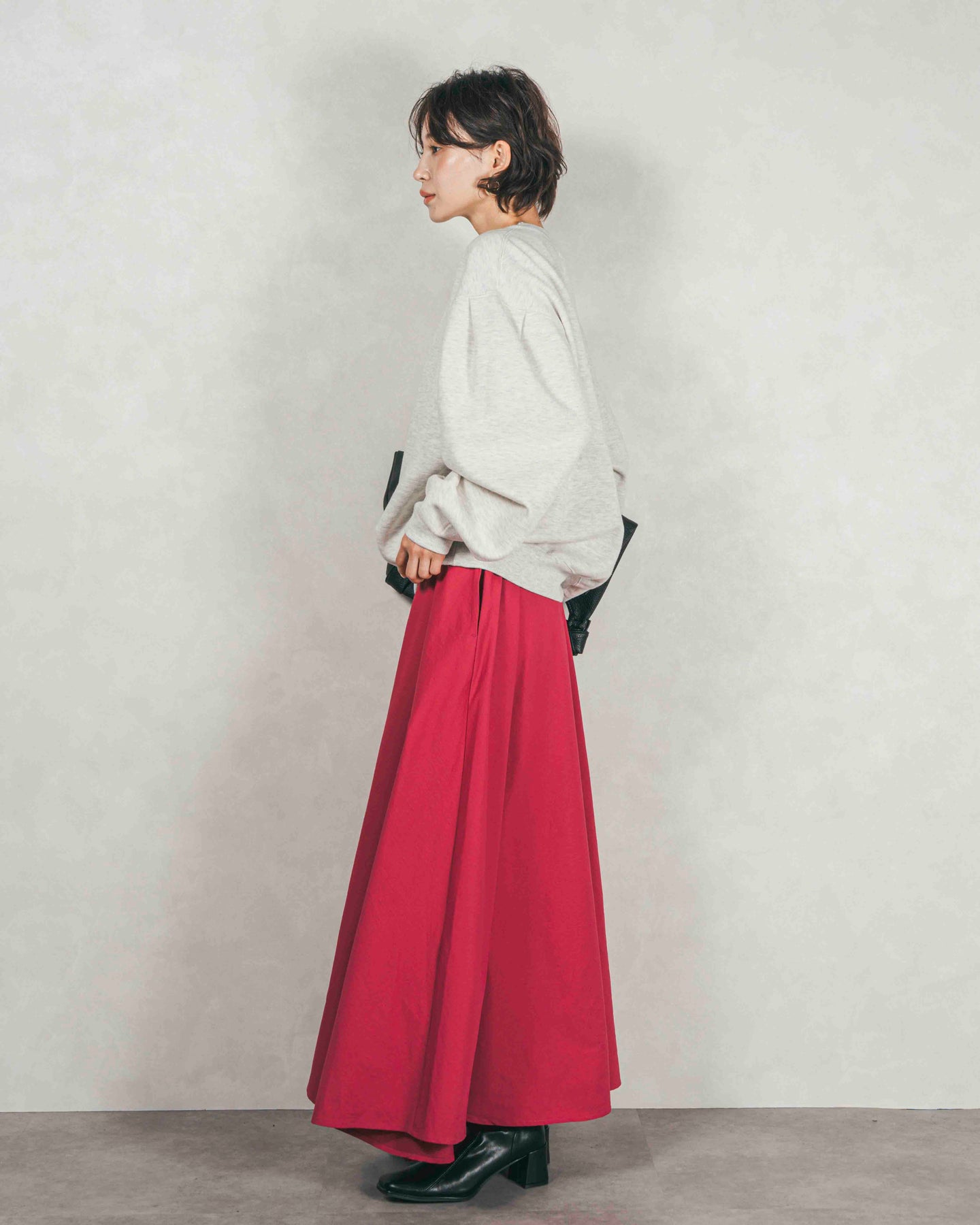 たっぷりの生地で贅沢に作られたタックスカートです。アシメントリーのヘムラインが動きを出してくれ、ゆれるシルエットが華やか。タック奥にはスリットもあるので、足さばきも◎前ウエストにはギャザーを寄せていないので、タックインしたときもすっきりし、スタイルアップ見えします。