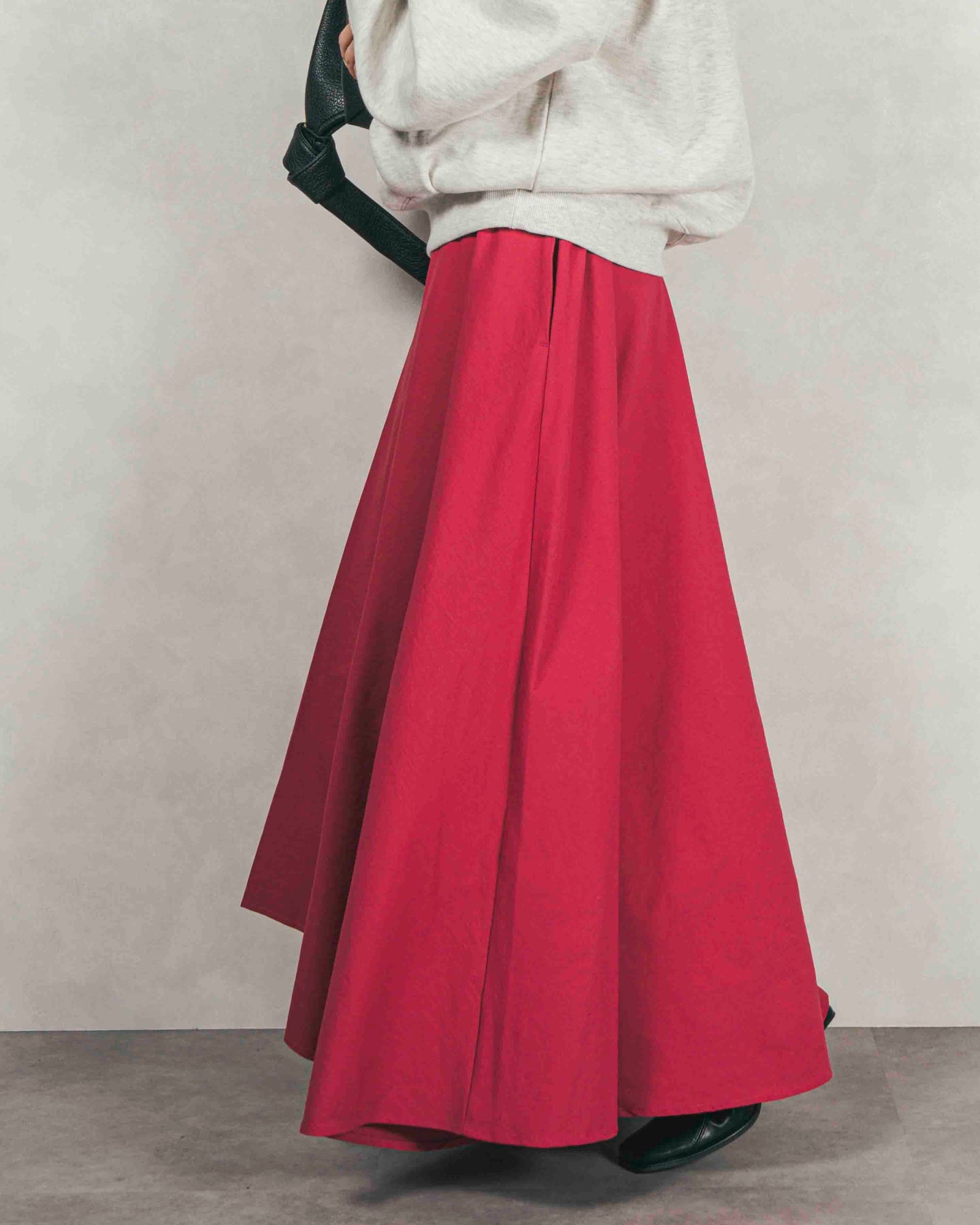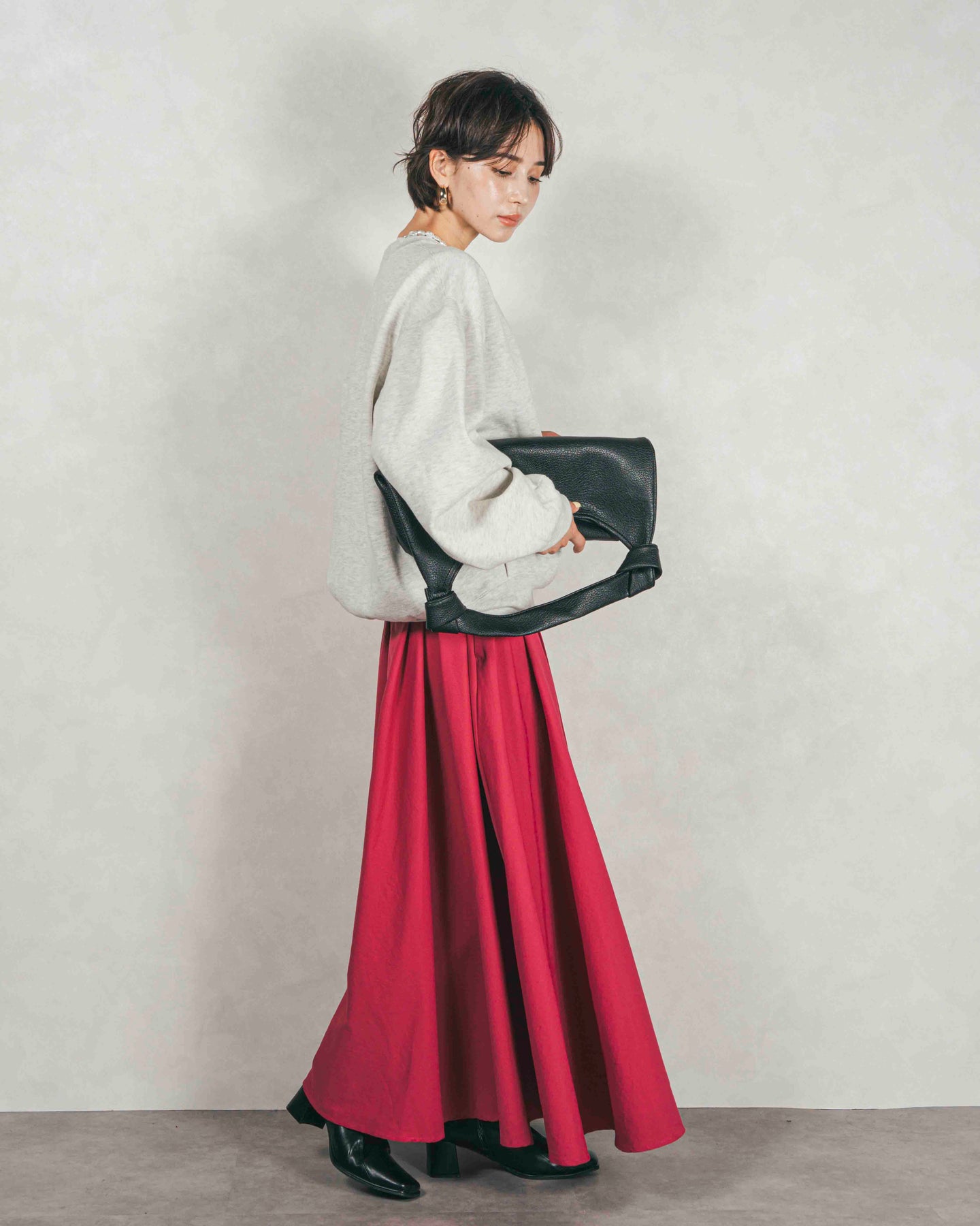 たっぷりと長さはあるものの、アシメデザインなので抜け感があり重く見えません。ボリュームあるニットやスウェットにも相性良く、合わせるトップスによってはきれいめにも着こなせる万能スカート。デイリー使いに便利なポケットも◎