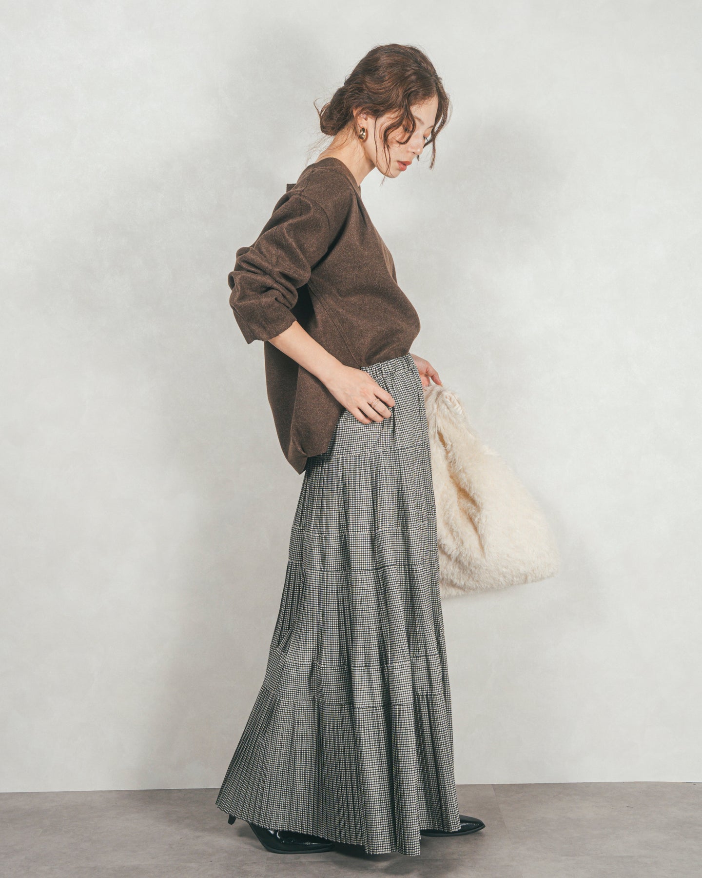 スカートにボリュームがあるため、トップスをコンパクトにまとめる定番のスタイルはもちろん、あえてオーバーサイズのニットやスウェットと合わせてリラックス感ある今っぽいムードを楽しむのも◎