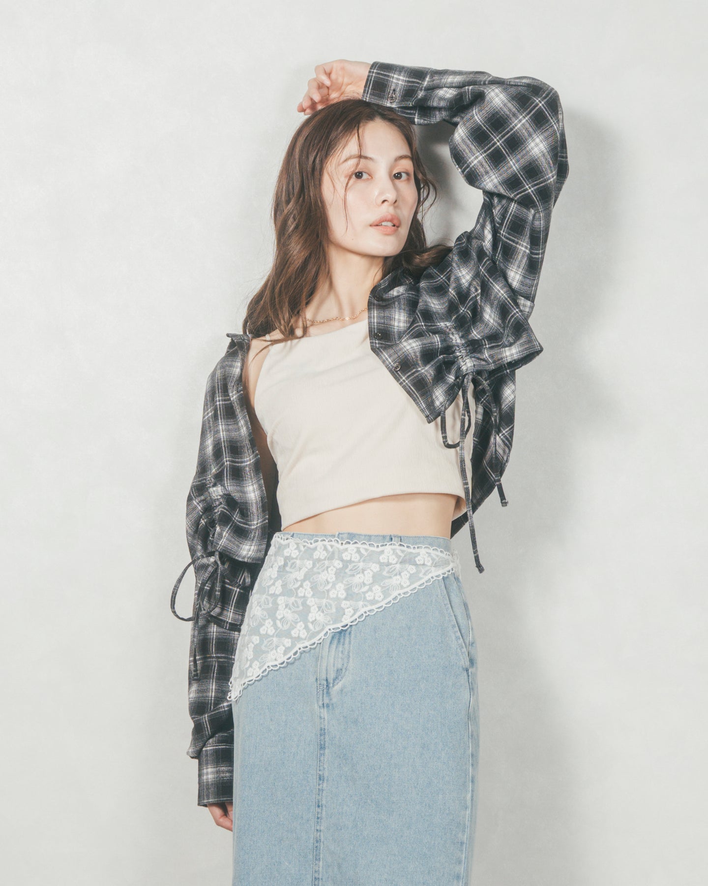[SET]裾ドロストクロップドチェックシャツ+フロントスリット Iラインデニムスカート(2SET)