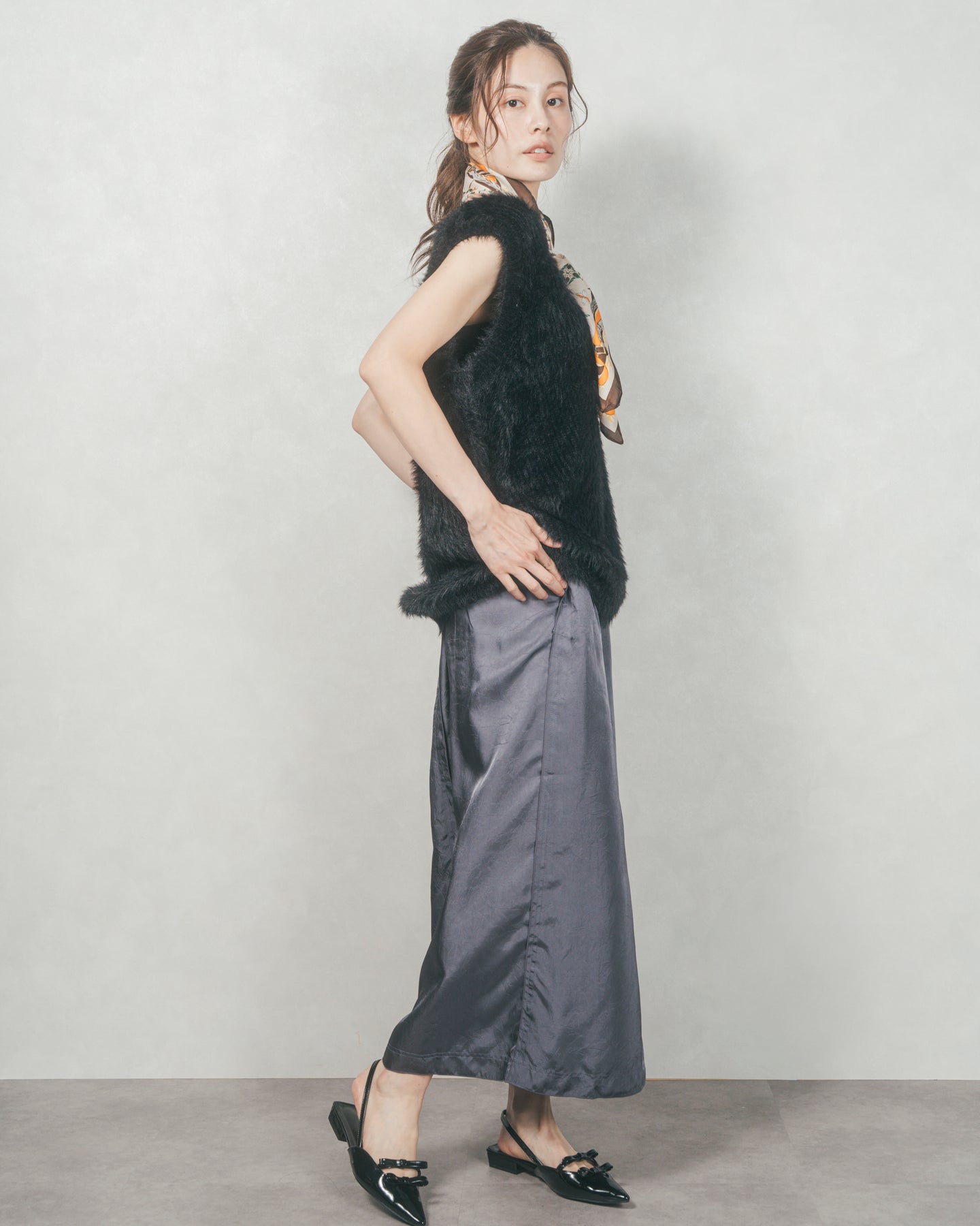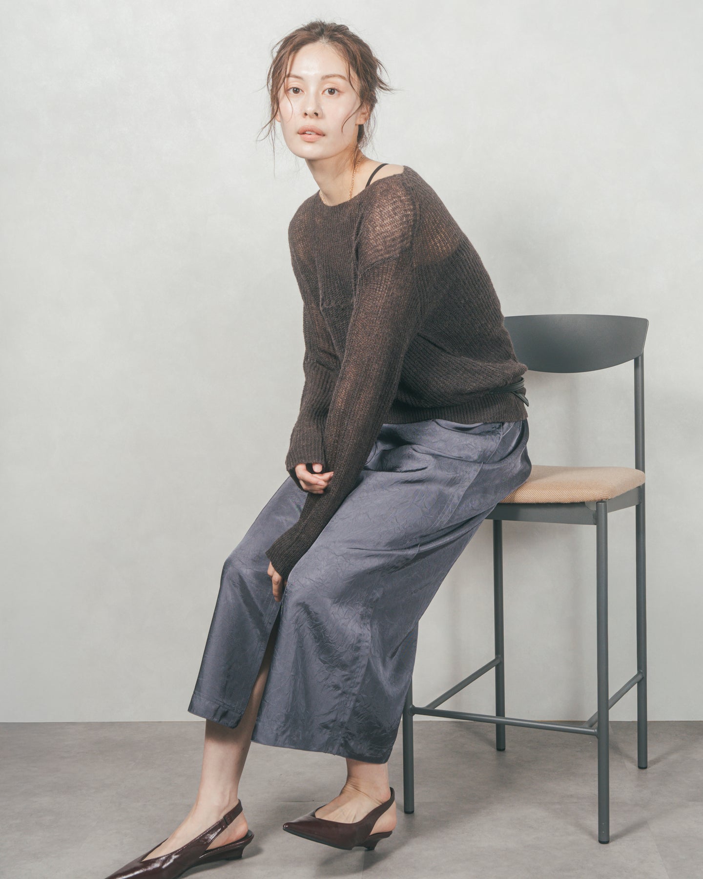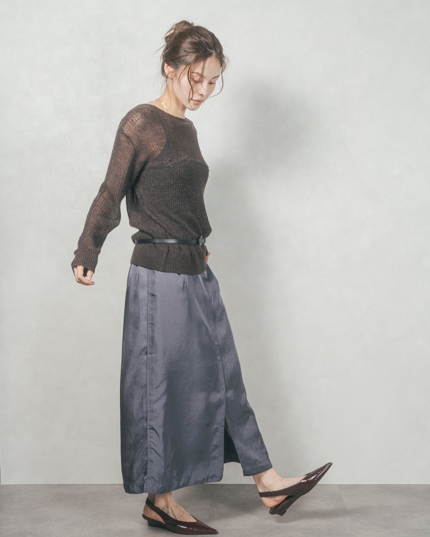 繊細なツヤ感のあるサテン素材に、裾にはメロウ始末を施して、ほんのりカジュアルなムードをひとさじ。きれいめすぎず、毎日のコーデに自然と馴染む絶妙なバランスに仕上げました。裏地付きで透ける心配もなく、デイリーに安心して着られるのも嬉しいポイント。