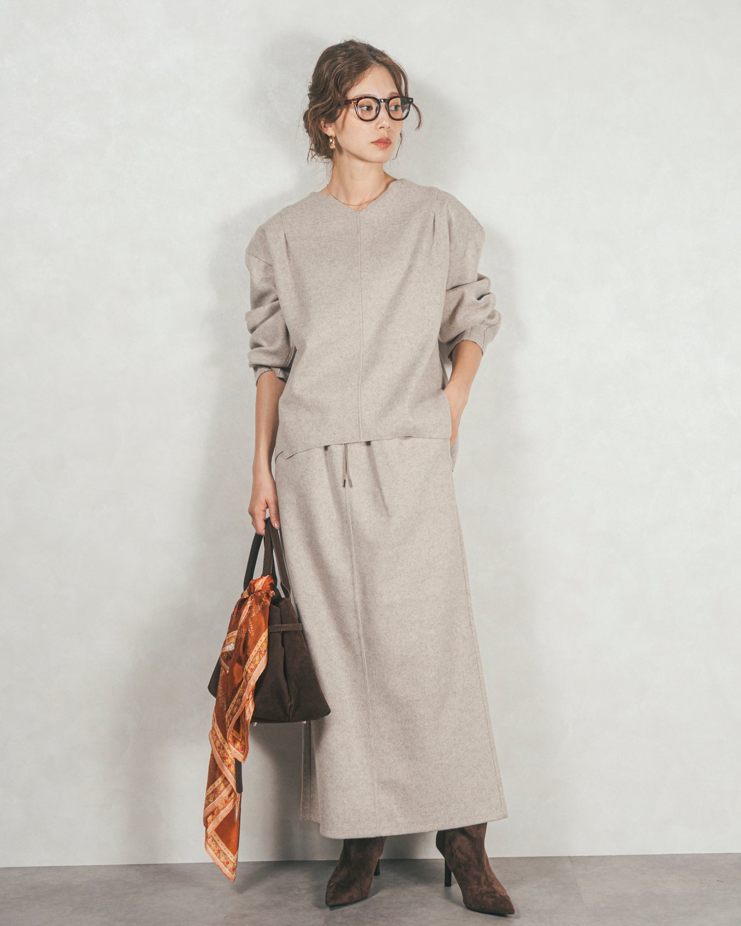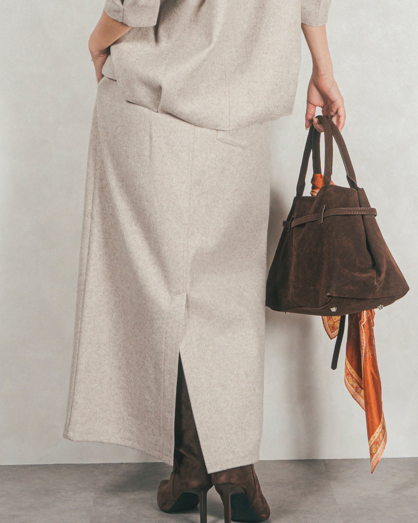 ボリュームのあるトップスとも相性が良い、万能なナロースカート。トップスをインしてもすっきりときれいに決まります。