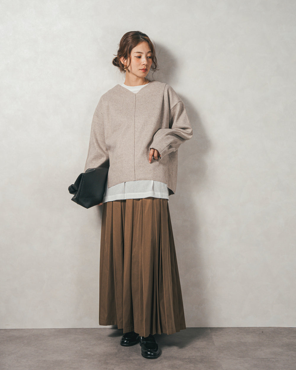 [SET]Smoothニットソー Vネックプルオーバー+プリーツティアードLongスカート