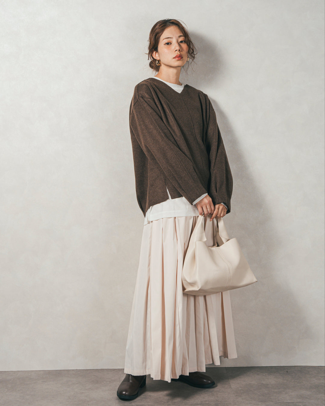 [SET]Smoothニットソー Vネックプルオーバー+W-Tuckプリーツロングスカート(2SET)