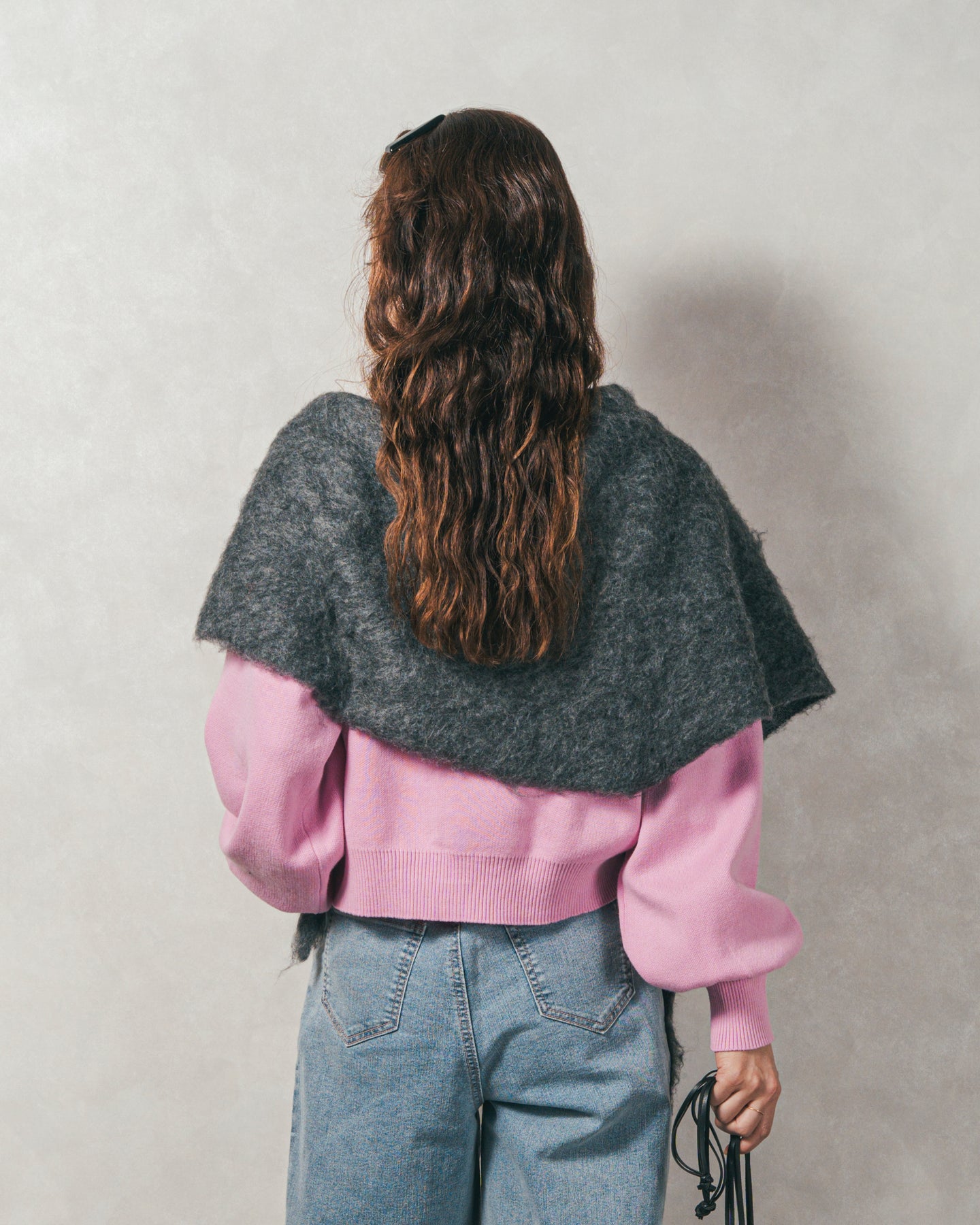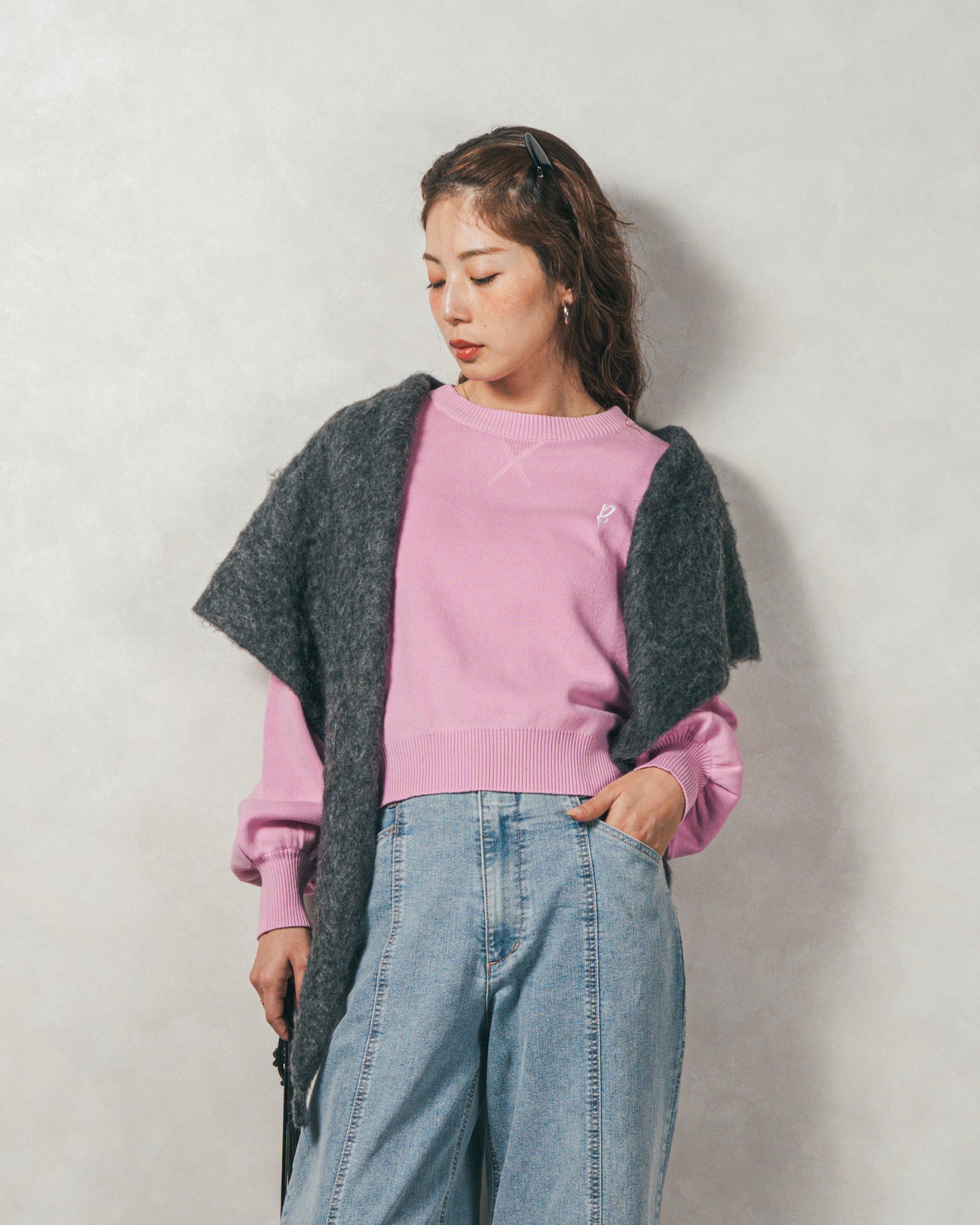 一見するとスウェットのようですが、実はチクチク感のないやわらかな肌触りのニット。スウェットよりもカジュアルになりすぎずきれいめな印象をキープします。クロップド丈は腰の位置が高く見えるので、スタイルアップ効果ばっちり。ぽわんと膨らむボリューミーなシルエットがアクセント。