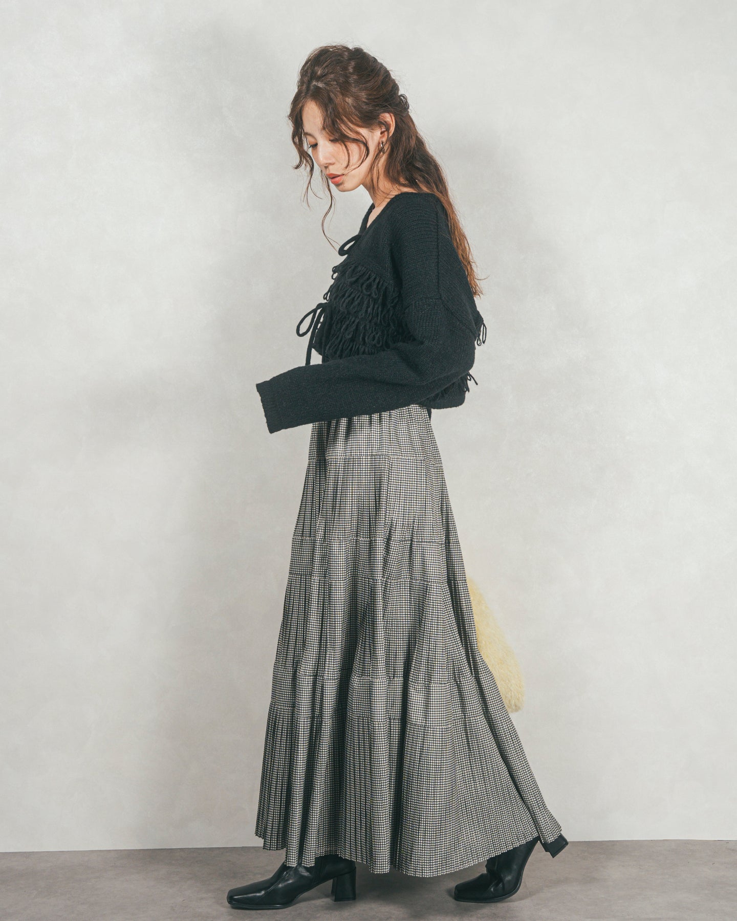 今季注目のループ編みは、羽織るだけでコーデのポイントに。やや短めの丈感がバランスよく、トレンドを取り入れながらも気負わずに着られる、ワードローブに加えておきたい一着。