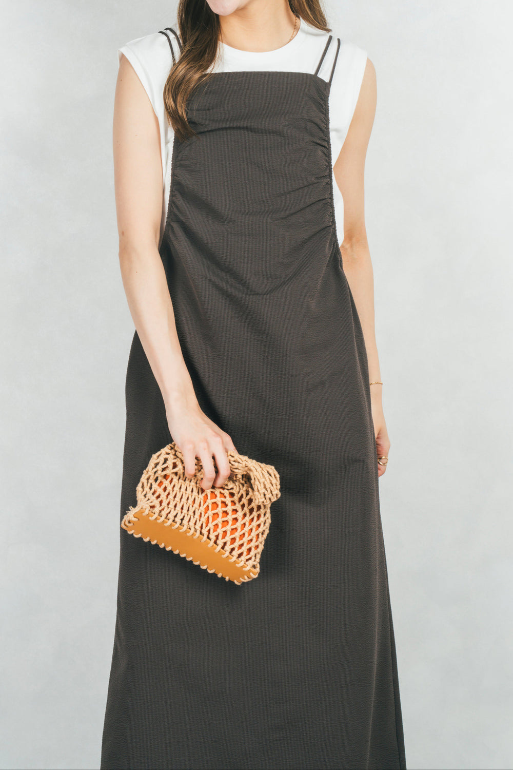 ギャザーデザインが特徴のキャミワンピース。華奢な肩ひもが女性らしく、長さも調節可能です。撥水加工がされていて、レジャーシーンにも。細かなでこぼこがある素材感で、肌触りが良く夏にぴったりな素材です。Tシャツやタンクトップ、キャミソールなどインナー次第でカジュアルにもフェミニンにも着回しできるアイテムです。