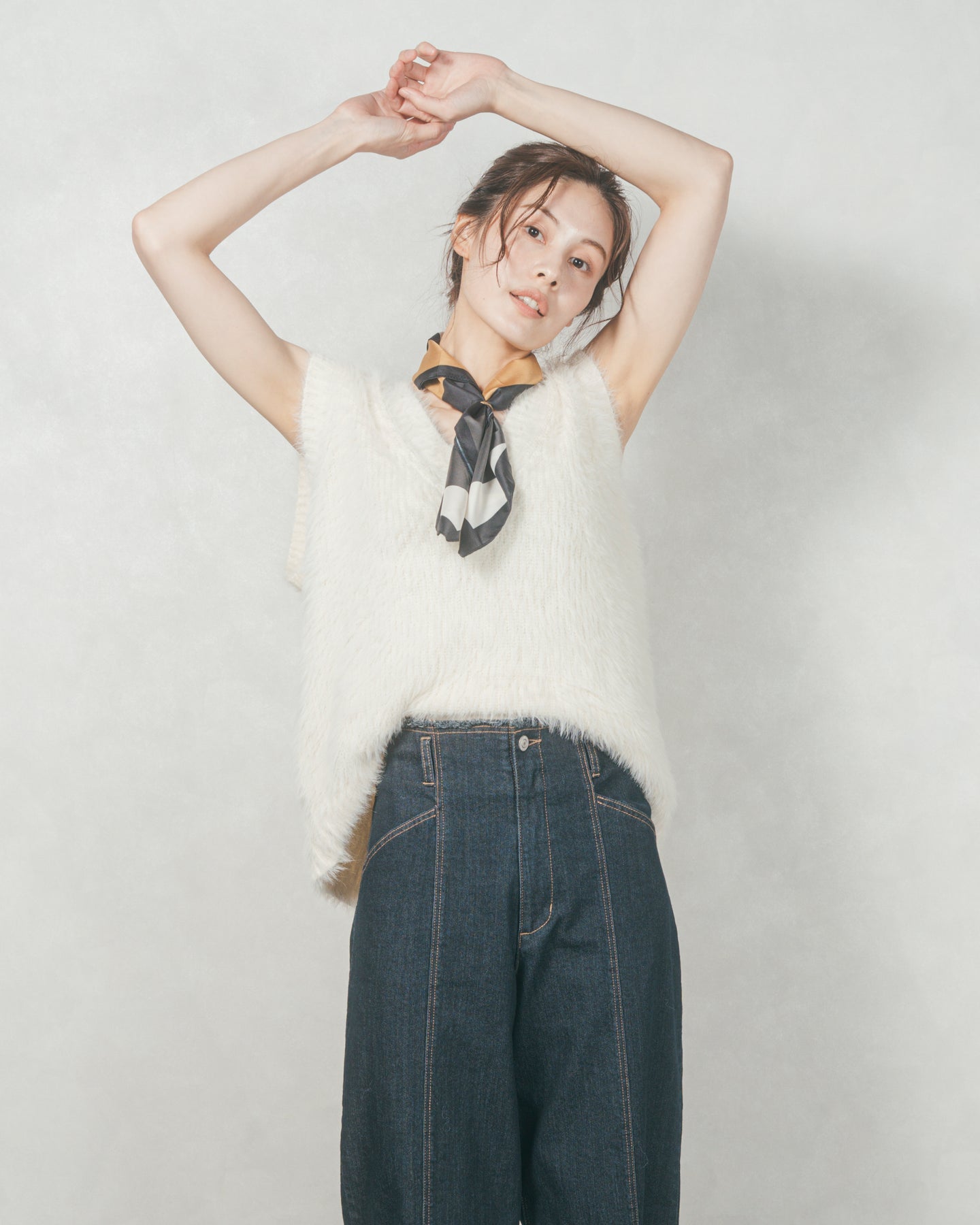 ふわっとしたフェザーニットが、やわらかく優しい雰囲気をまとわせるベストトップです。