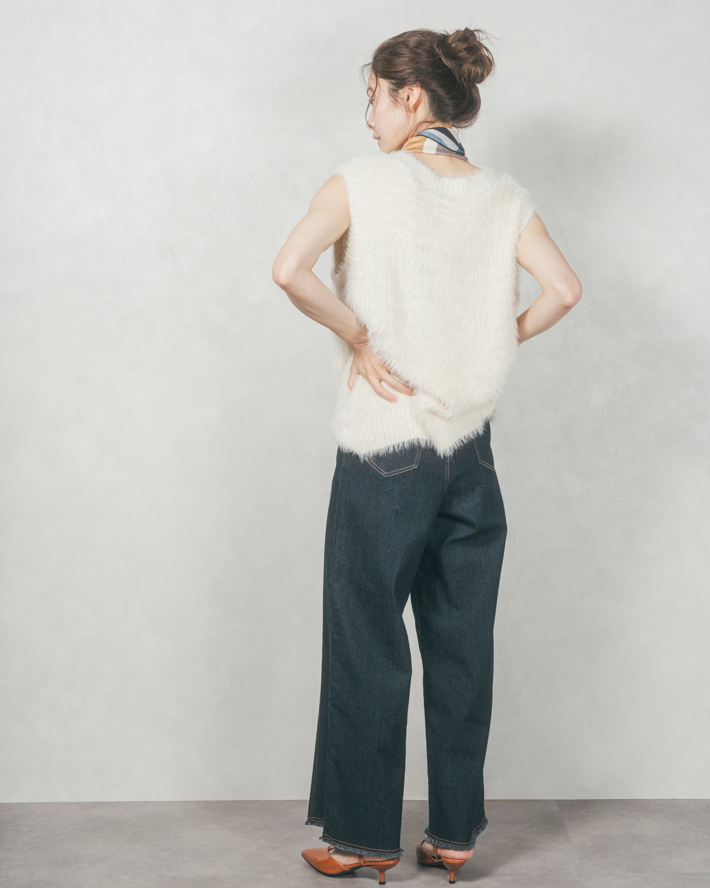 [SET]V-ネックフェザーニットベスト+センターシーム リラックスワイドデニム(2SET)