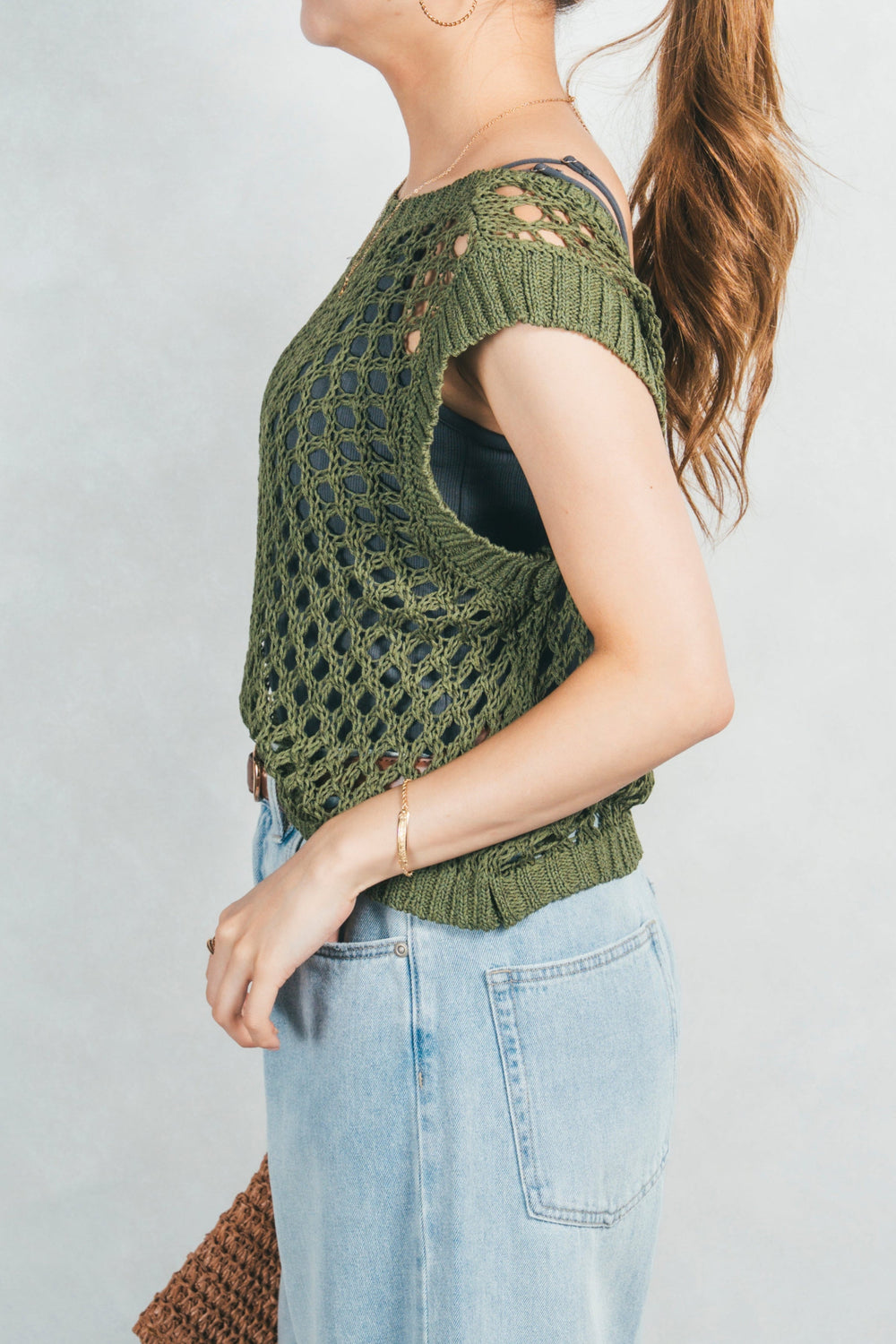 リネンのようなさらりとした質感が魅力のメッシュニットベスト。ざっくり編みのメッシュデザインが、夏のレイヤードにぴったりです。前後どちらでも着用できる2WAY仕様で、ネックラインの見え方を気分やスタイリングに合わせて変えられるのも嬉しいポイント。