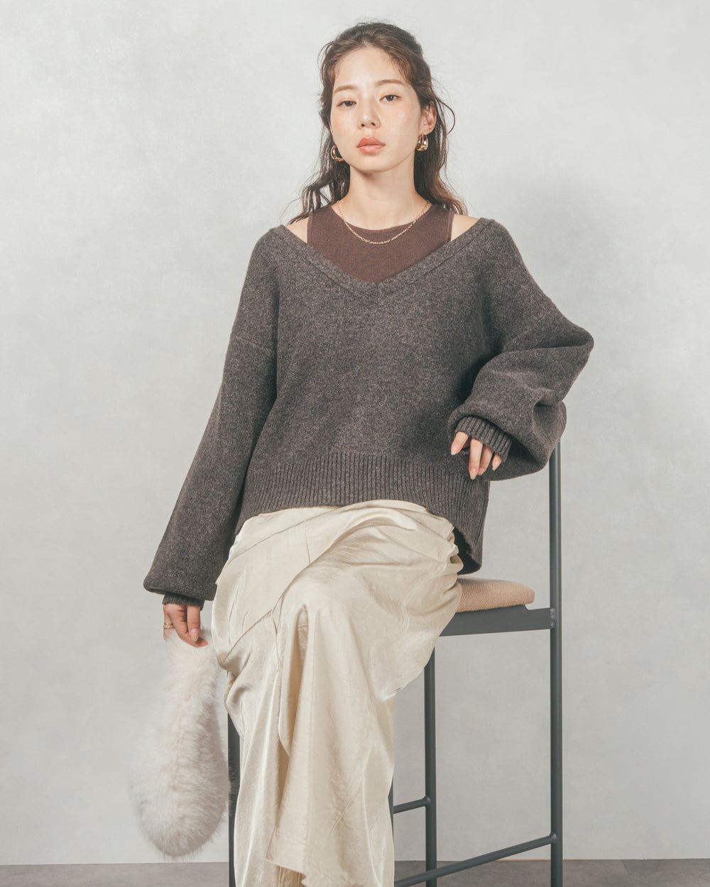 [SET]メランジVネックニットレイヤードセット+Mellowサテン セミフレアスカート(2SET)