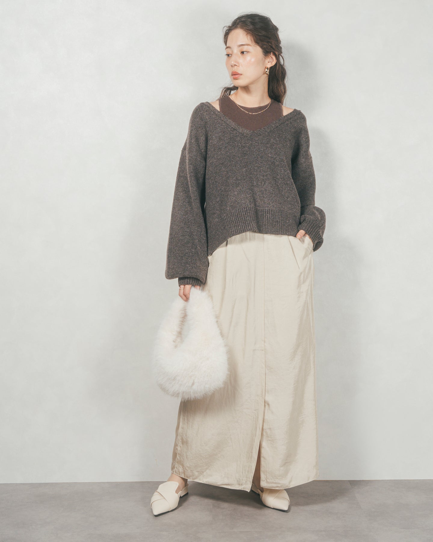 [SET]メランジVネックニットレイヤードセット+Mellowサテン セミフレアスカート(2SET)