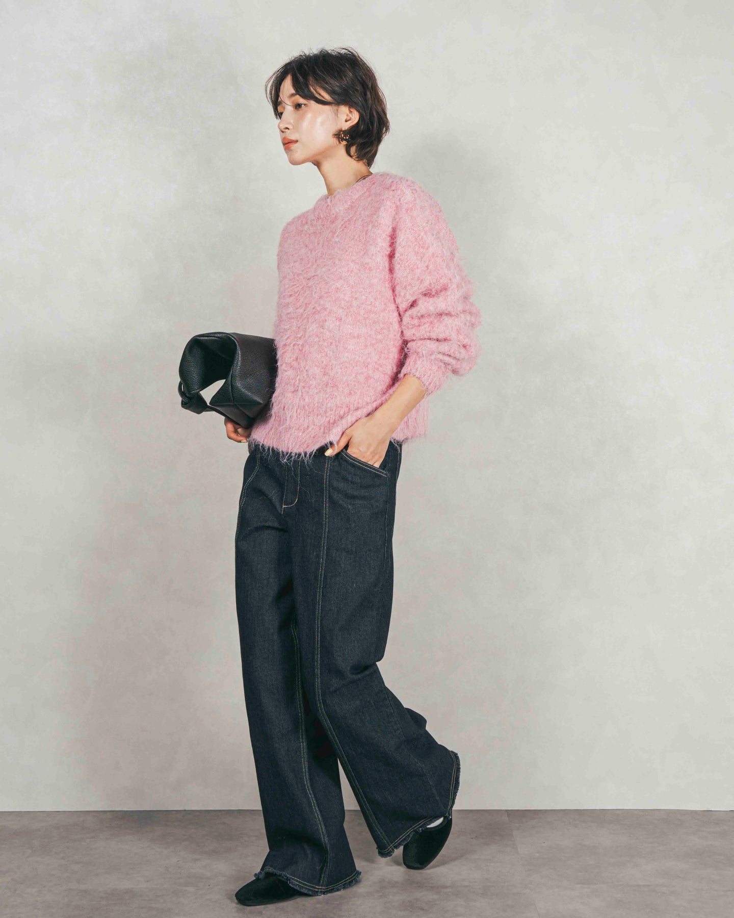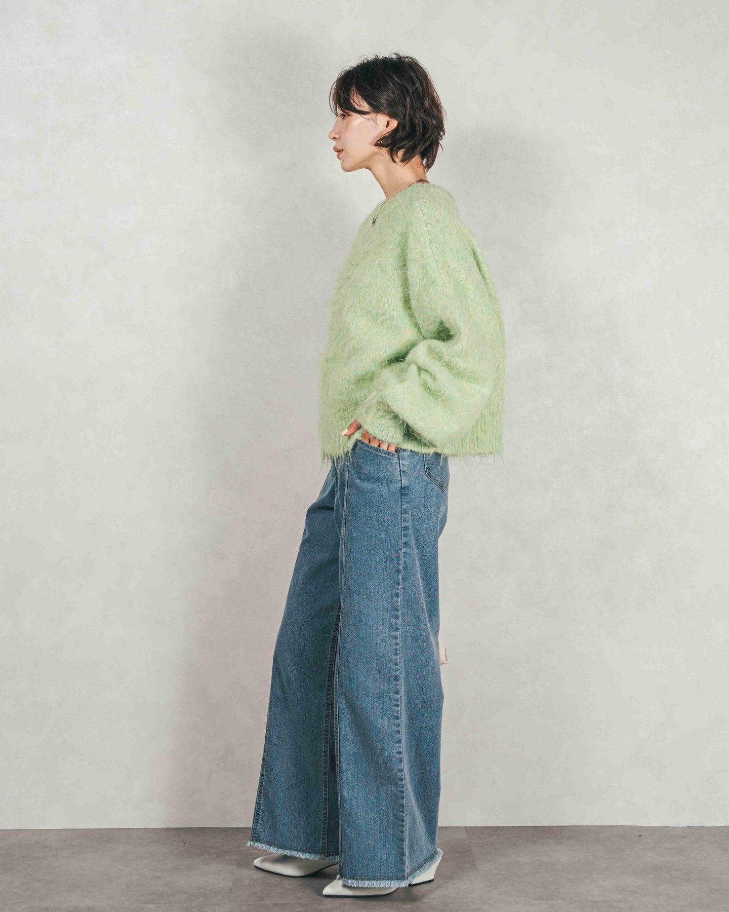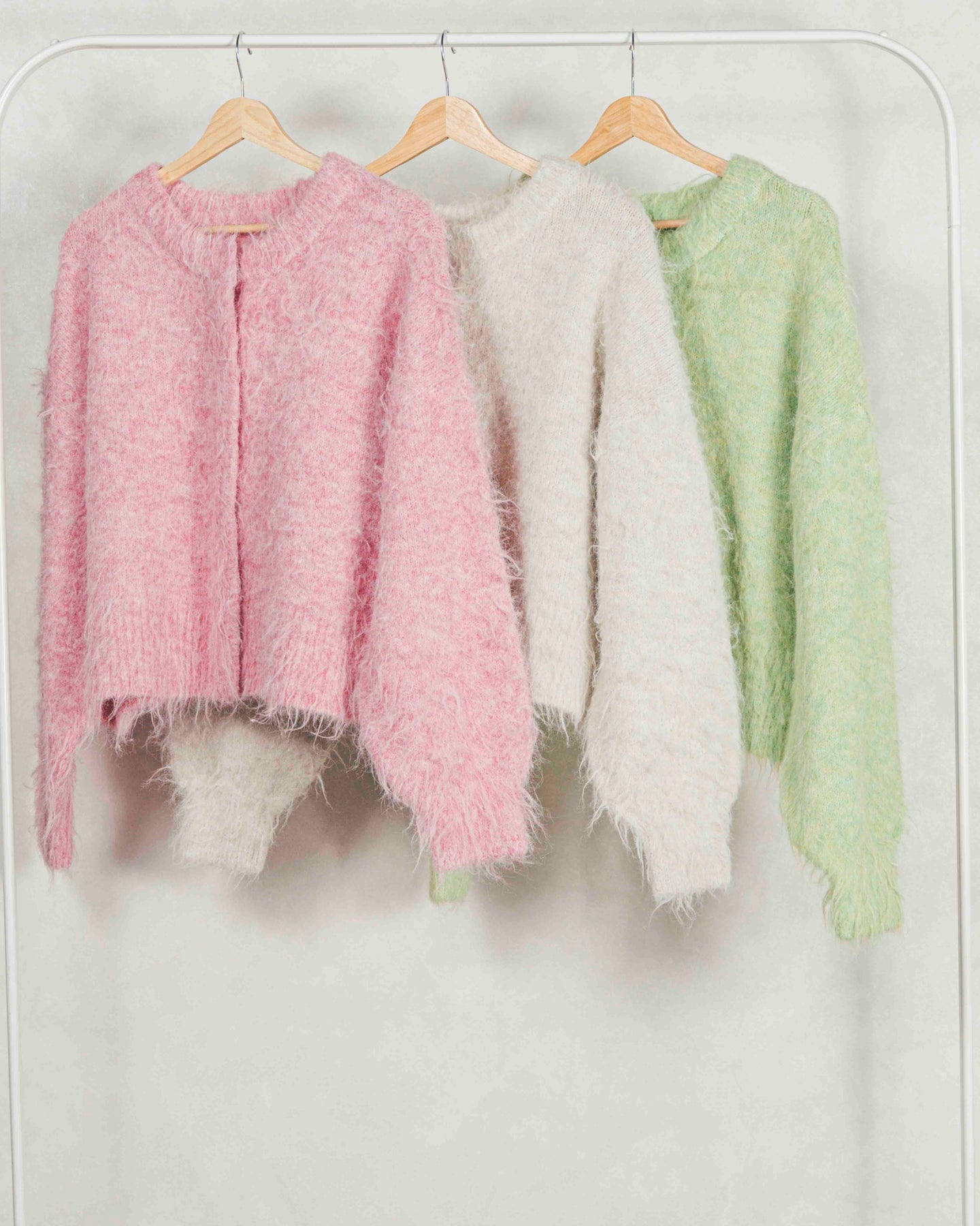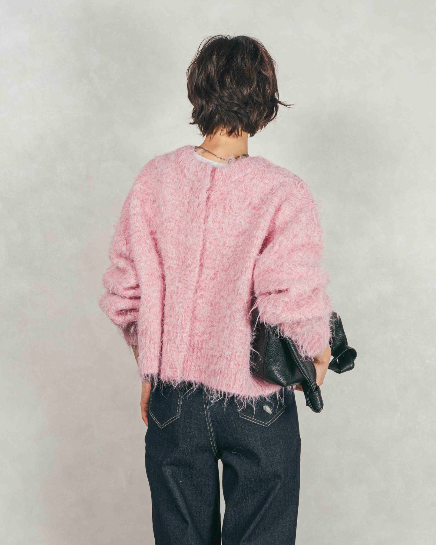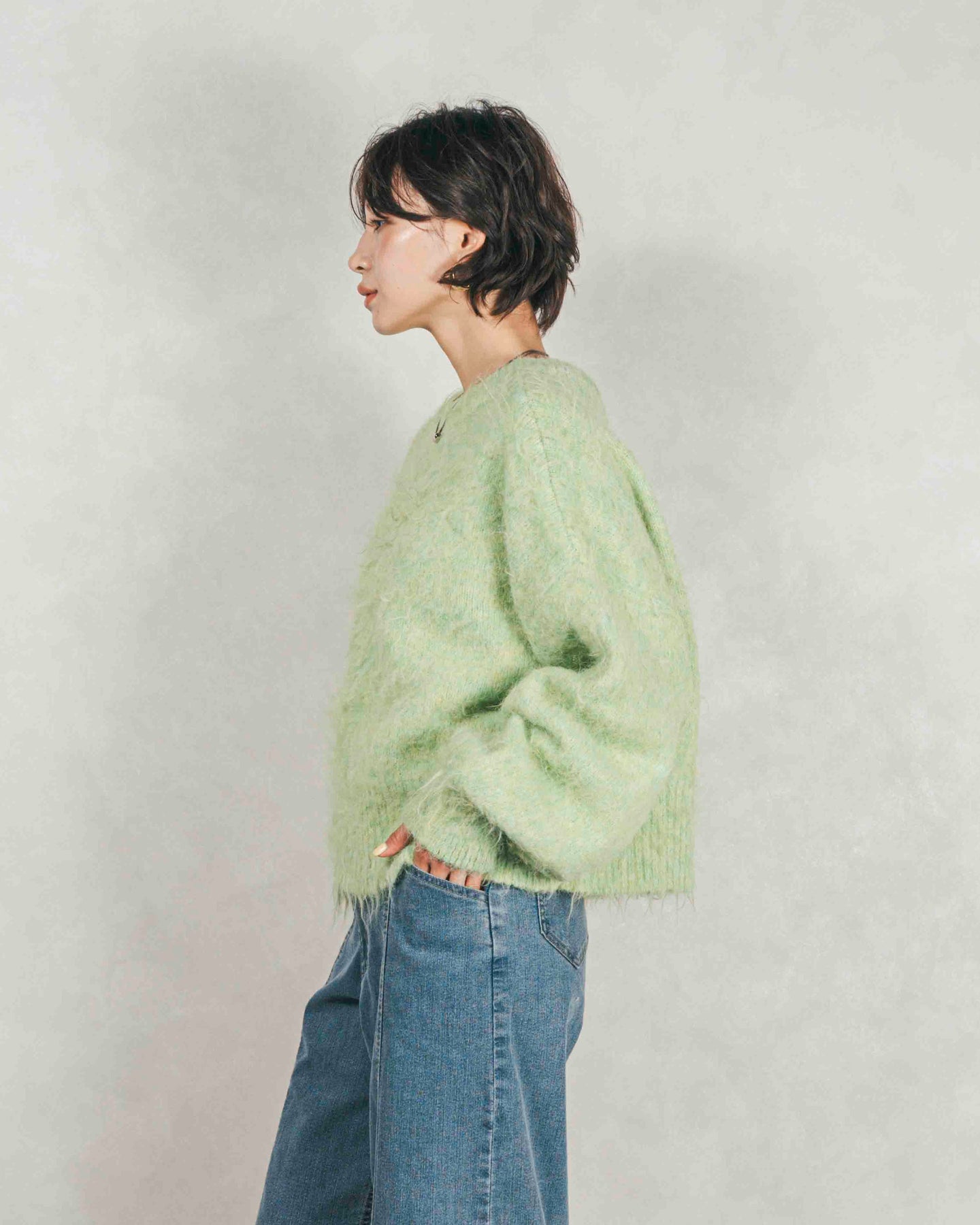 色がミックスされた、ニュアンスのある奥行きの感じる糸を使用。起毛していることで感じる、柔らかいミックス感が魅力。ふわふわとした起毛が、かわいらしさを演出するフラッフィーな素材。