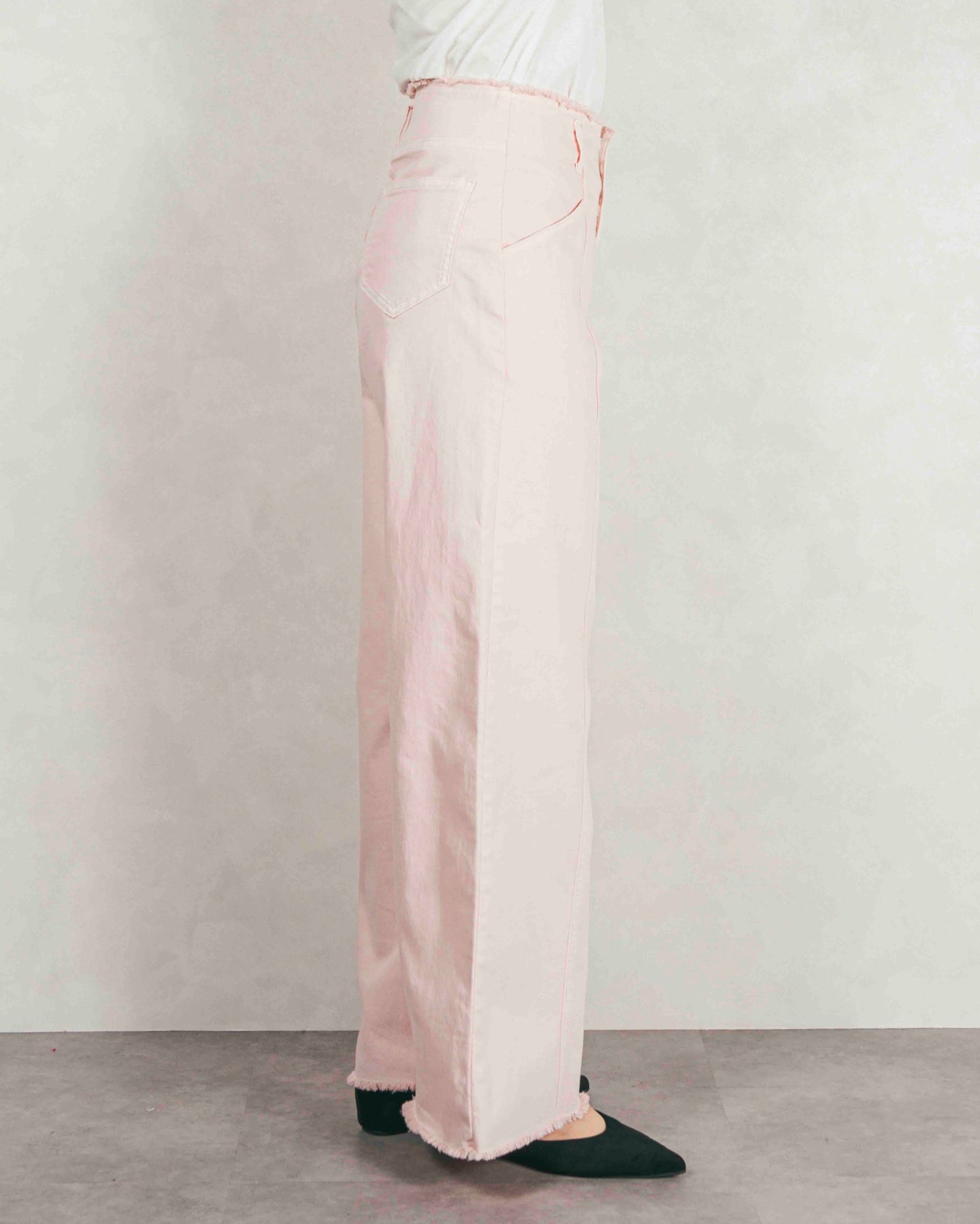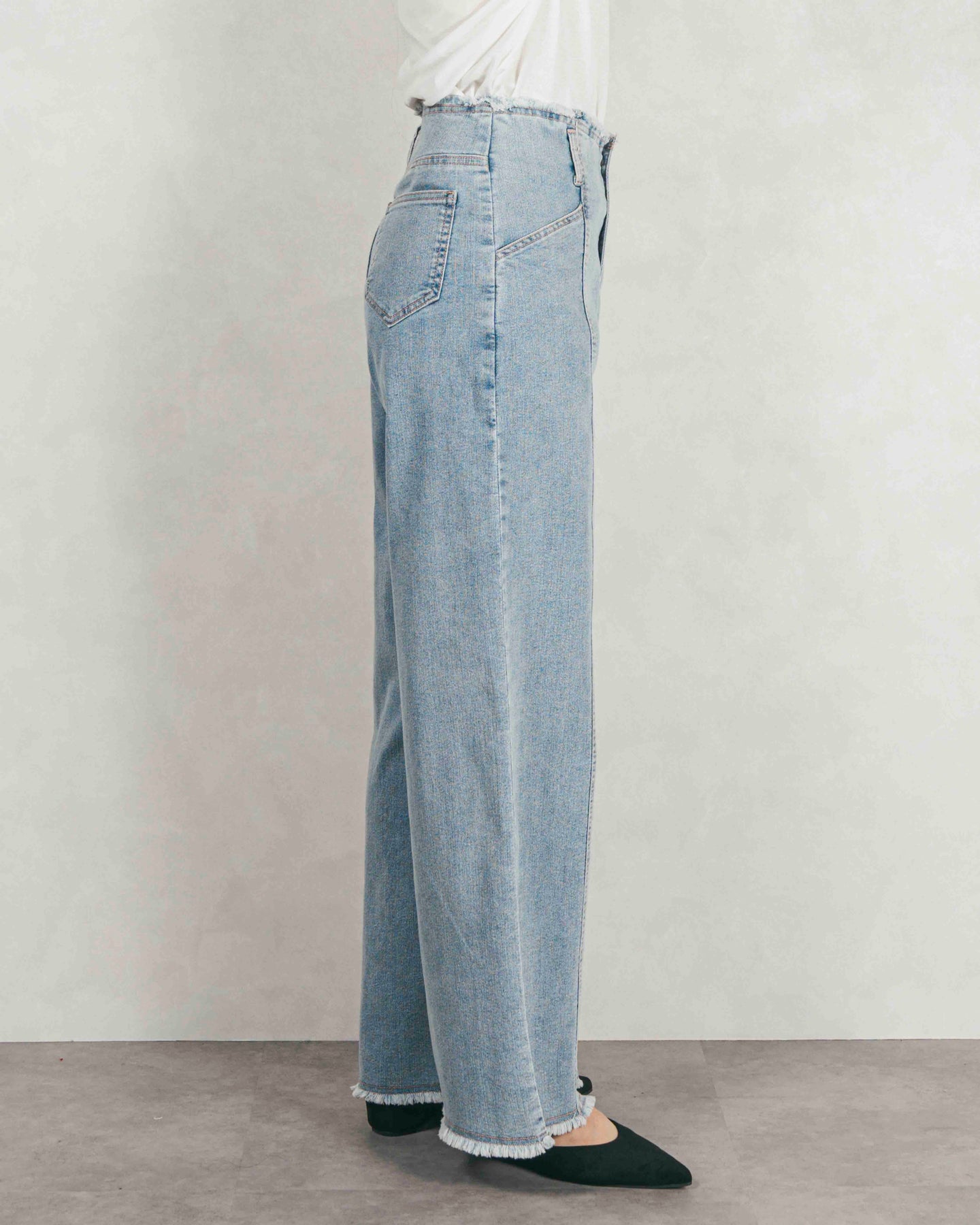 ハイウエストのシルエットはウエストまわりをスッキリと見せ、トレンドムードを作ってくれます。フロント中心にステッチを入れ、Iラインを強調することでスタイルアップを実現◎カットオフで仕上げたウエストがこなれ感をプラスします。