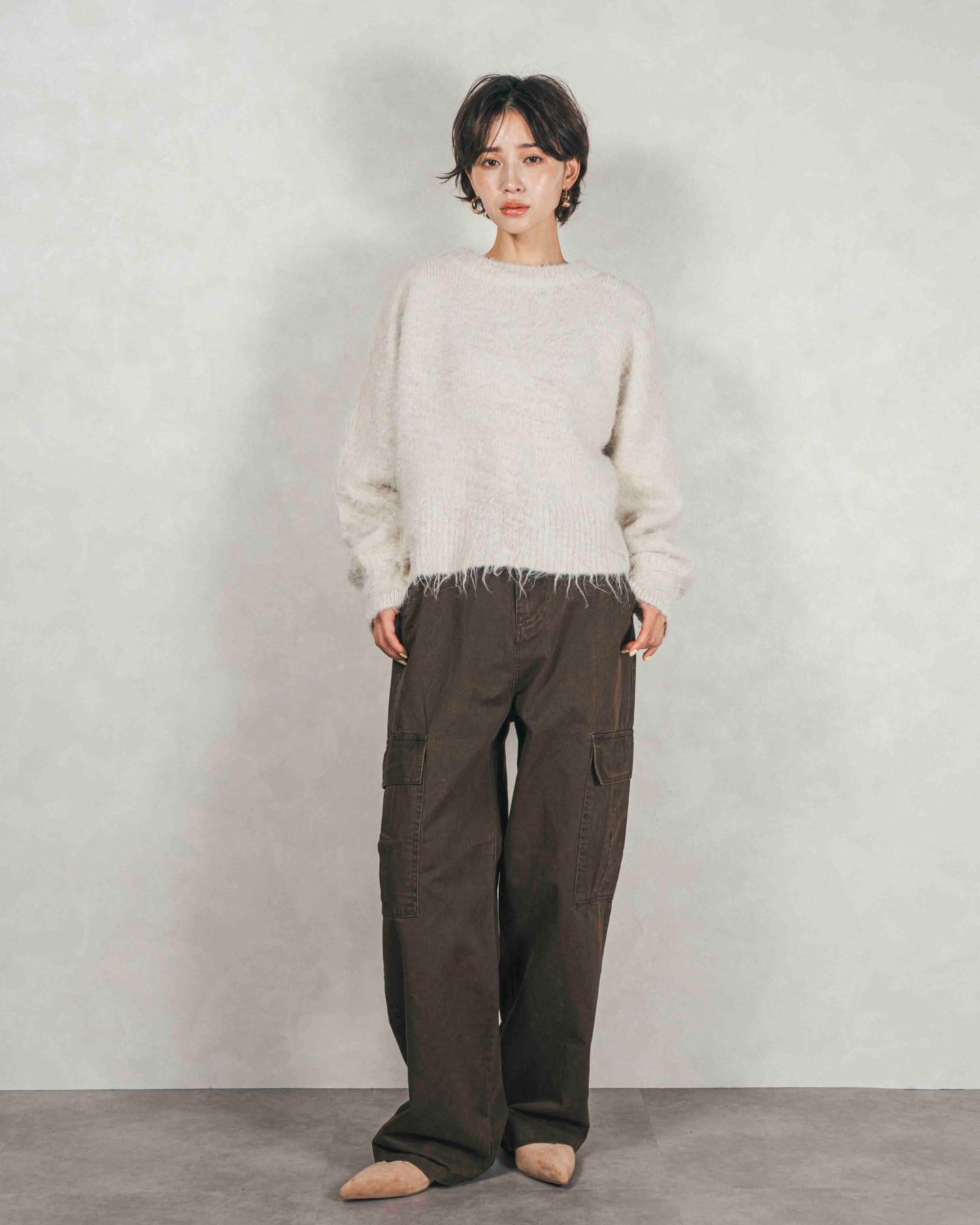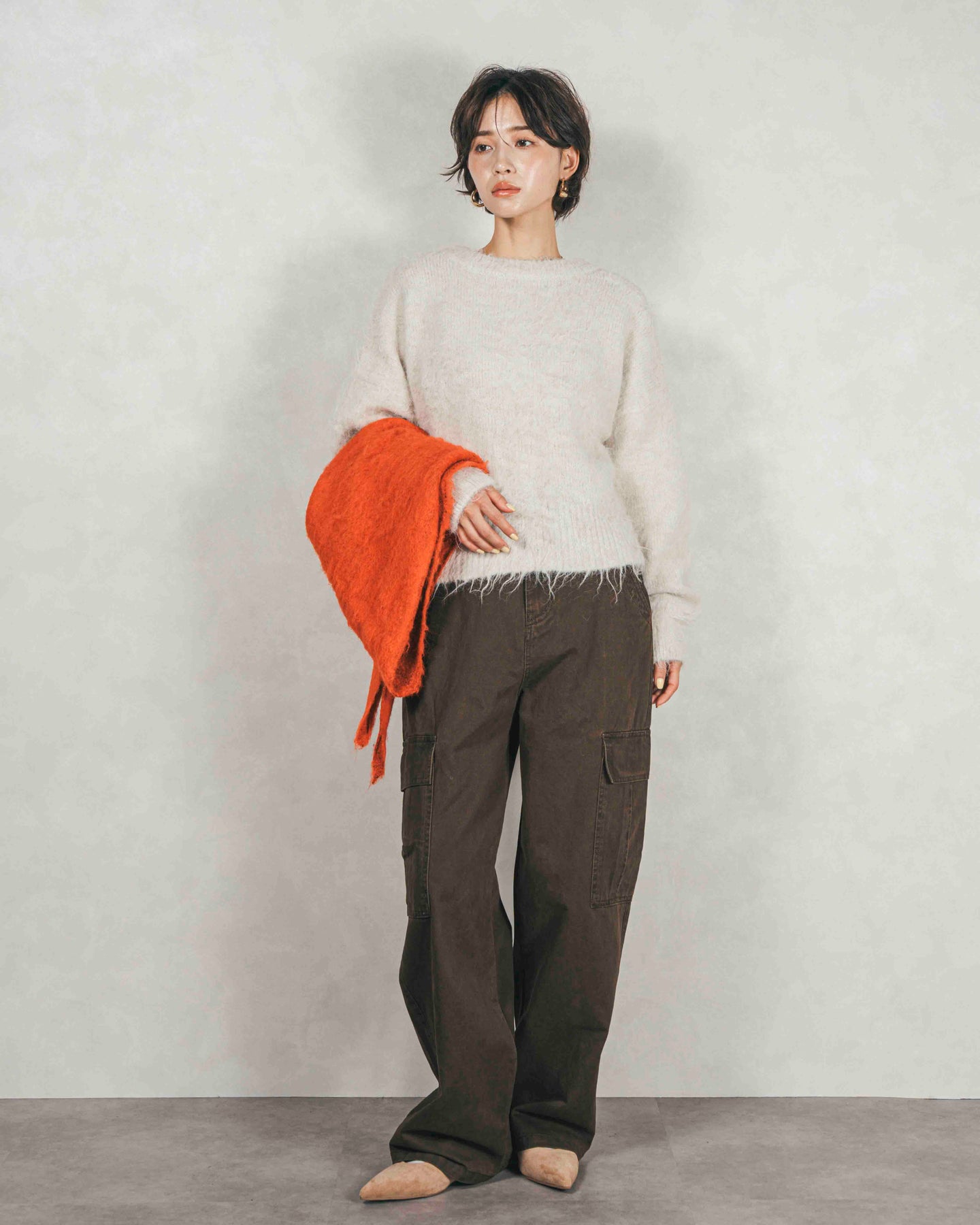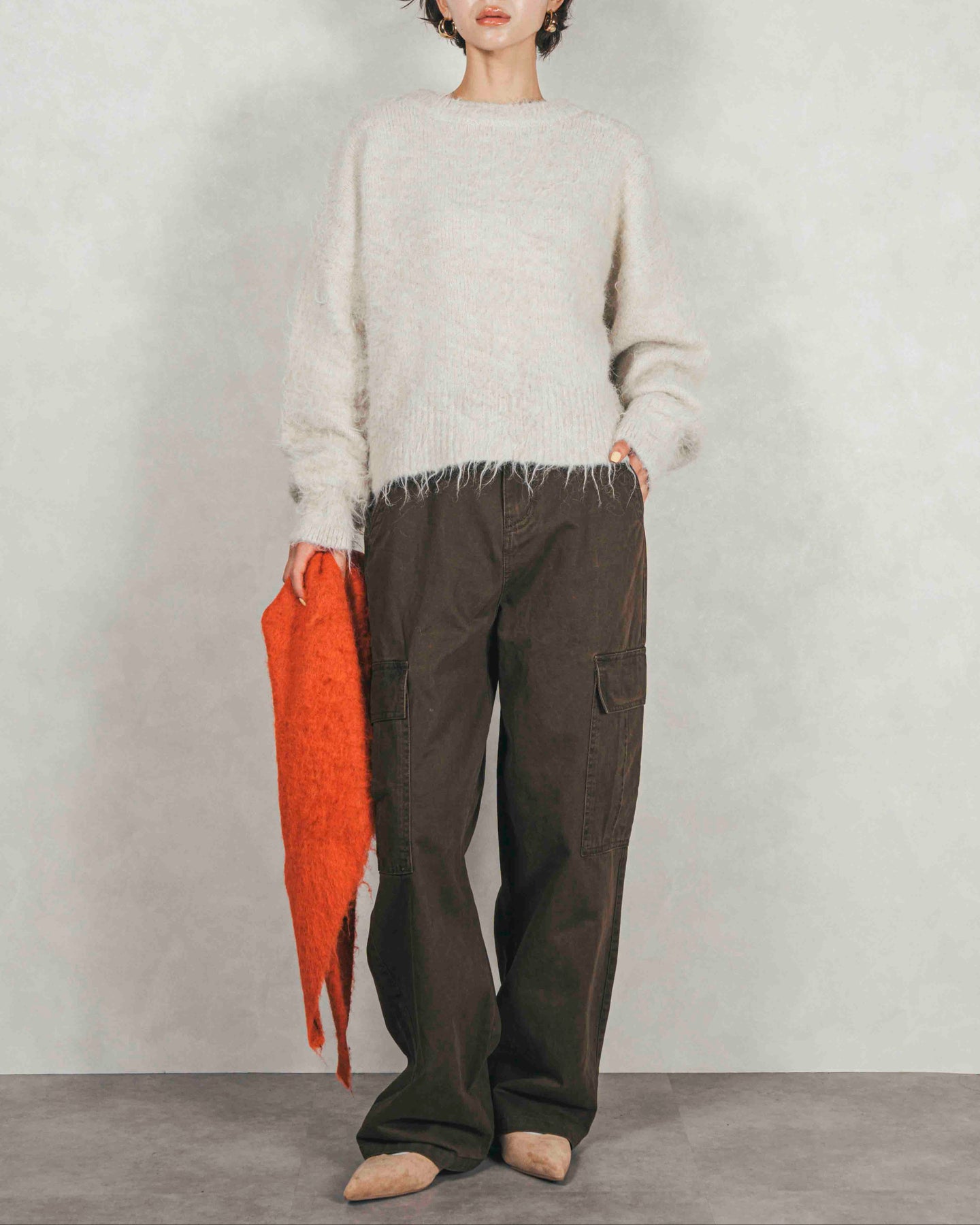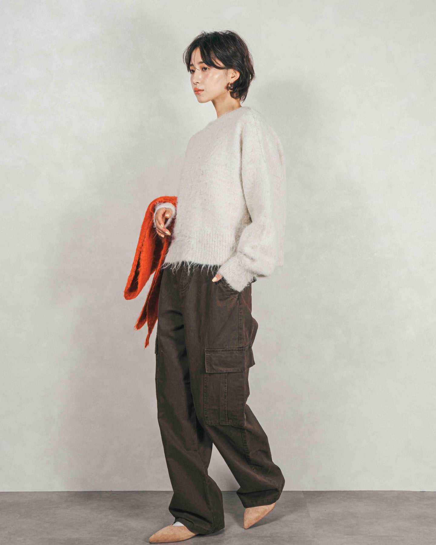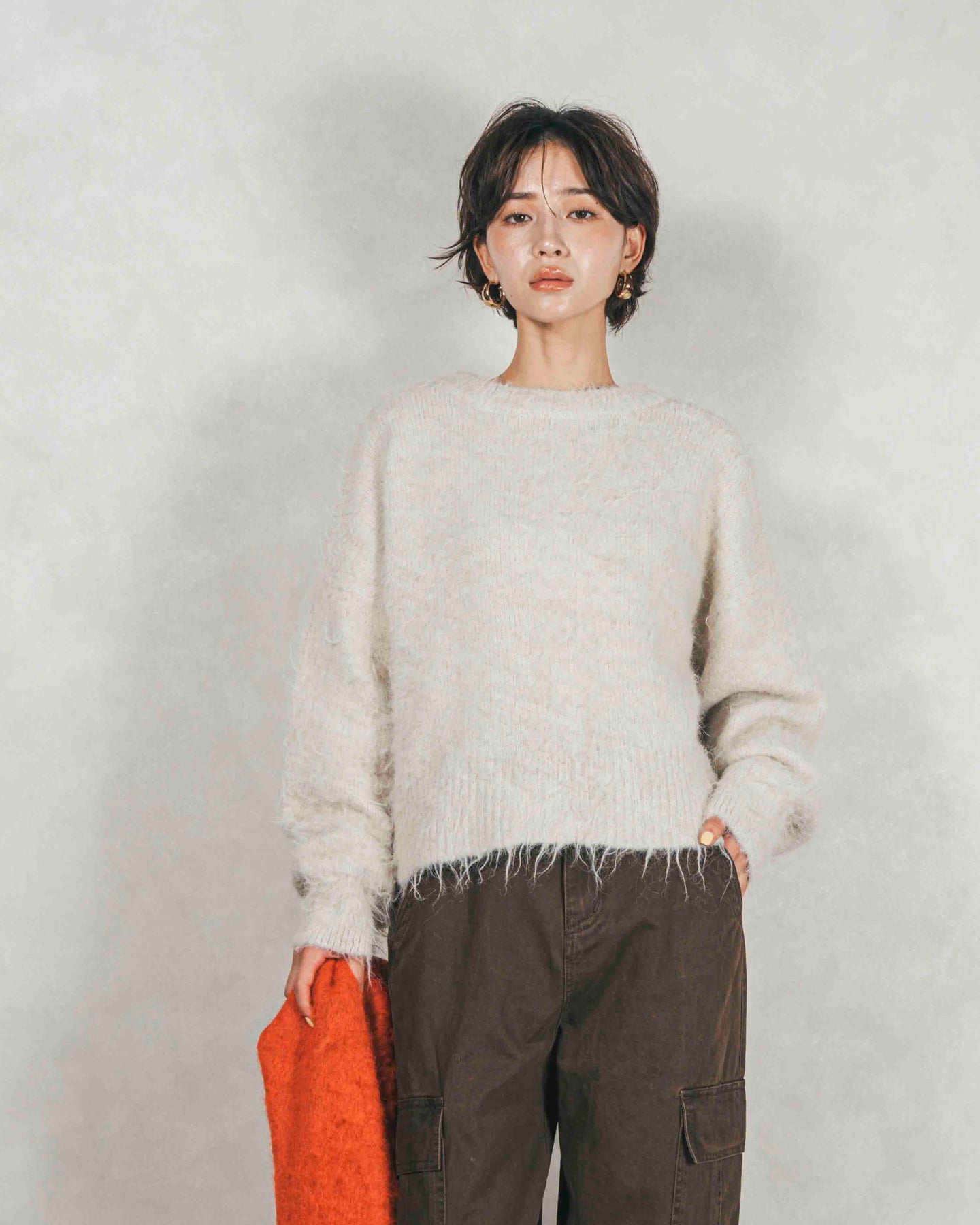 色がミックスされた、ニュアンスのある奥行きの感じる糸を使用。起毛していることで感じる、柔らかいミックス感が魅力。ふわふわとした起毛が、かわいらしさを演出するフラッフィーな素材。