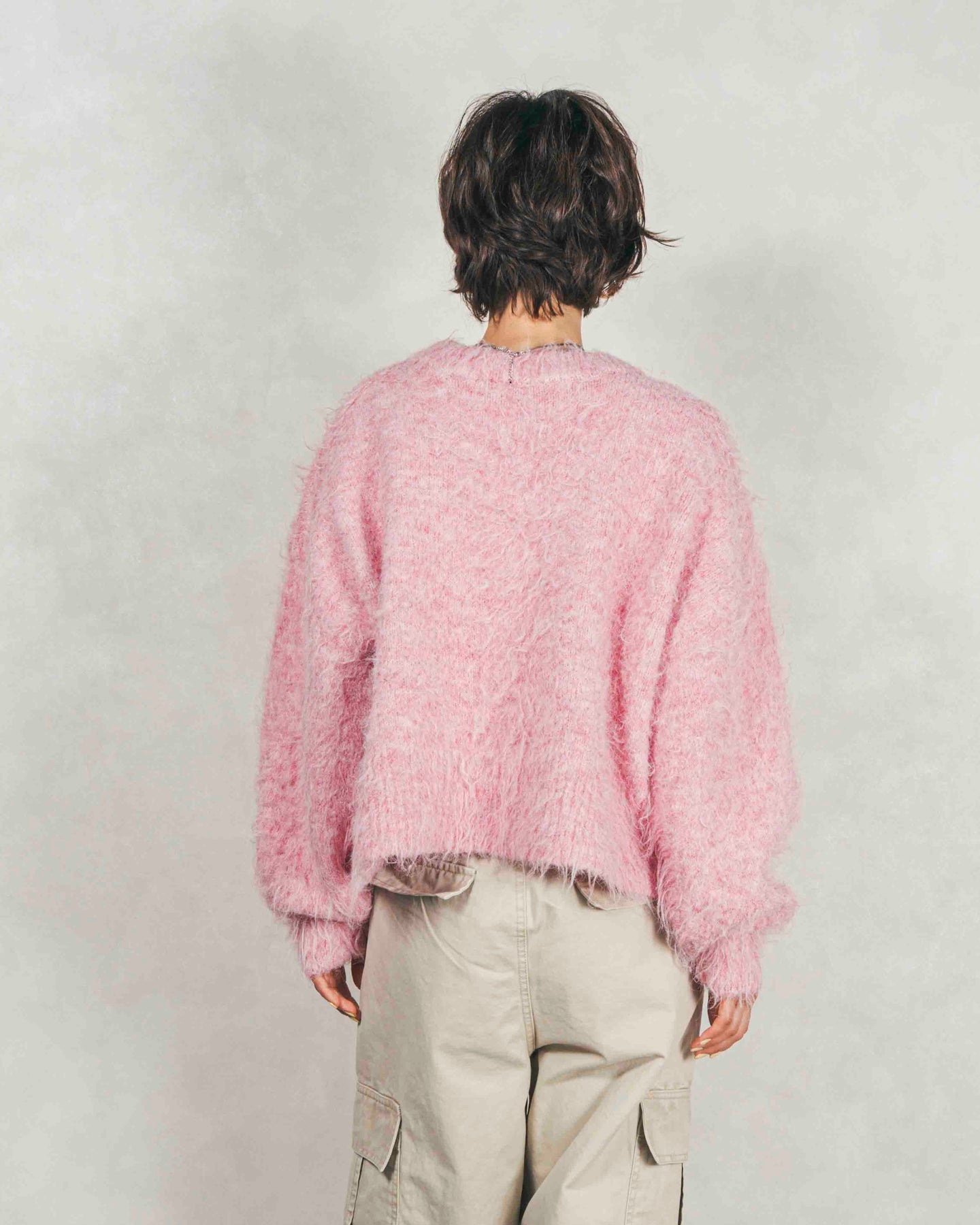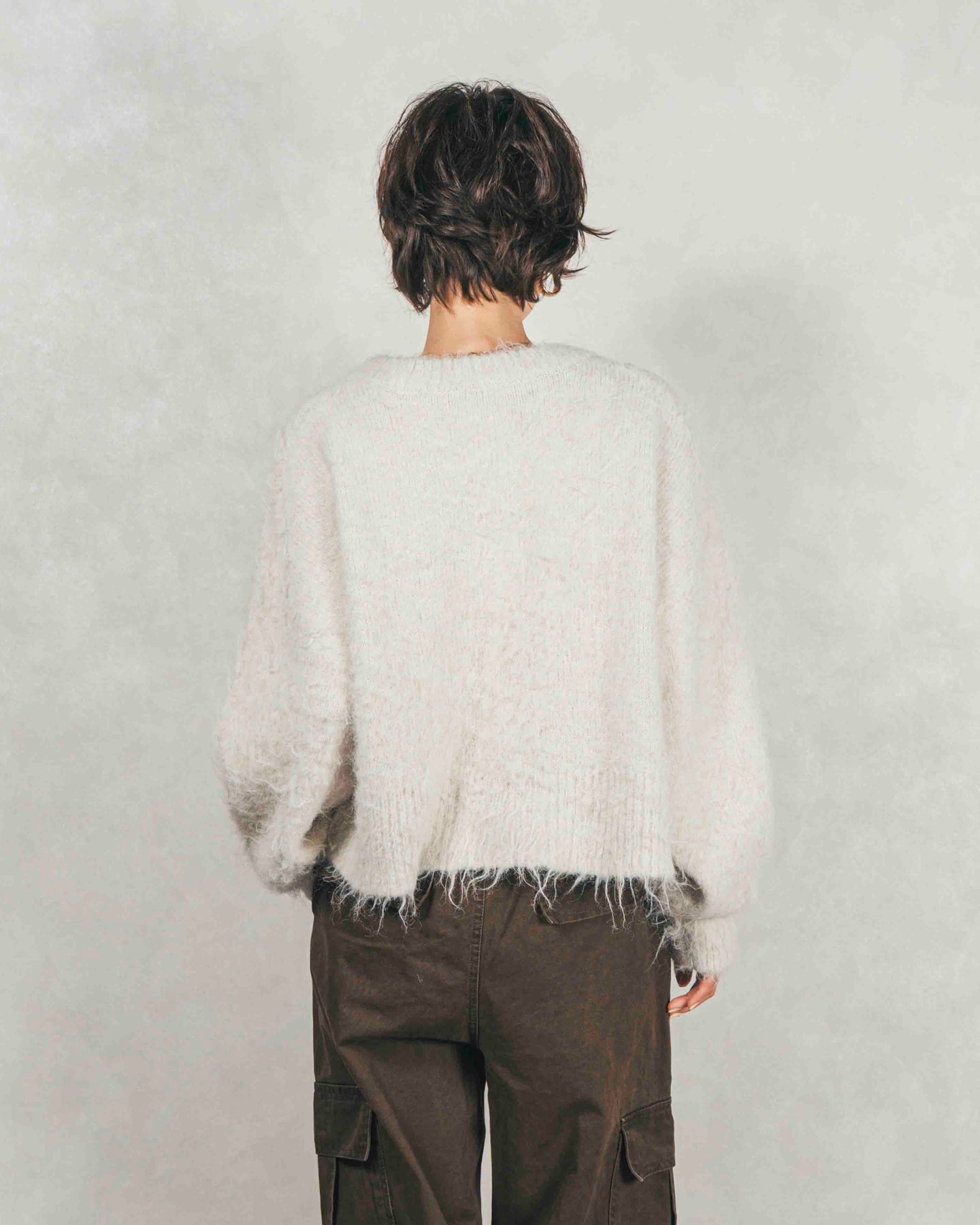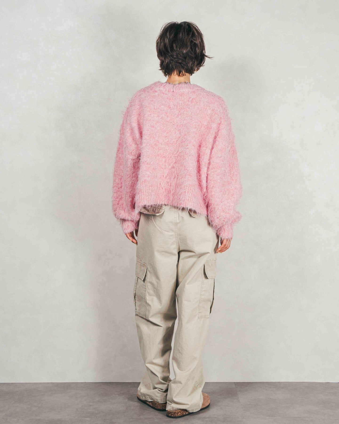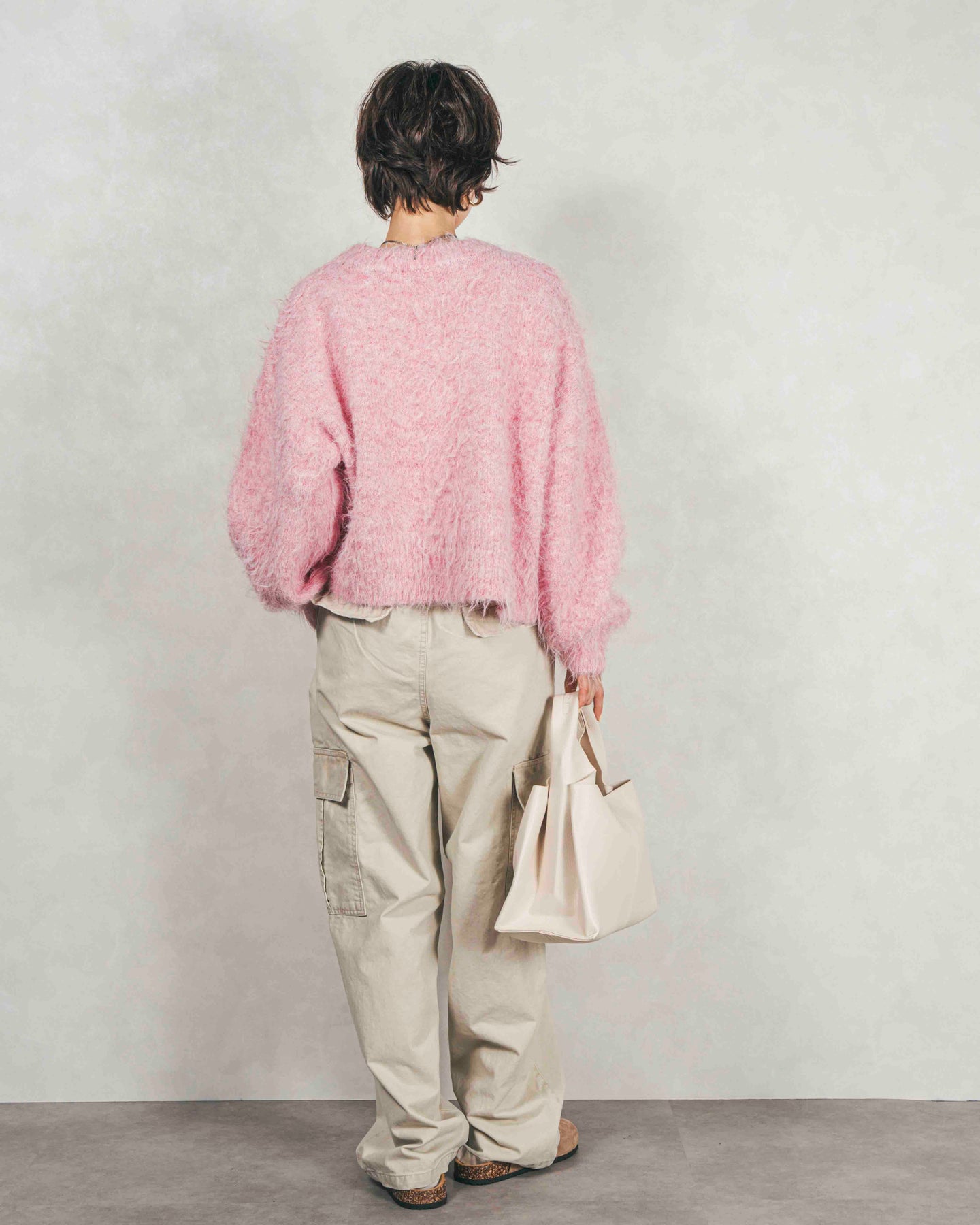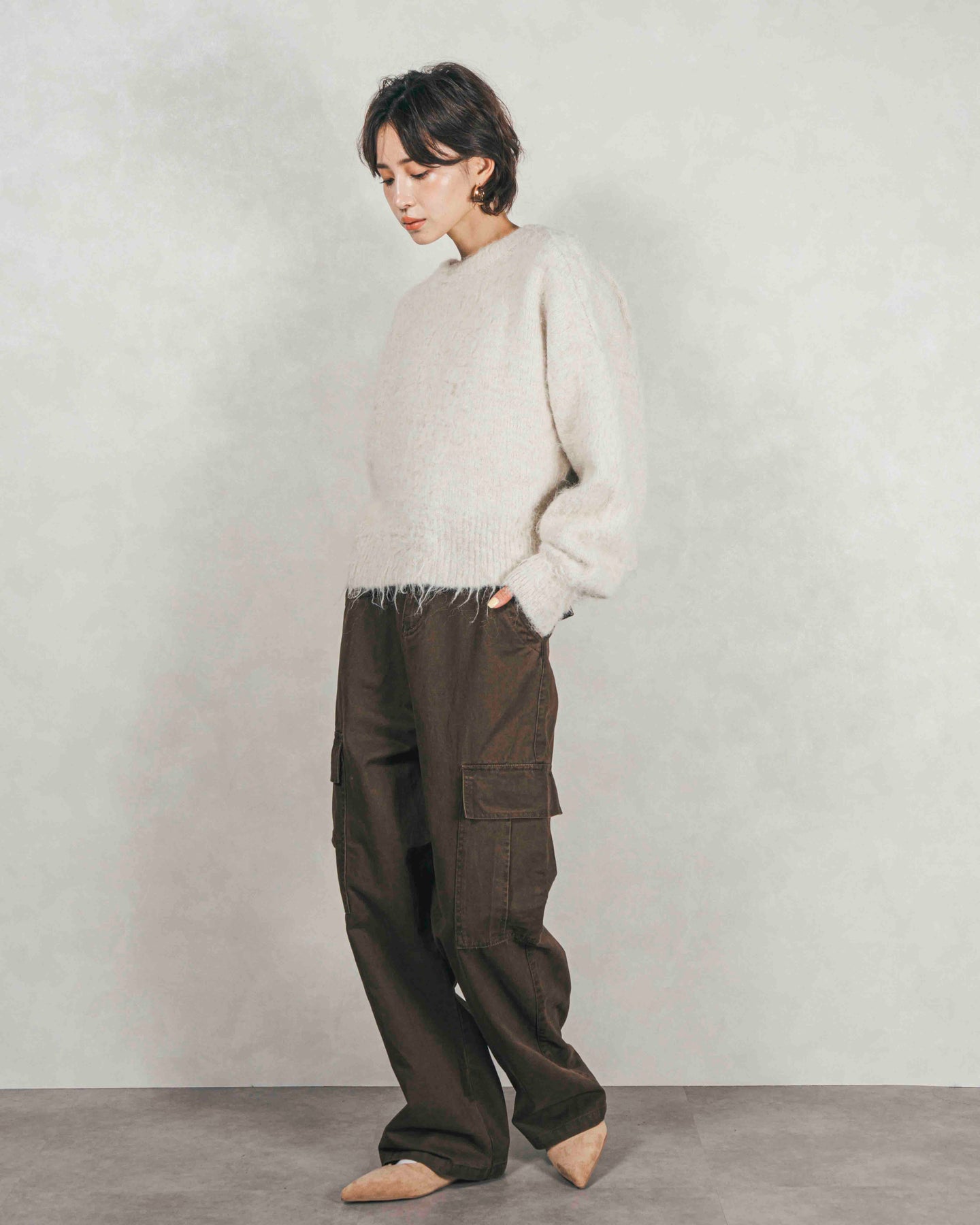 色がミックスされた、ニュアンスのある奥行きの感じる糸を使用。起毛していることで感じる、柔らかいミックス感が魅力。ふわふわとした起毛が、かわいらしさを演出するフラッフィーな素材。
