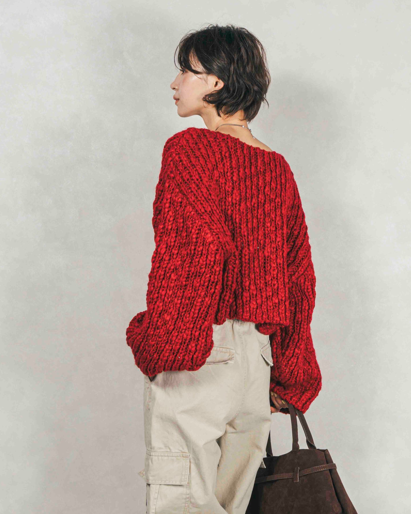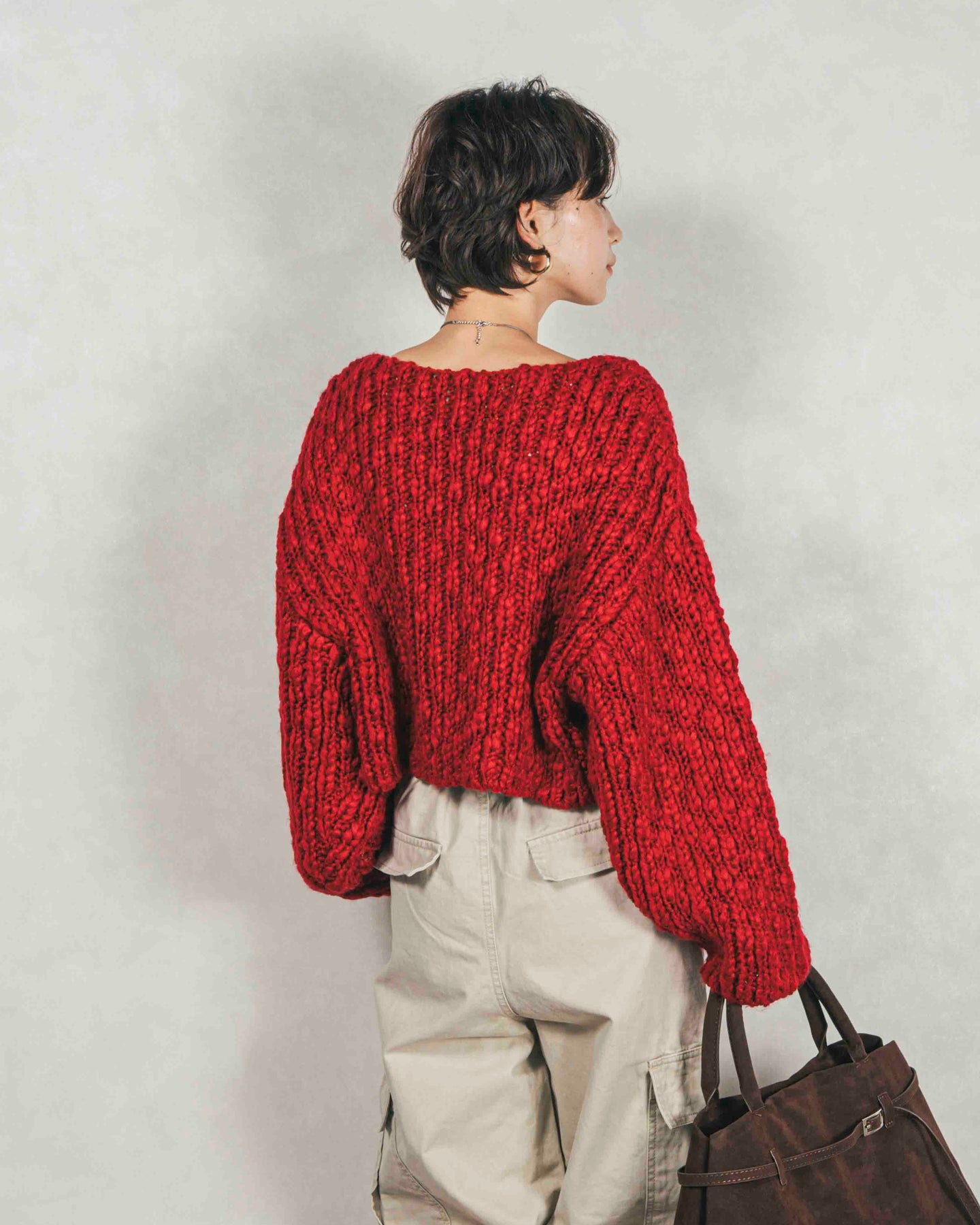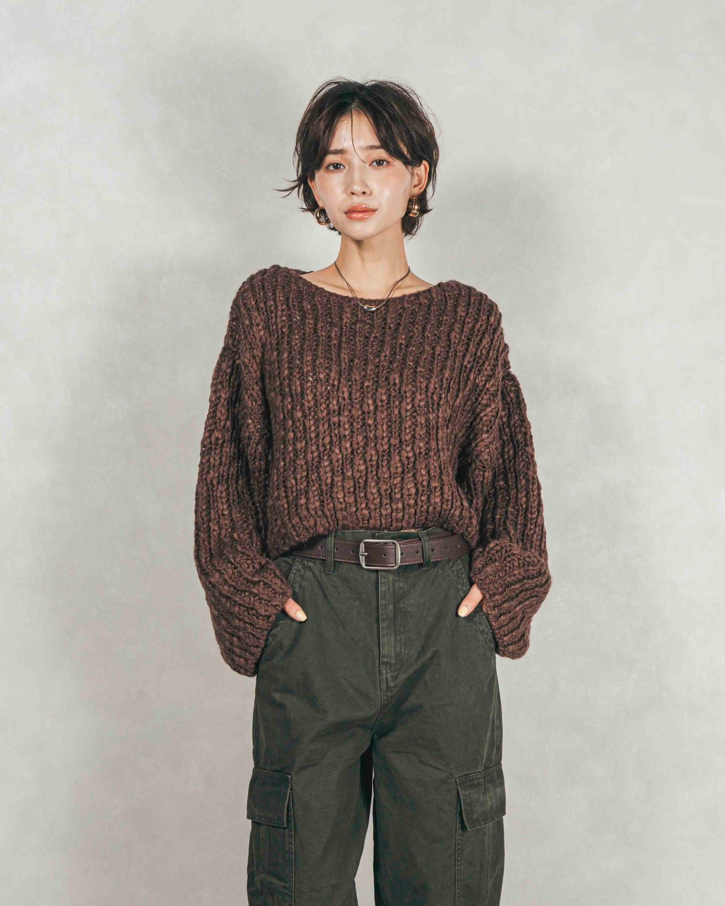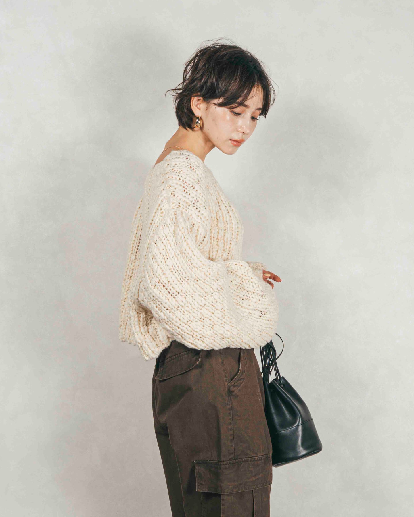 太い毛糸(チャンキーヤーン)をざっくりと編み上げた、厚手でボリュームのあるニットです。印象的な素材感で、ふっくらとしたあたたかみとほどよいボリューム感が魅力。