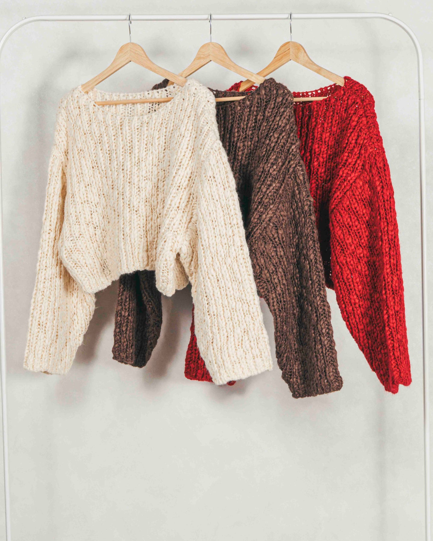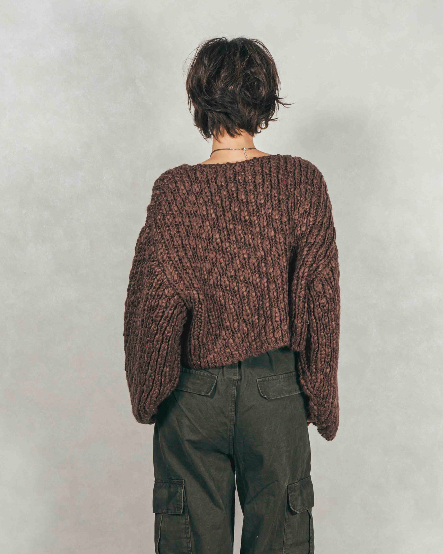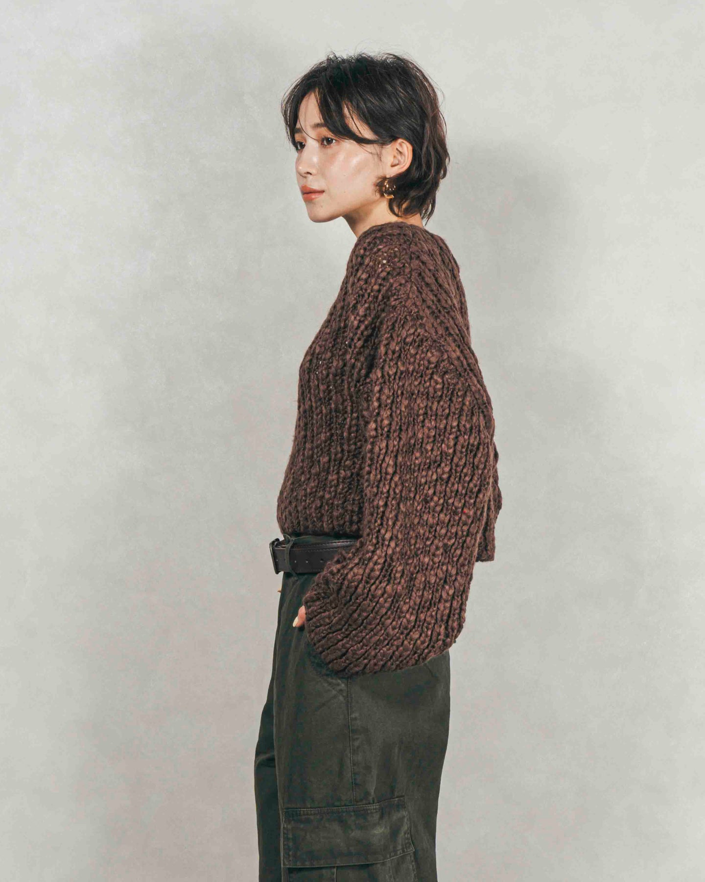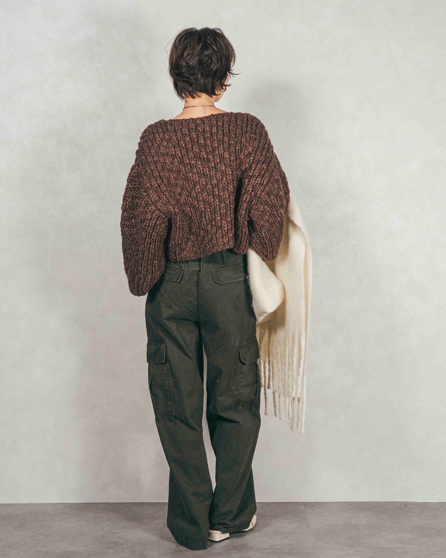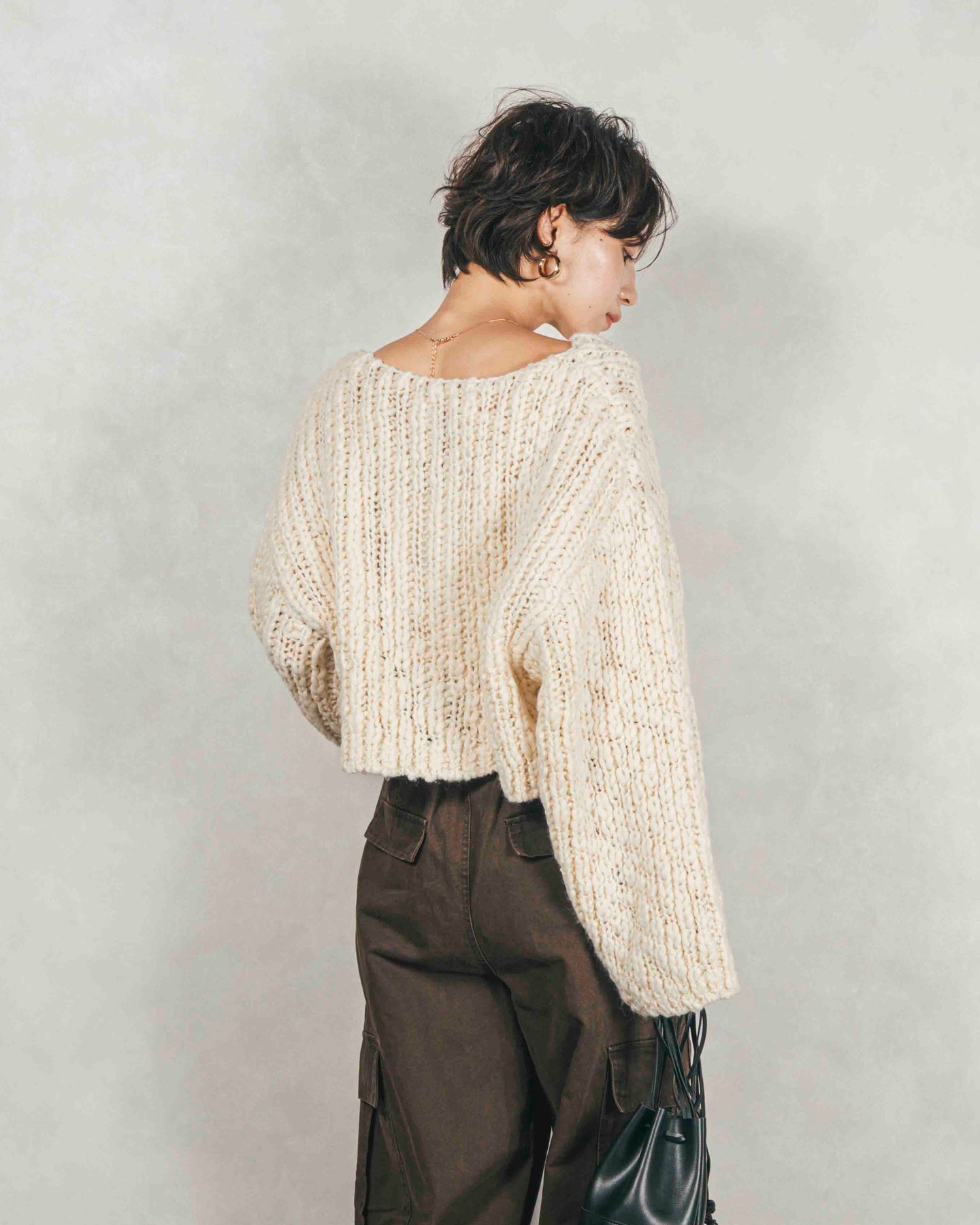 太い毛糸(チャンキーヤーン)をざっくりと編み上げた、厚手でボリュームのあるニットです。印象的な素材感で、ふっくらとしたあたたかみとほどよいボリューム感が魅力。