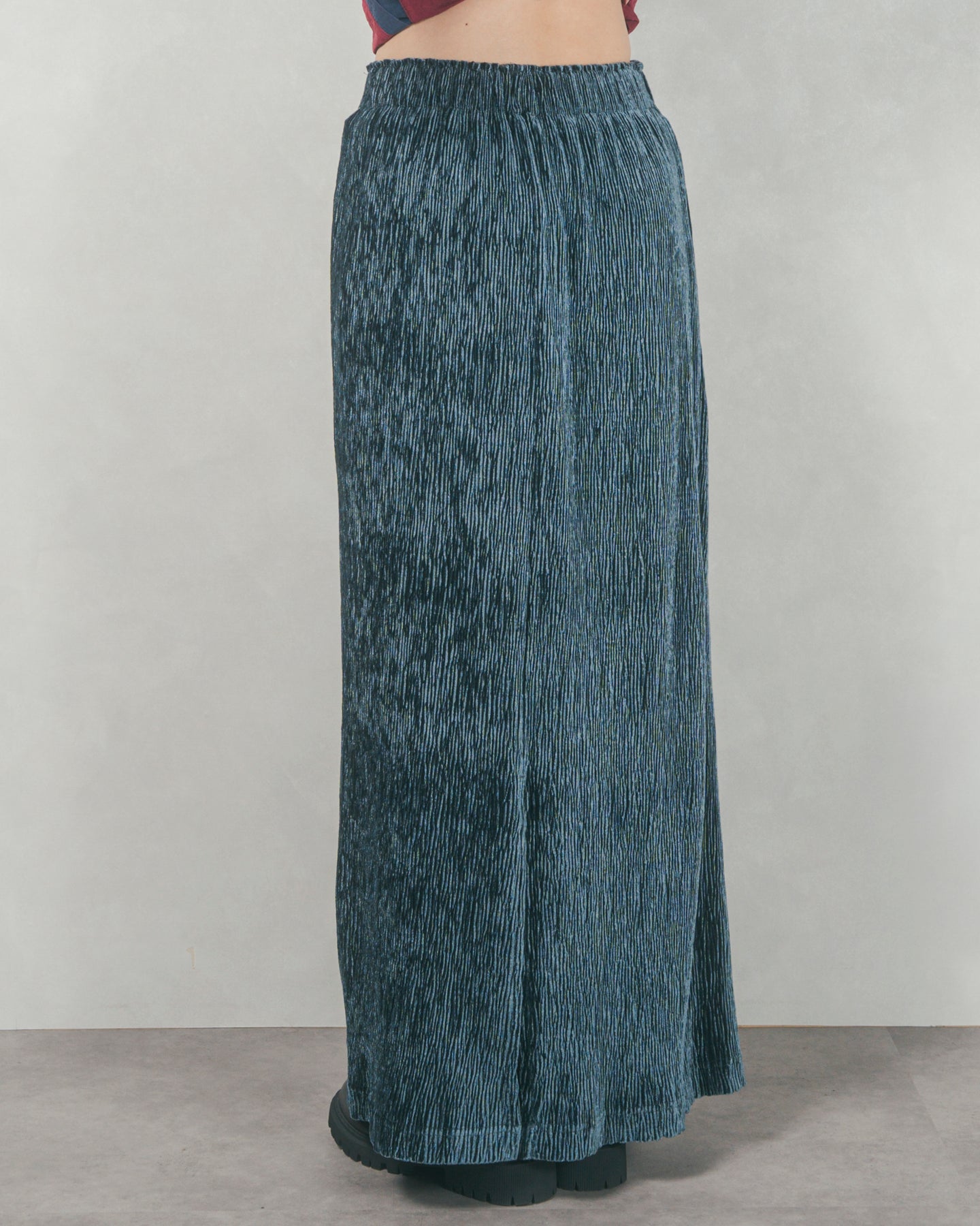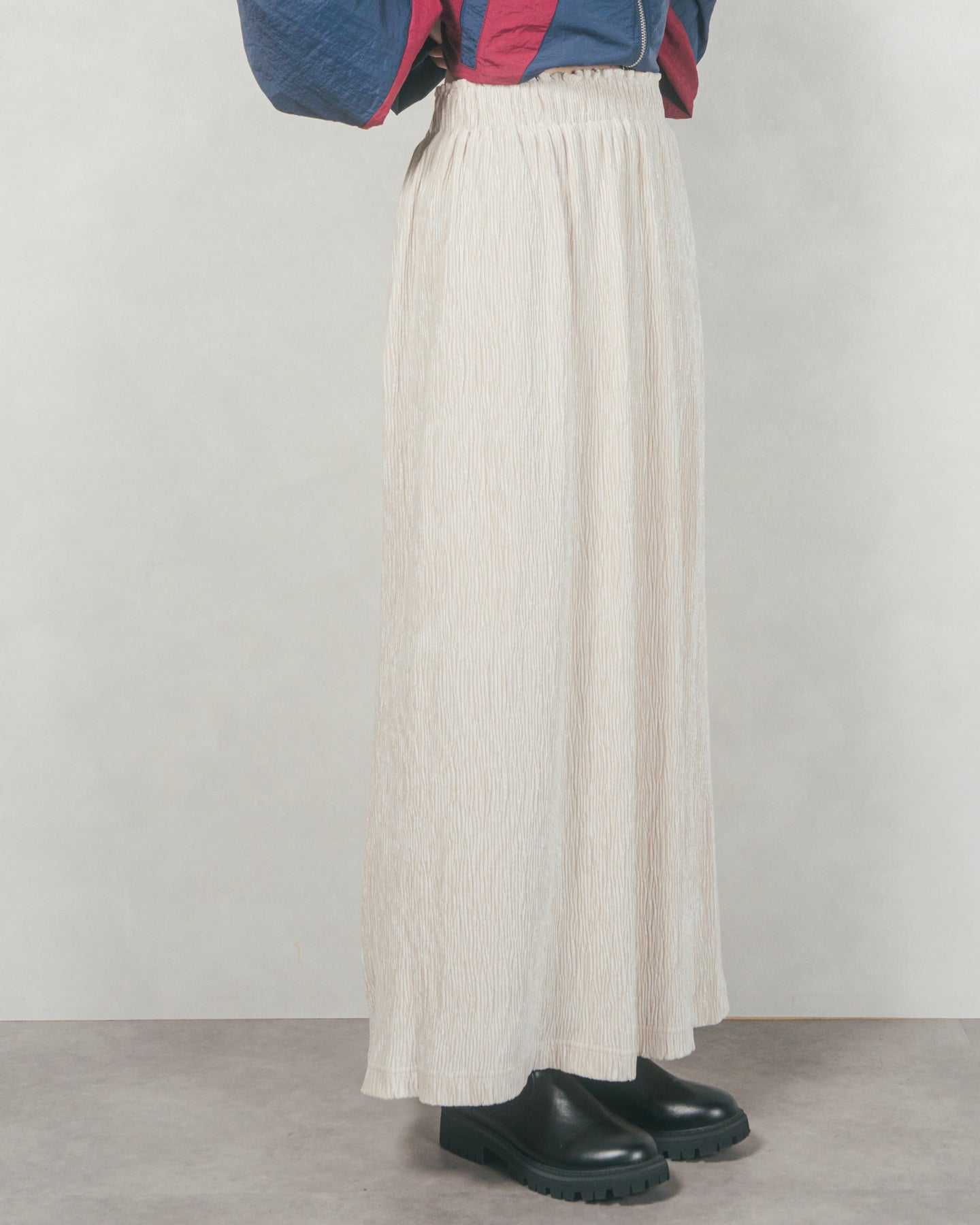 上品さと履きやすさ、どちらも妥協したくない大人のための一枚。光沢感のあるベロア素材に、ランダムプリーツの凹凸感が映えるタイトスカートが登場です。