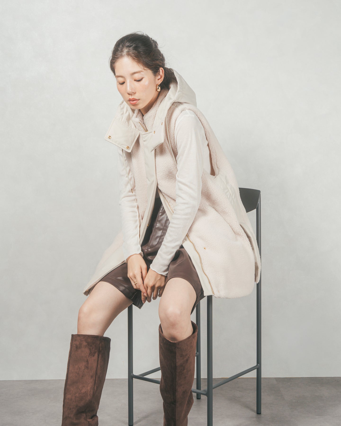 ボアxナイロン フーディーベスト (OFF BEIGE)
