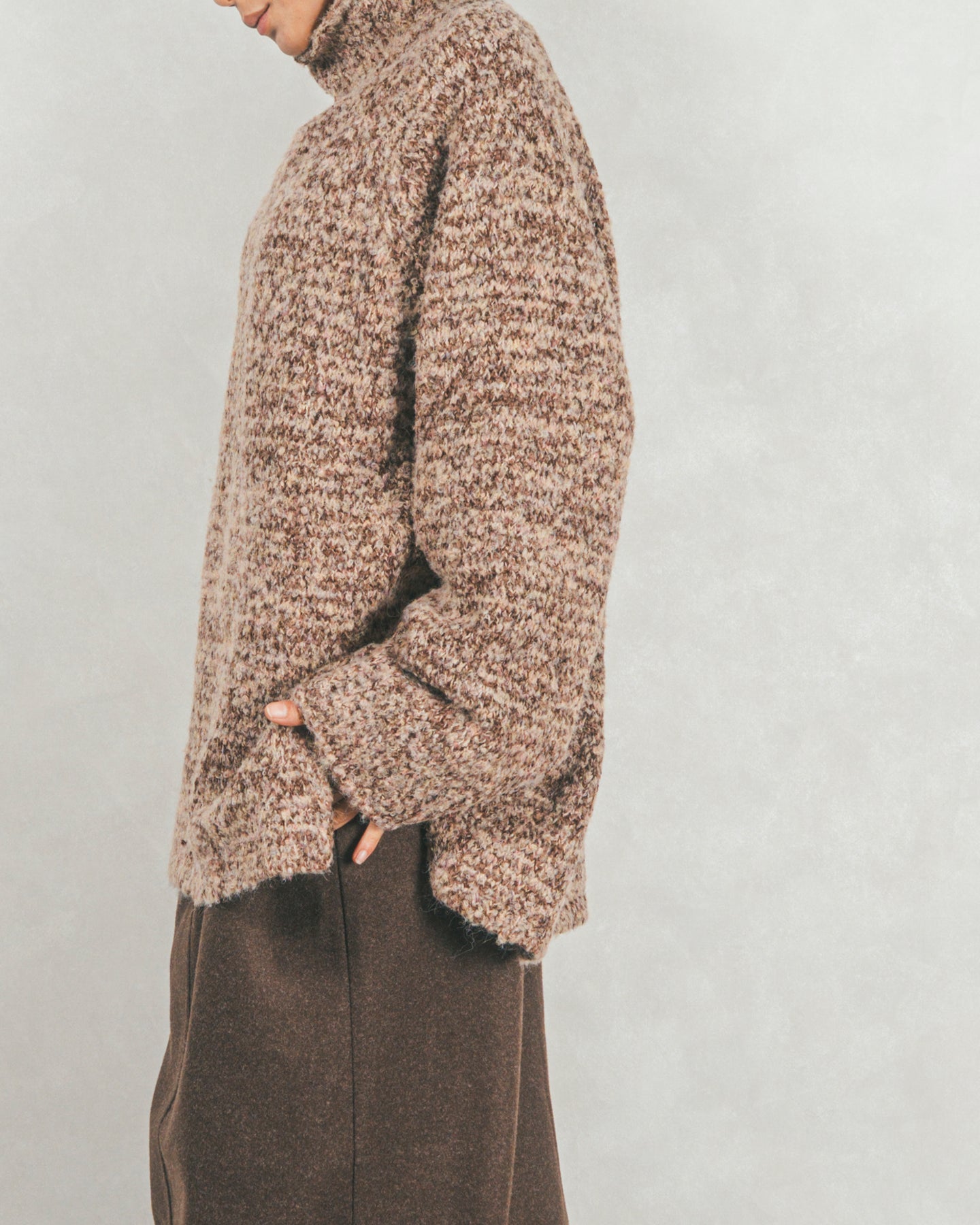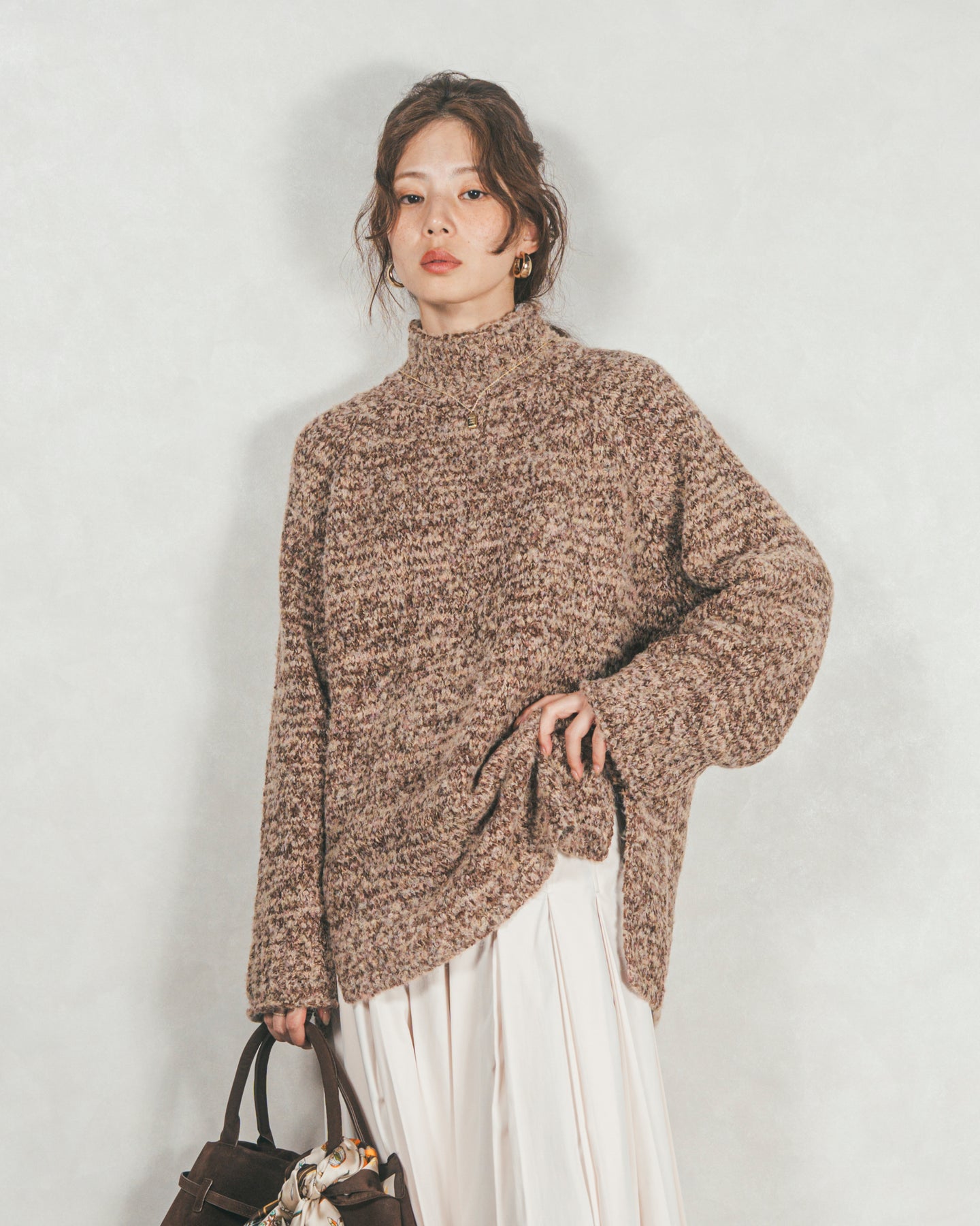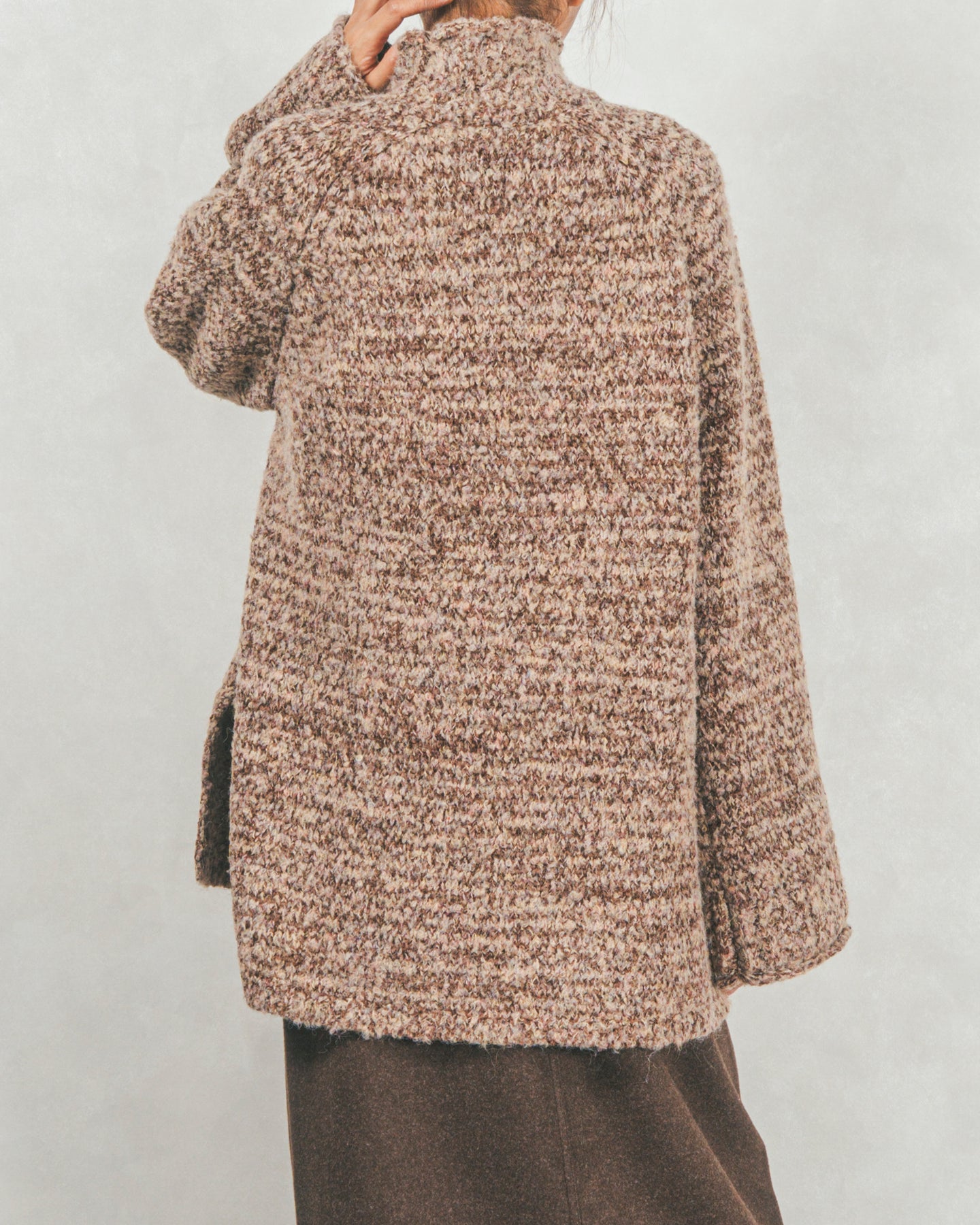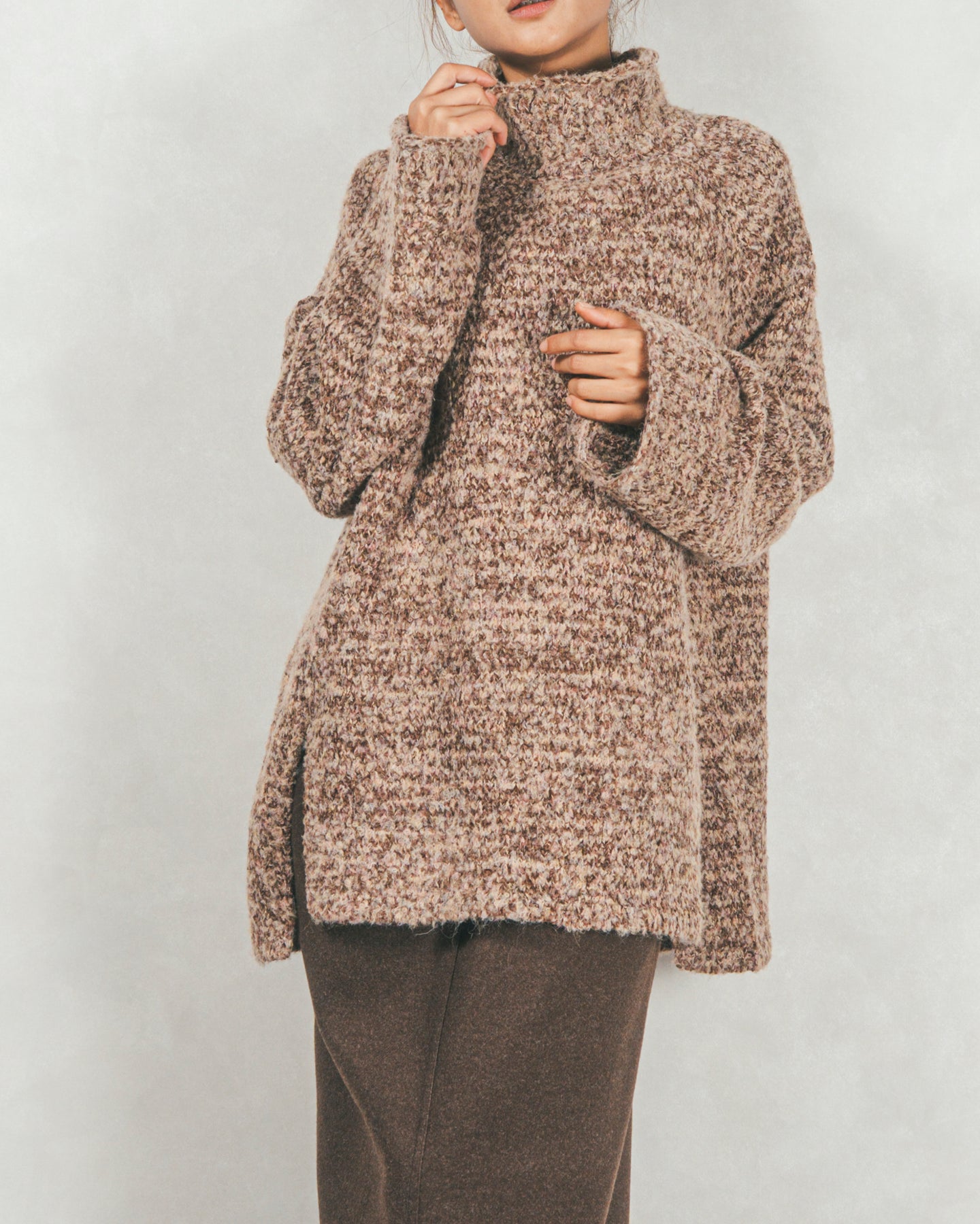 首元をあたたかく包み込むハイネックと、リラックス感のあるオーバーサイズシルエットがかわいいデザイン。特殊な糸をMIXした表情のあるニットで、サイドのスリットが抜け感を演出。