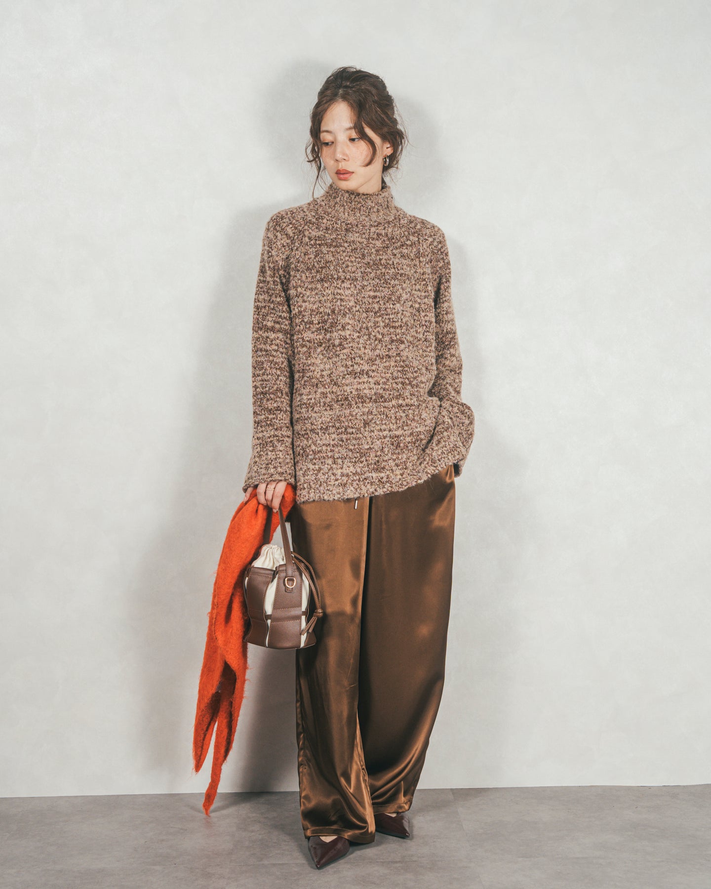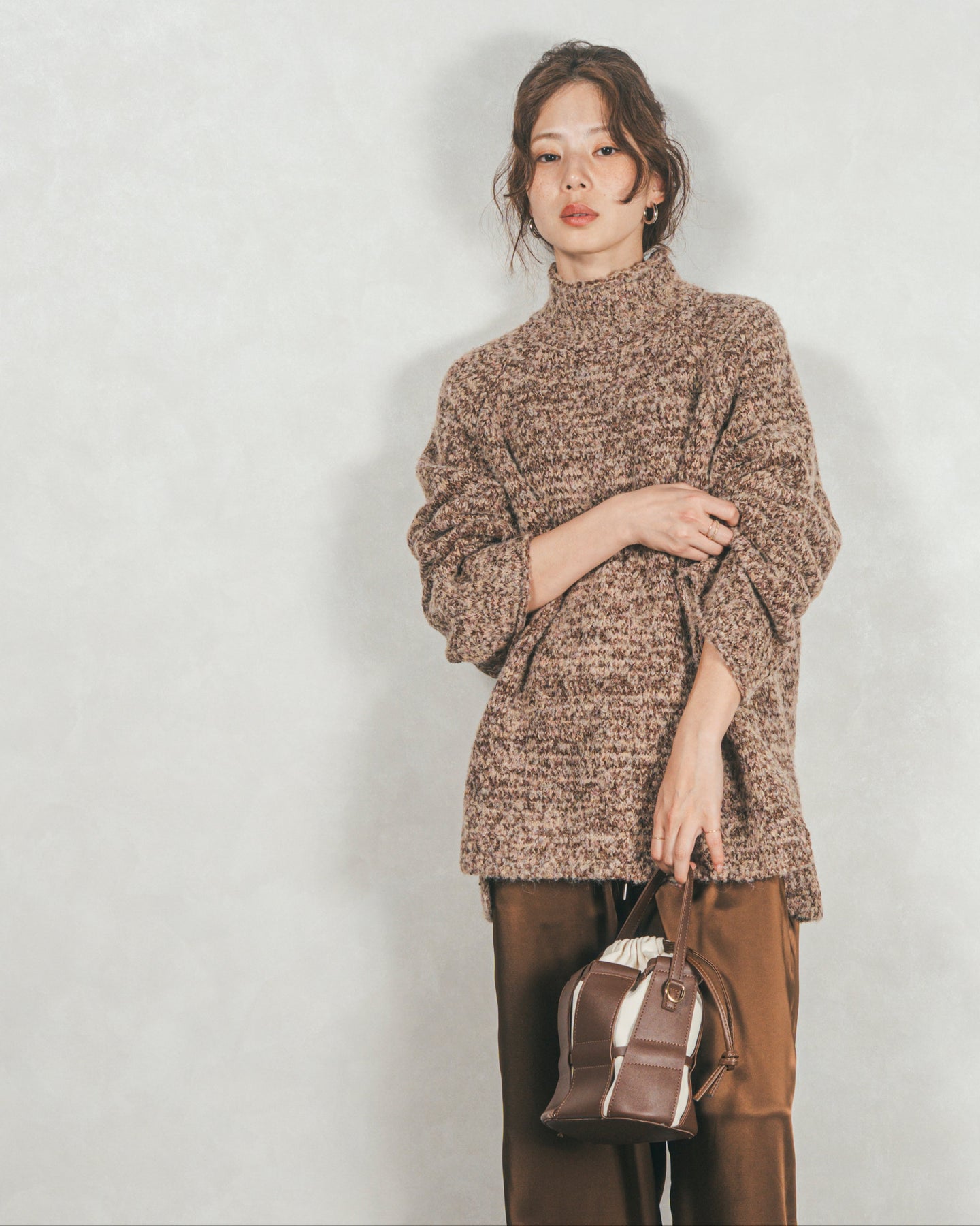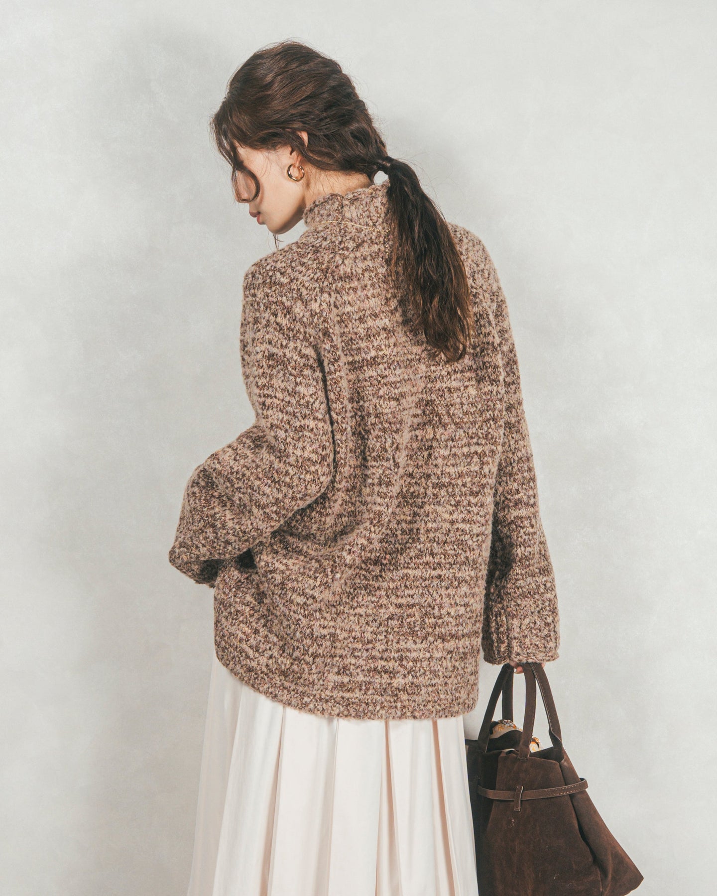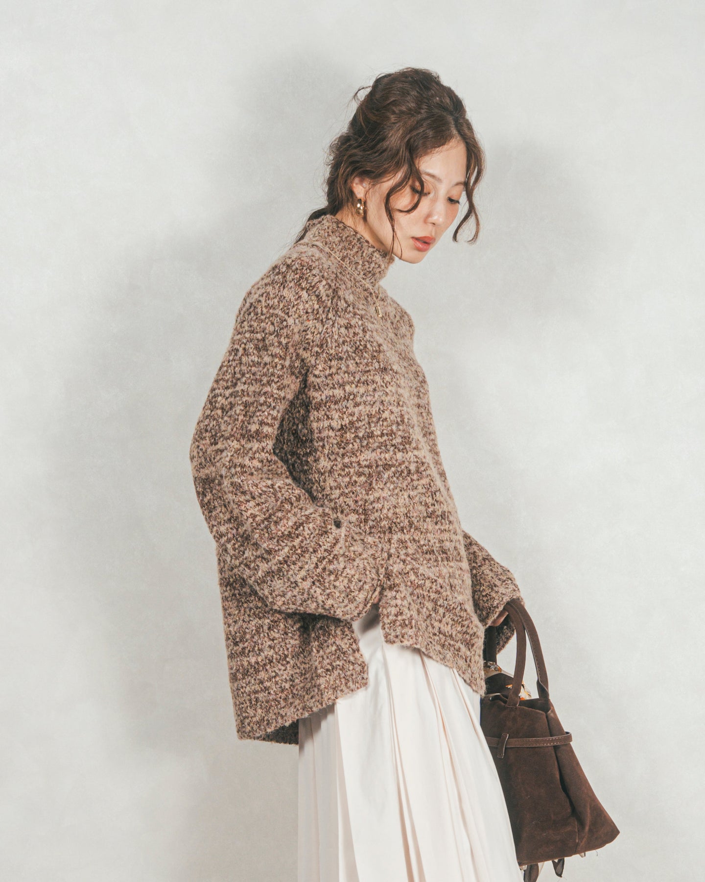 首元をあたたかく包み込むハイネックと、リラックス感のあるオーバーサイズシルエットがかわいいデザイン。特殊な糸をMIXした表情のあるニットで、サイドのスリットが抜け感を演出。