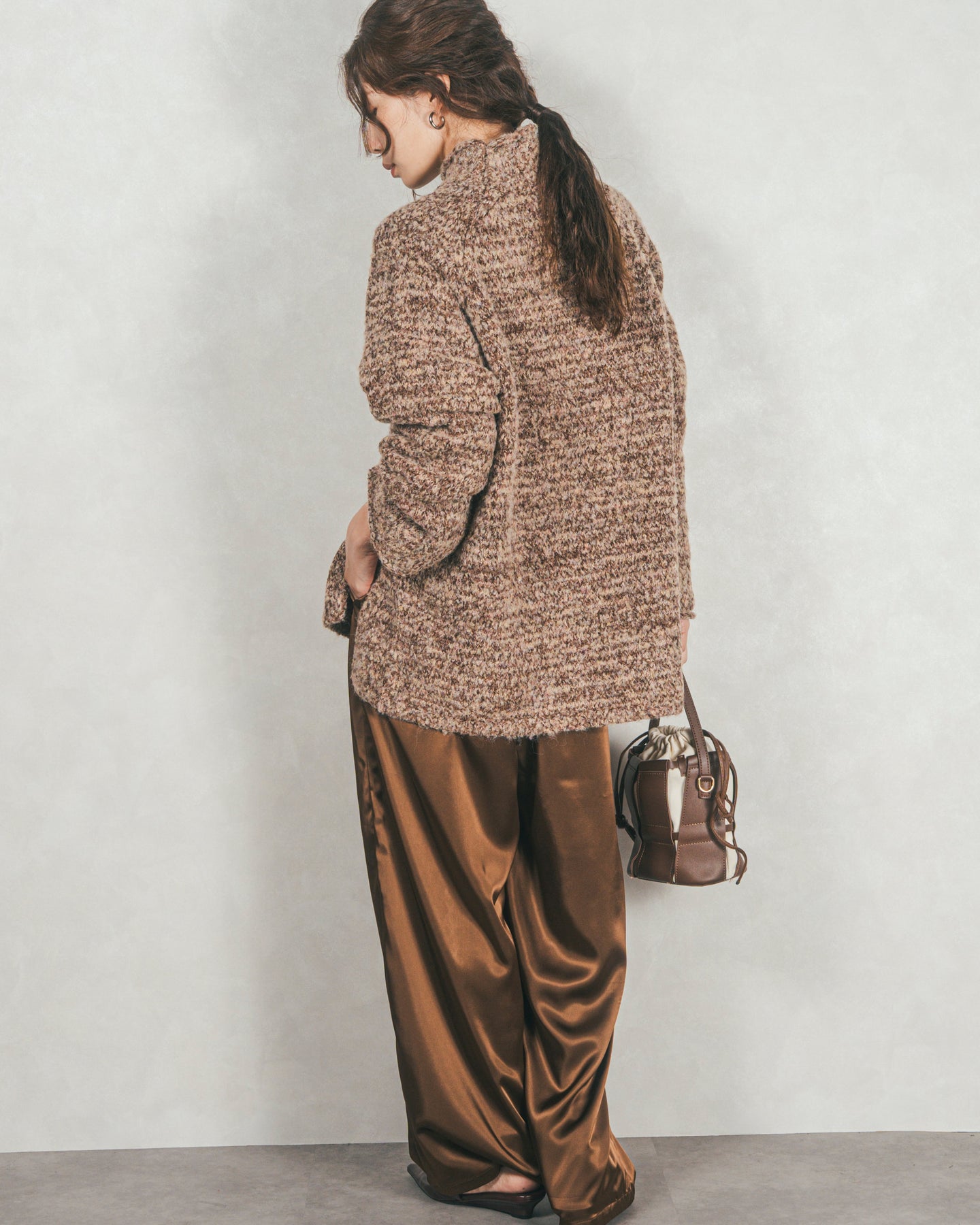 光沢のあるモール糸と、立体感のあるブークレ糸をMIXさせたニット素材。
