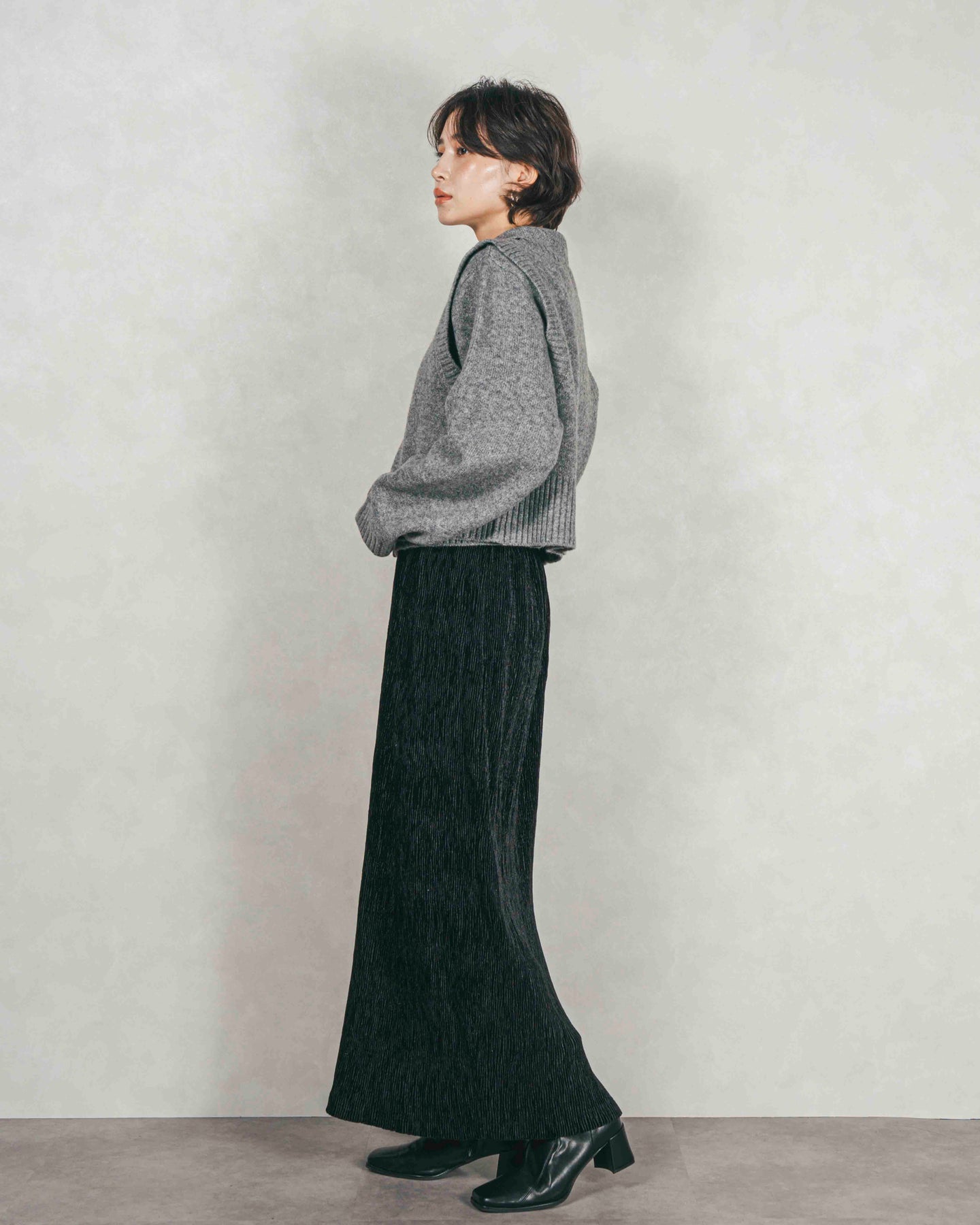 複数の色糸が混ざり合ったメランジニット素材。ふっくらと温かみのある表情豊かな風合いが魅力です。柔らかな肌触りで、快適な着ごこち。